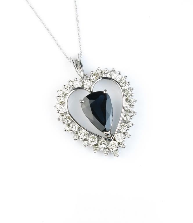 Exquisite heart design necklace featuring a large blue Sapphire weighing approx. 5.00-6.00 carats and surrounded forty round diamonds weighing approx. 3.00 carats of H-I colors and SI clarity set in 14 karat whitegold setting. Retail $5,000-$7,000 Estimates $2,000-$3,000