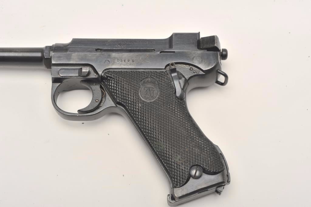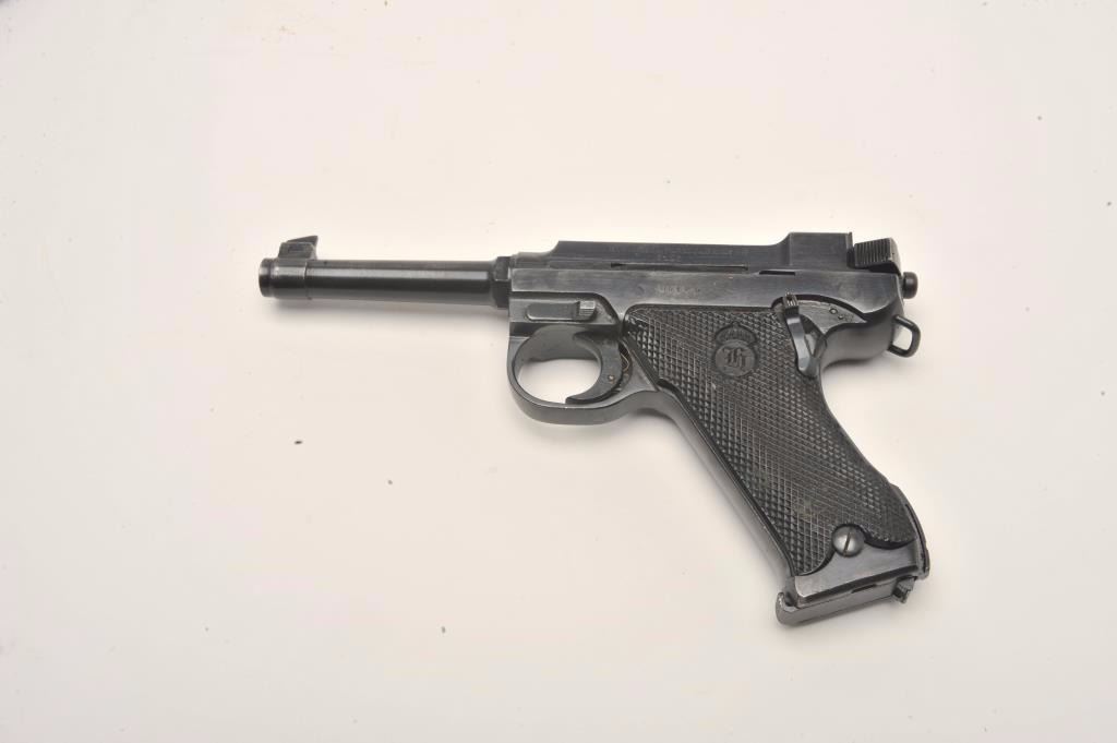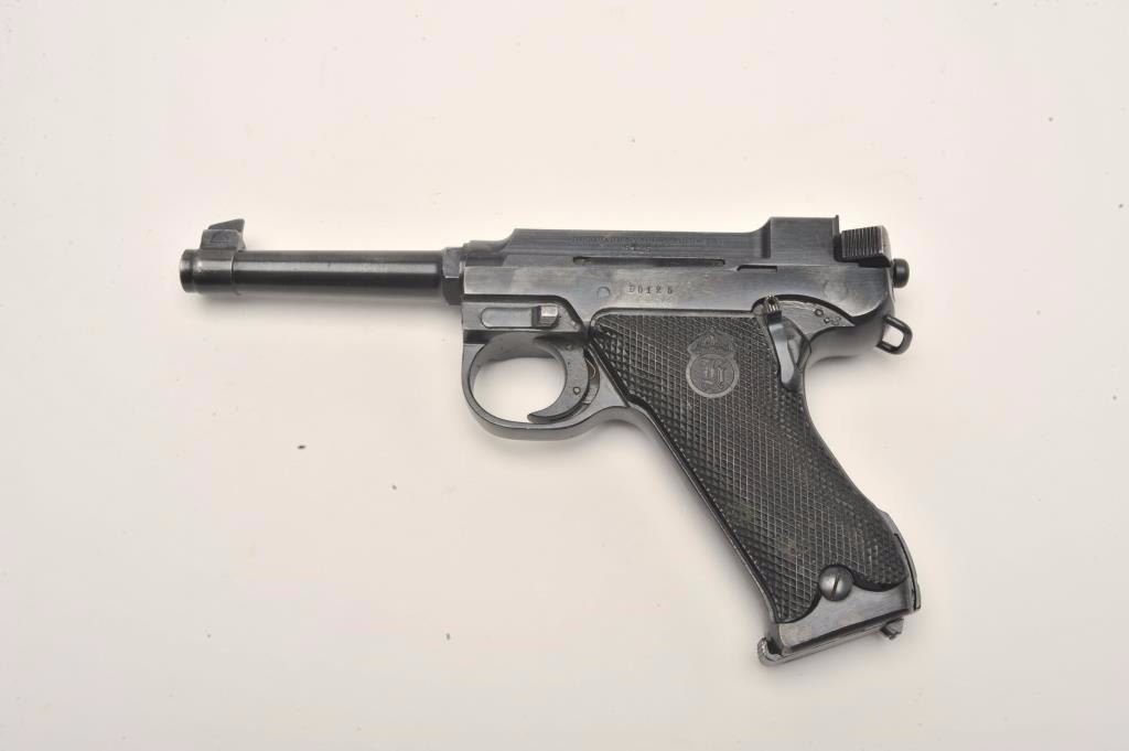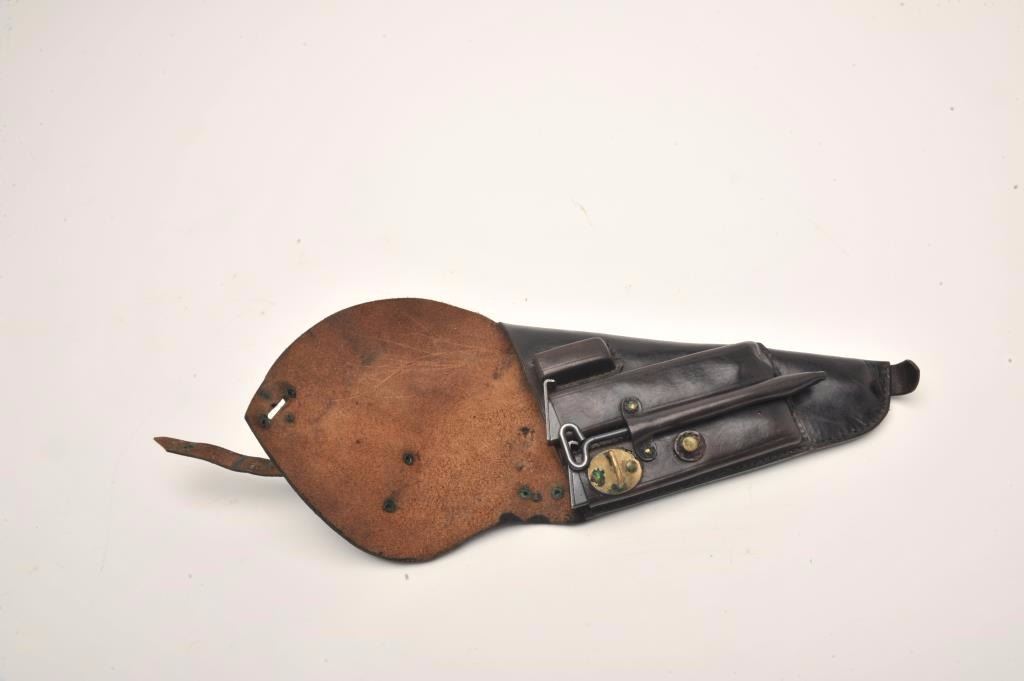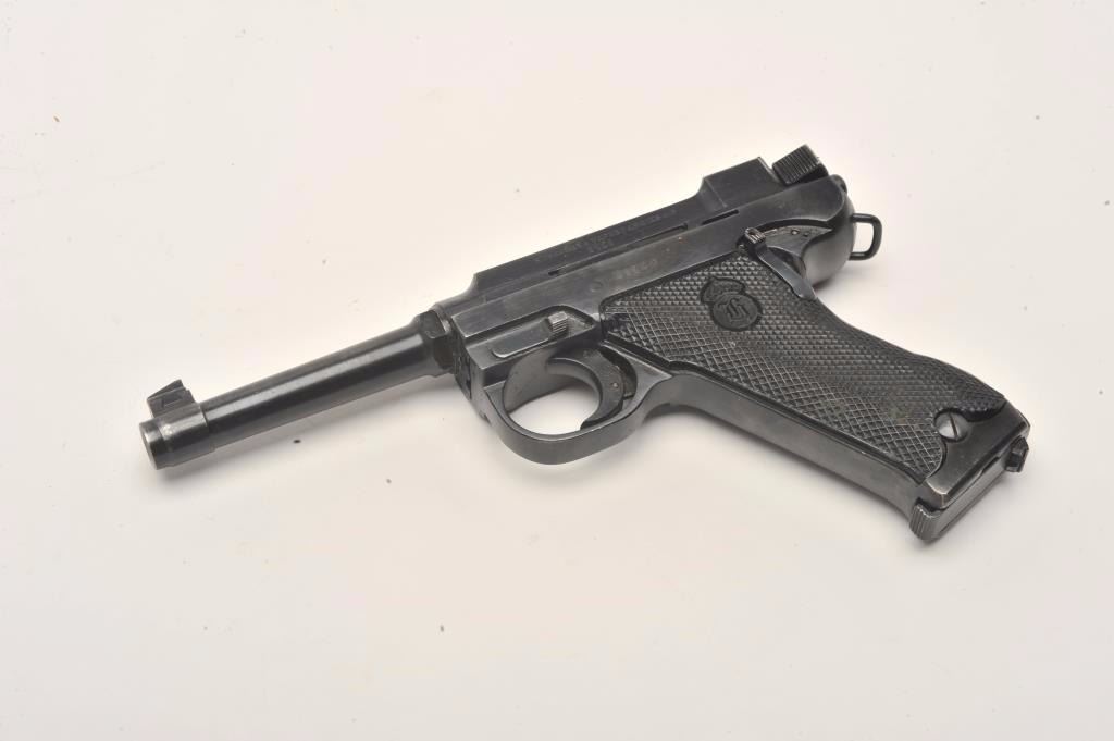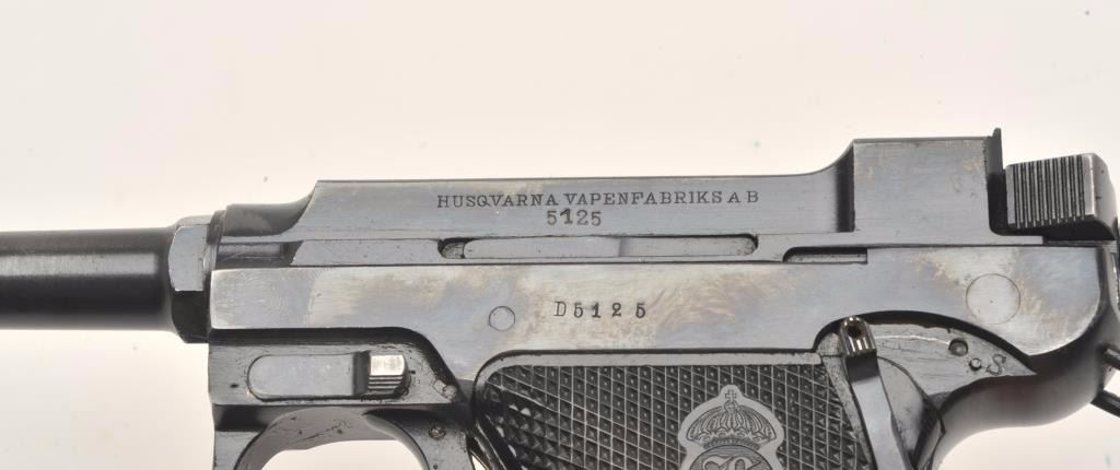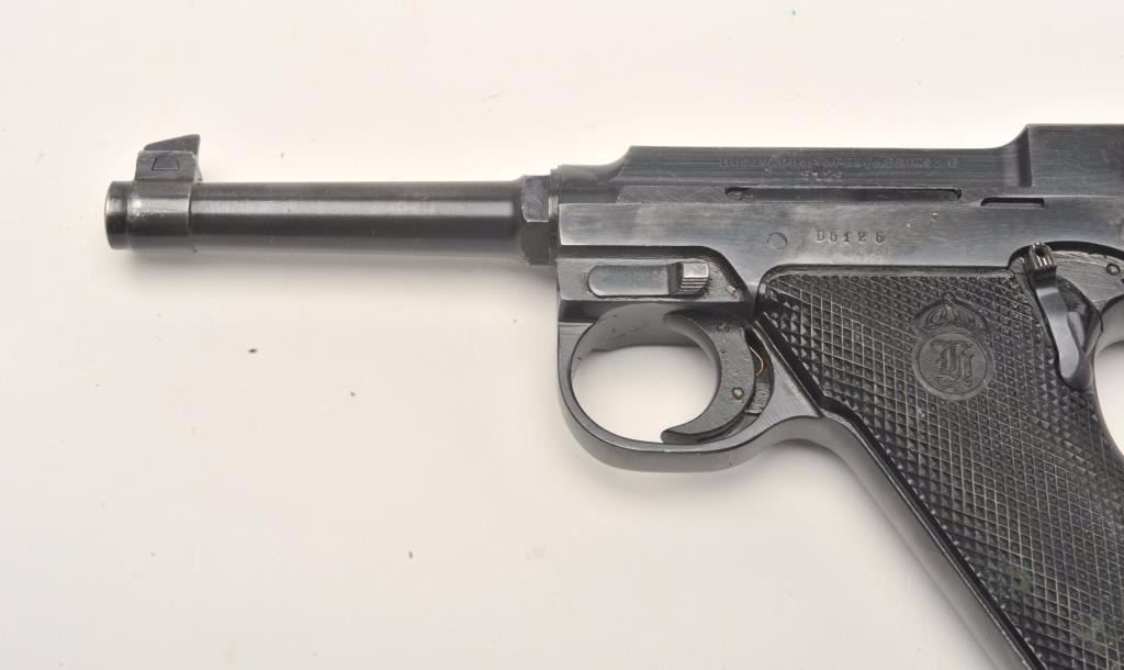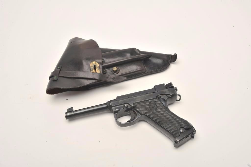 Lahti Model 40 semi-automatic pistol, 9mm caliber, 4.75” barrel, blued finish, checkered black plastic grips, S/N D5125 in overall very good to near fine condition showing the majority of its original finish,fine bore, crisp action and markings, very good grips; accompanied by a brown leather military style flap holster with two extra magazines and tools. (C&R/PPT). Est.: $800-$1,600.