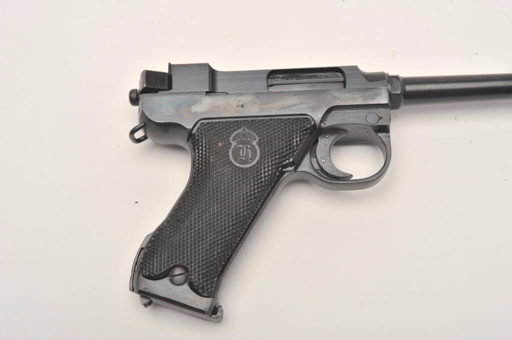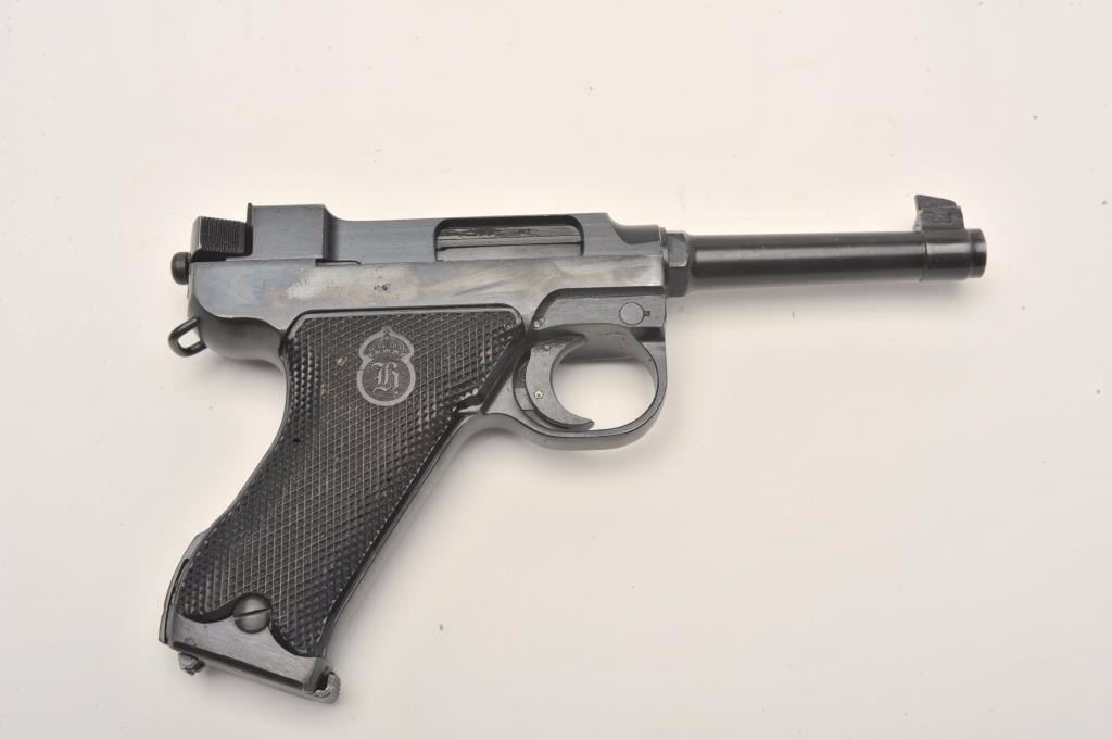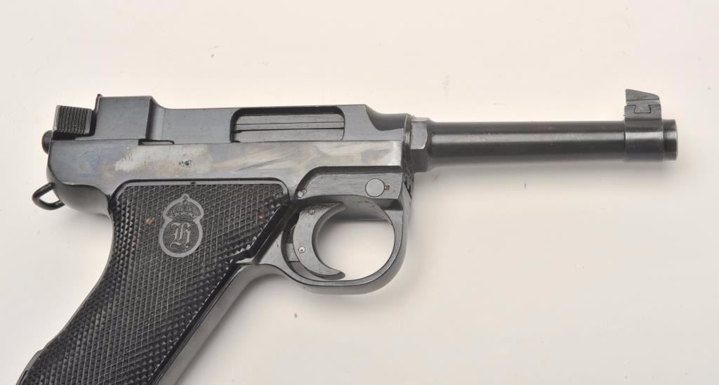 Lot 228 Lahti Model 40 semi-automatic pistol, 9mm caliber, 4.75” barrel, blued finish, checkered black pla