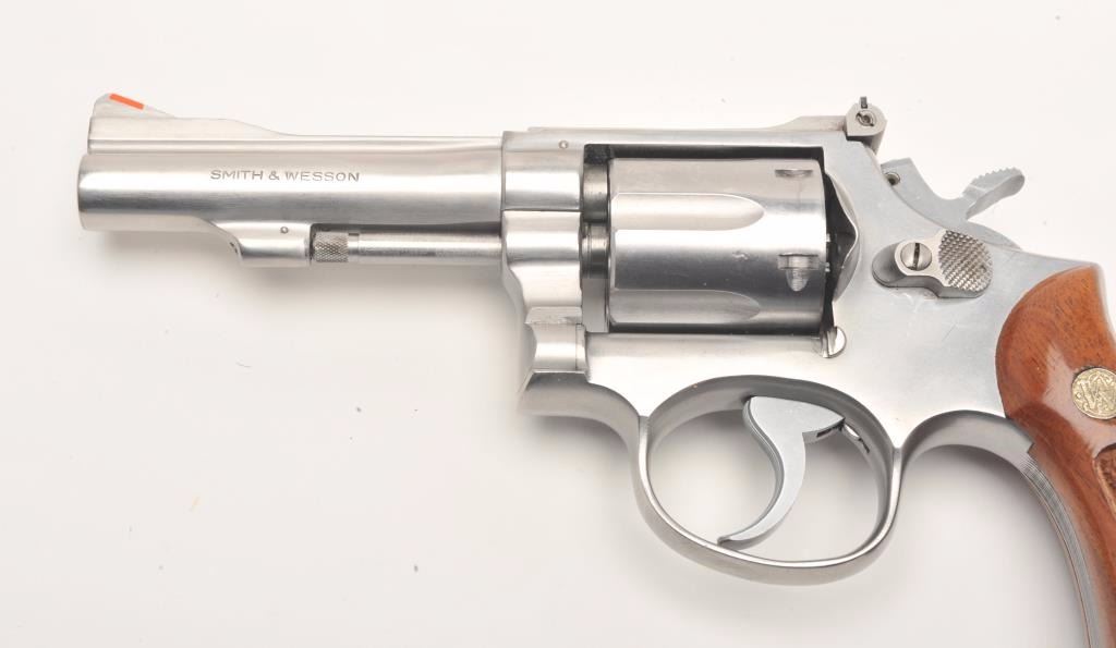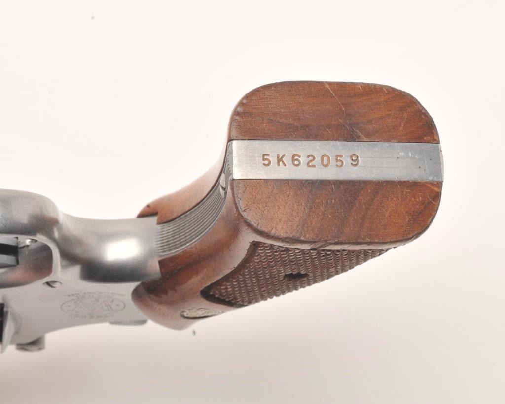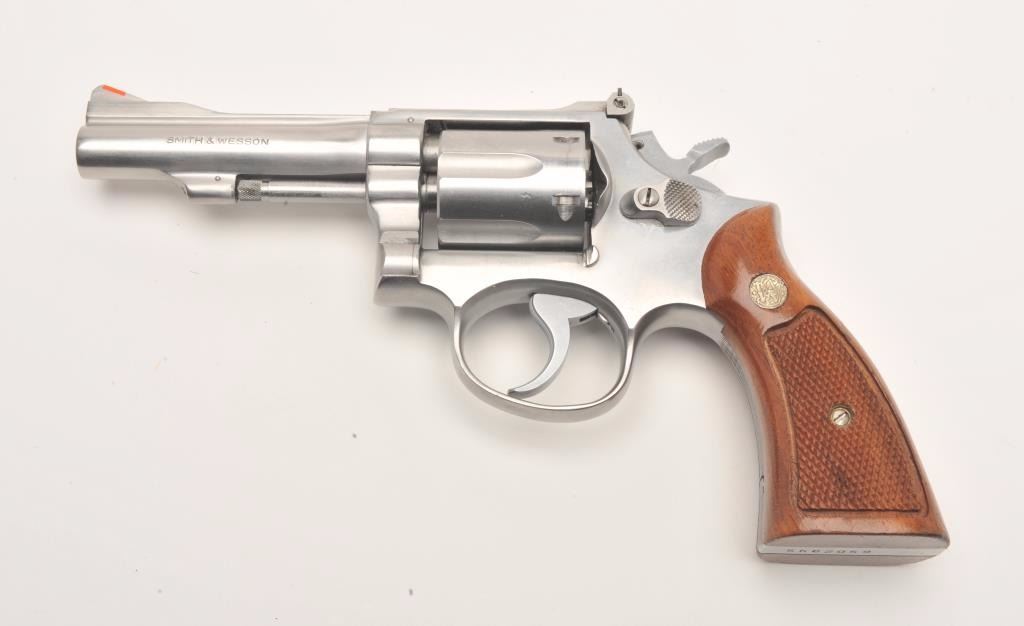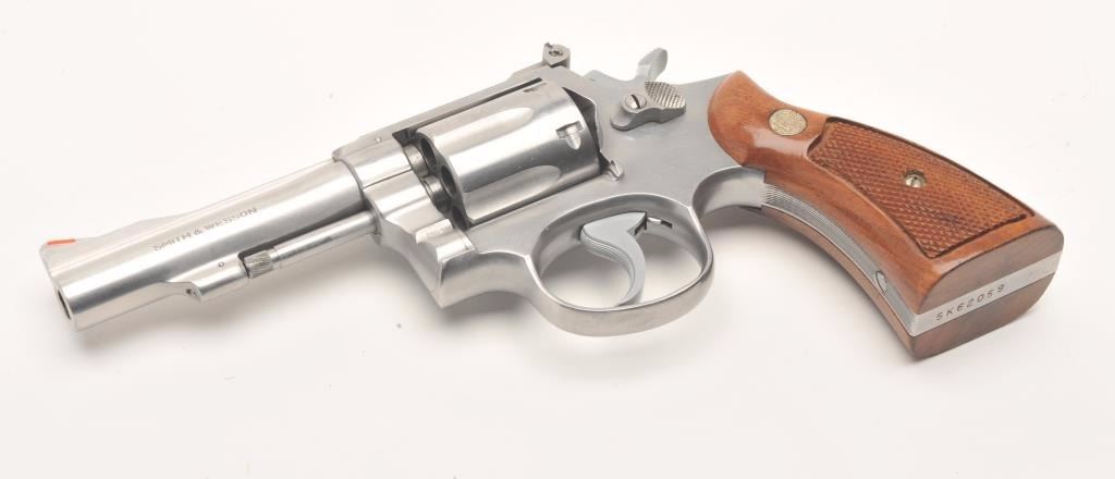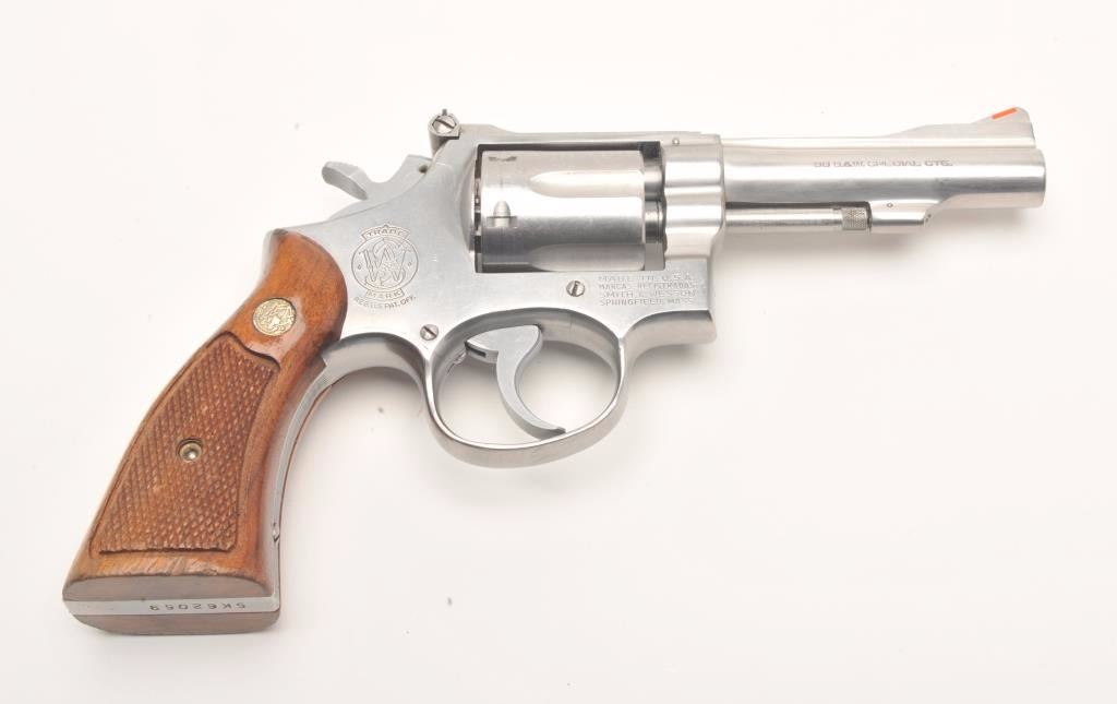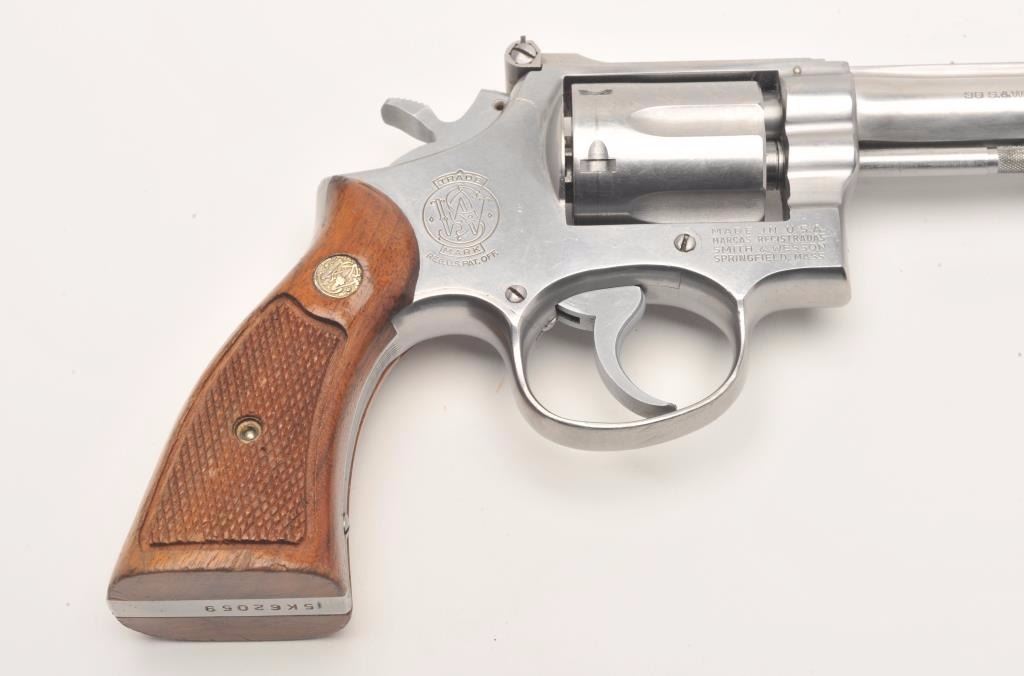 Smith & Wesson Model 67 DA revolver, .38 S&W Special caliber, 4” barrel, stainless, checkered wood medallion grips, S/N 5K62059, in overall fine condition showing little use; action is tight, possibly from long storageand dried grease. (Modern/PPT). Est.: $600-$1,200.