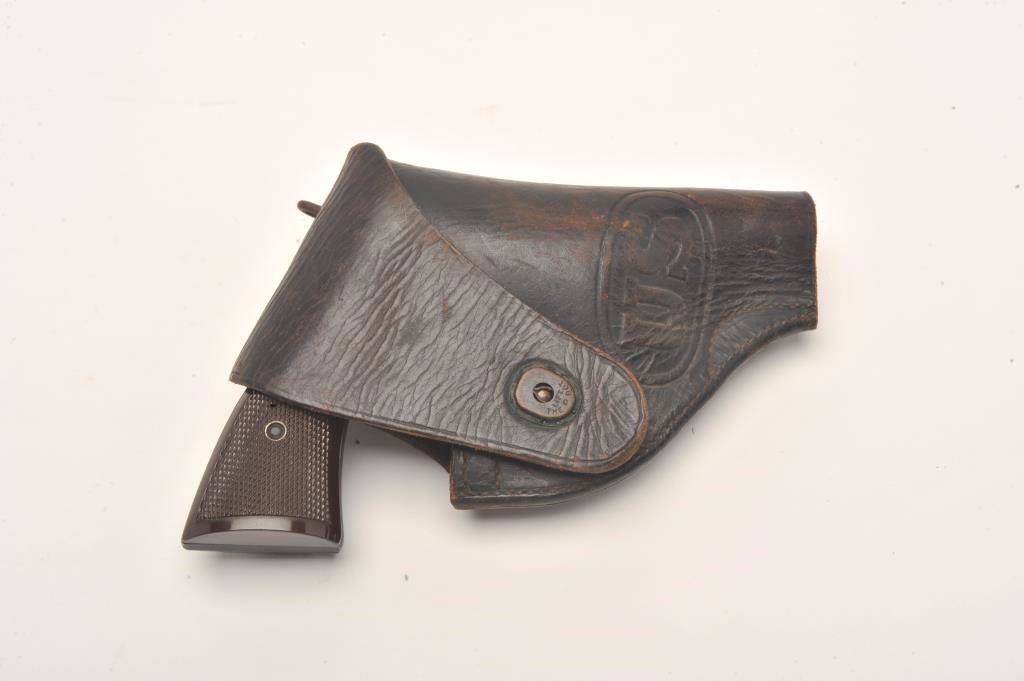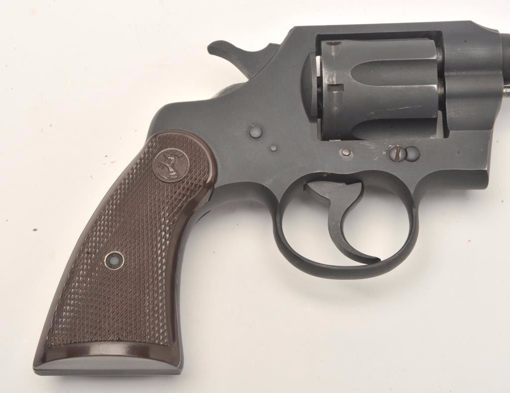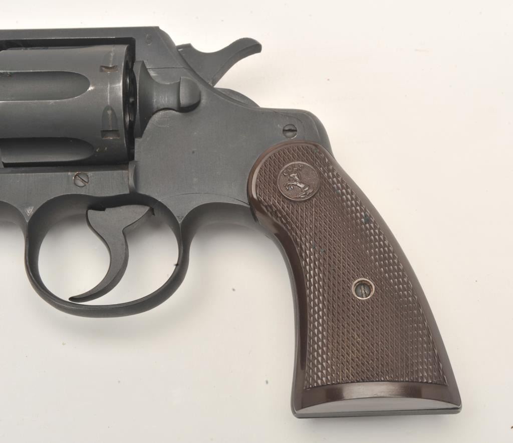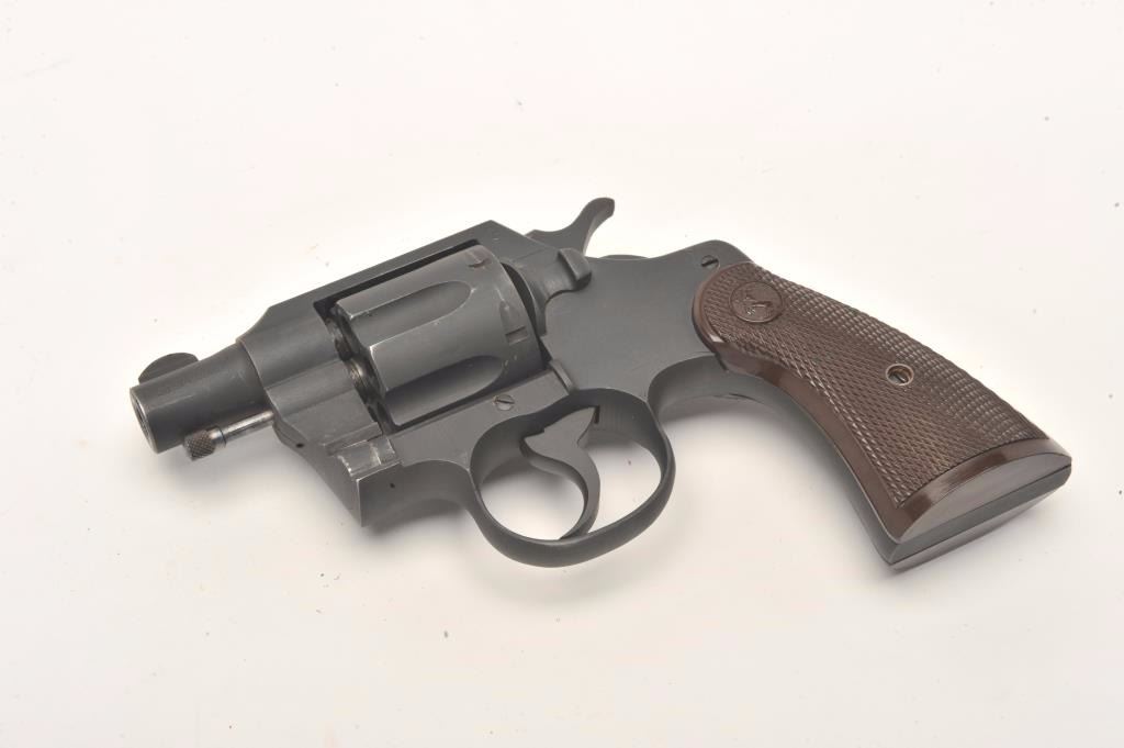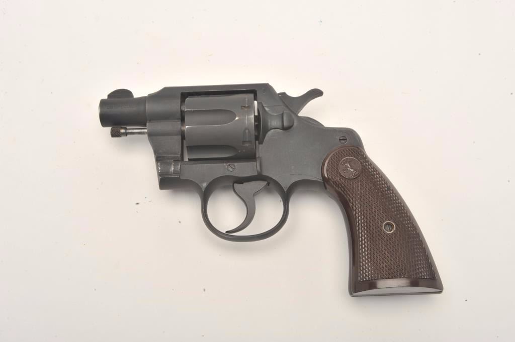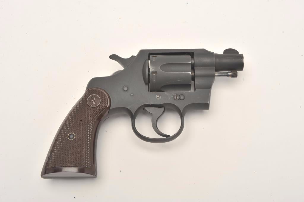 Colt Commando Model DA revolver, flaming bomb proofed, .38 Special caliber, 2” barrel, parkerized grey finish, checkered maroon plastic grips, S/N 17266, in overall fine condition displaying the majority of itsmilitary finish, crisp action, sharp markings, fine bore and grips; accompanied by a cut-down U.S. military flap holster. (C&R/PPT). Est.: $700-$1,400.