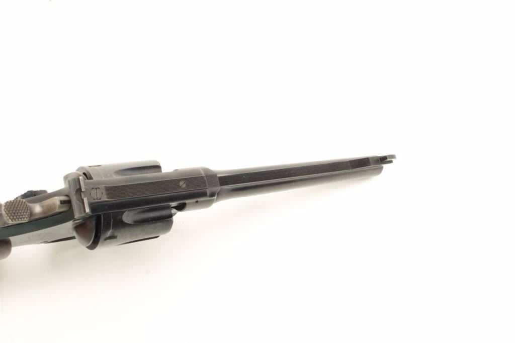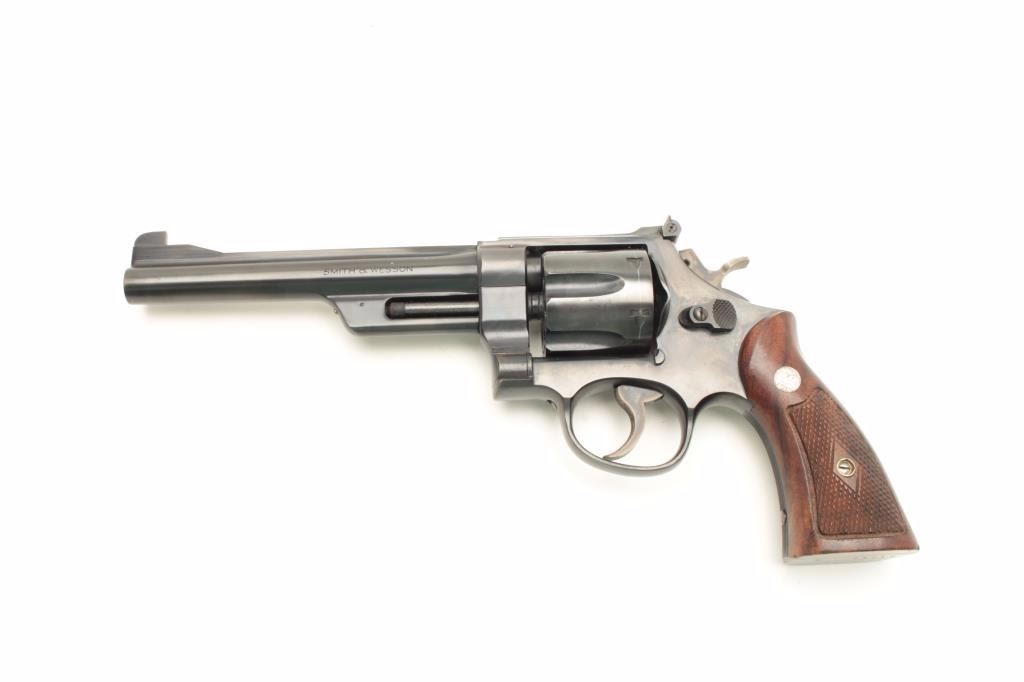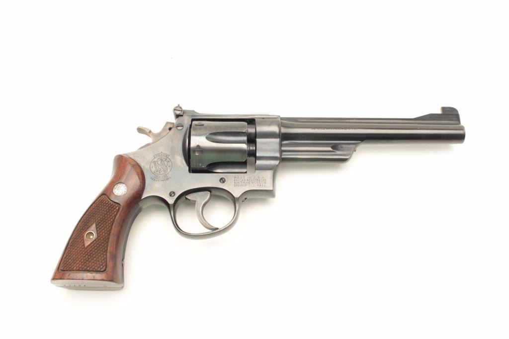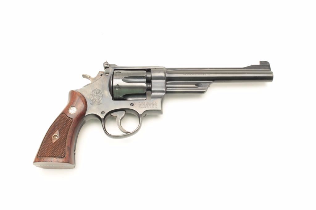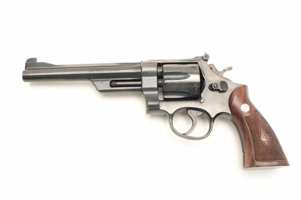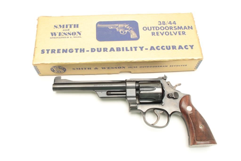 Smith and Wesson Model 38-44 Outdoorsman 3rd Model revolver, .38 S&W Special caliber, Serial #S-78716. The pistol is in nearly excellent condition with a 6 1/2” barrel with full-length rib and adjustable rear sight.The pistol retains approximately 98% of its blue finish with light wear at the muzzle and a faint drag line on the cylinder. The hammer and trigger display beautiful, vivid case hardening. The medallion wood grips are in very good condition showing only light handling marks. The bore is very good, the action crisp and markings are sharp. The pistol retains its matching gold S&W box with all associated packing material. The lotfurther includes a Smith and Wesson factory letter confirming the features as described and indicating the pistol was shipped to the George Cake Co., Berkeley, CA, on March 29, 1951. When model numbers were assigned, this revolver was given the designation of Model 23. From the Estate of Larry Gaertner. Est.: $900-$1,800. (C+R)