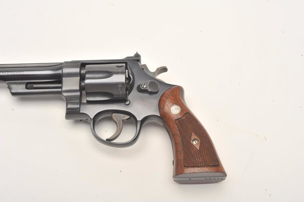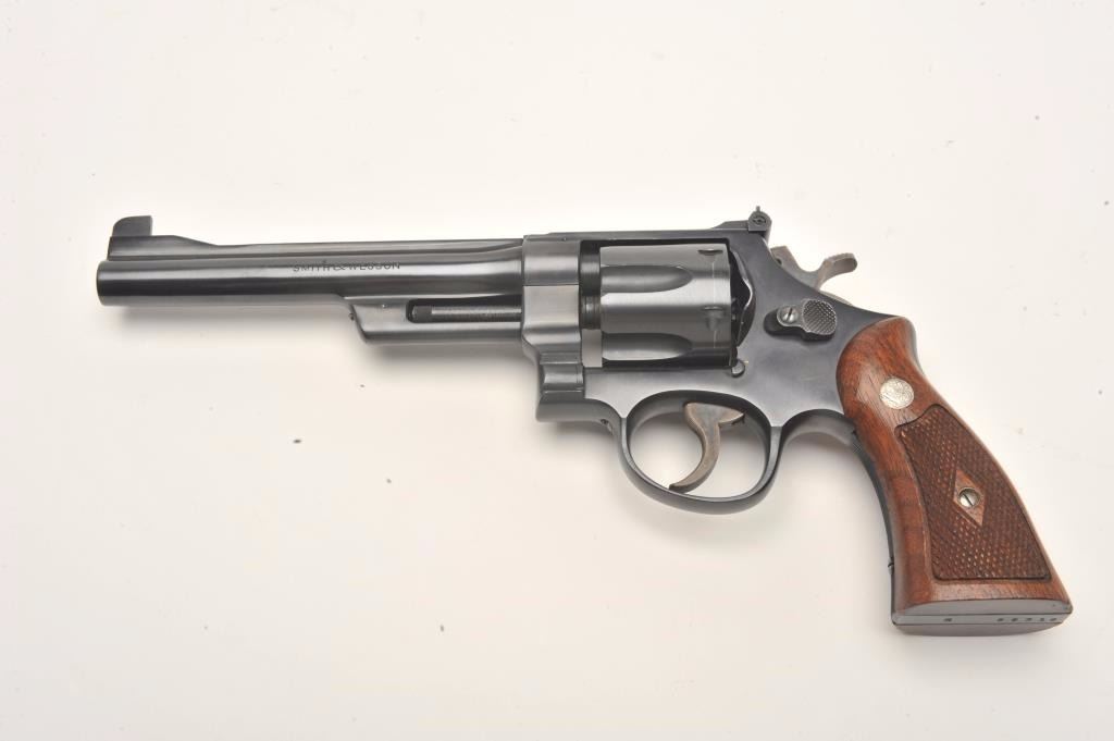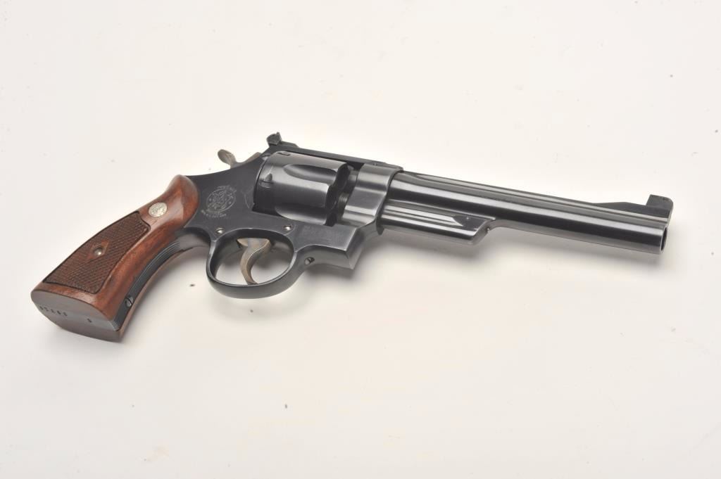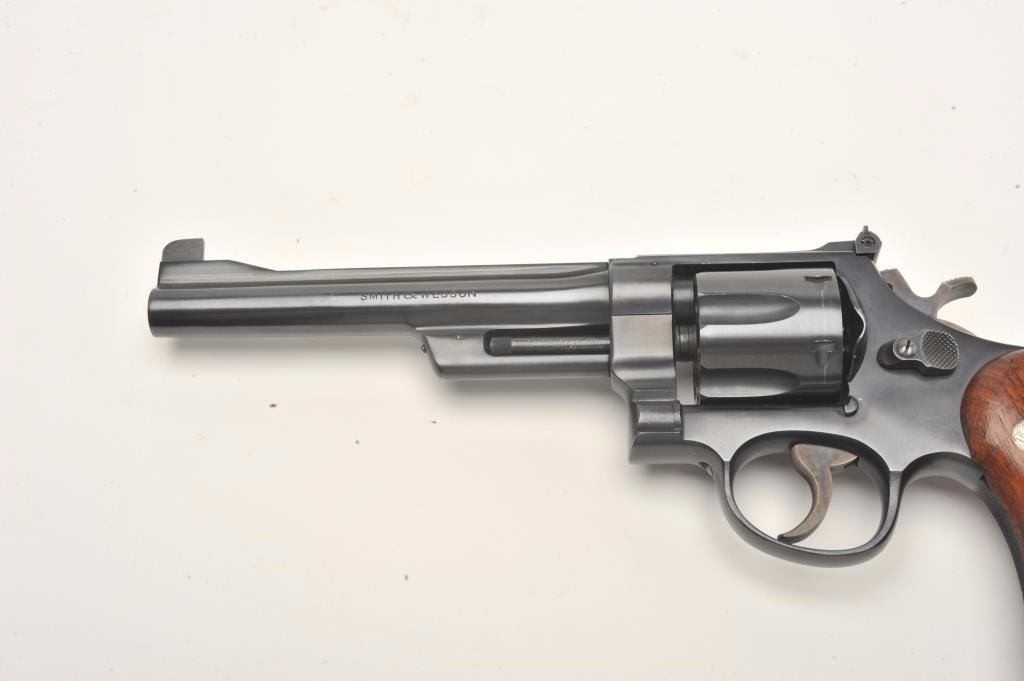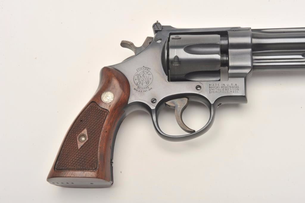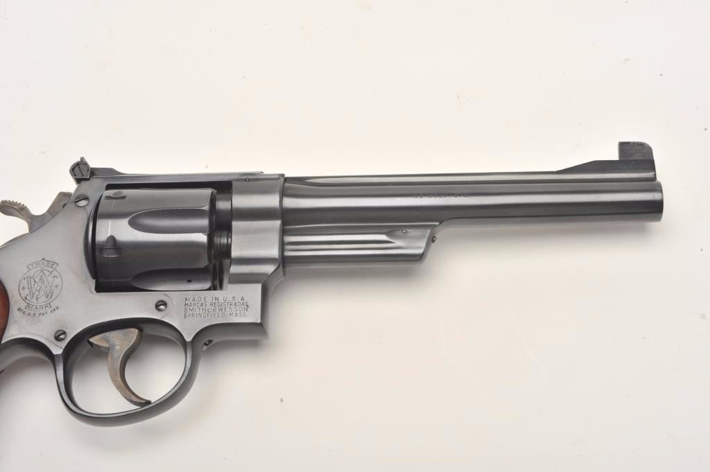 Smith and Wesson Model 1950 Hand Ejector Target revolver, .45 Colt caliber, Serial #S-99310. The pistol is in nearly excellent overall condition with a 6 ½” barrel. The pistol retains approximately 98% of its satin blue finish with light wear at the muzzle and a faint drag line on the cylinder. The hammer and trigger display beautiful, vivid case hardening. The medallion wood Magna grips are in very good condition showing only light storage and handling marks. The bore is very good, the action crisp and markings are sharp. The lot includes a Smith and Wesson factory letter confirming the features as described and indicating the pistol wasshipped to H. H. Harris & Co., Chicago, Illinois on June 3, 1954. The consignor’s notes indicate that only 200 pistols were produced in this configuration. From the estate of Larry Gaertner. Est.:$1,000-$2,000. (C+R)