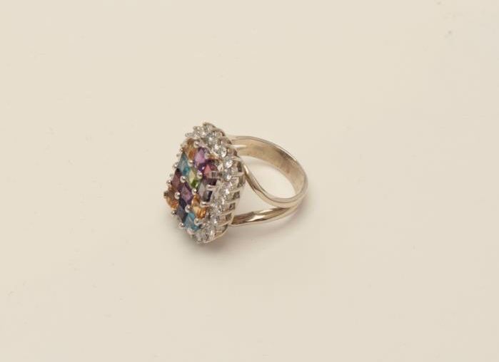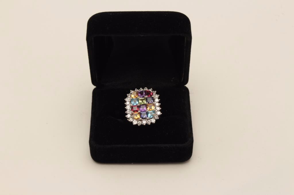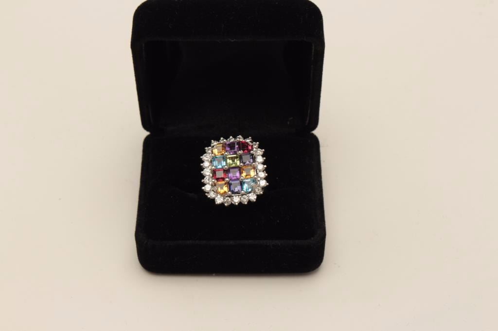 One designer ring in 14k white gold set with princess cut s gemstones including (amethyst,topaz,garnet, peridot etc.) surrounded by G VS1 diamonds weighing 1.25ct. EST.$2,000-2,500