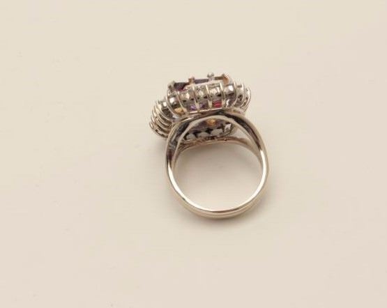 Lot 239 One designer ring in 14k white gold set with princess cut s gemstones including (amethyst,topaz,ga
