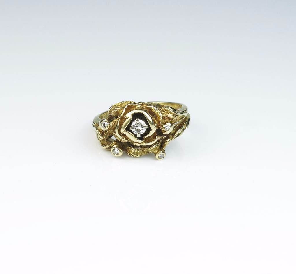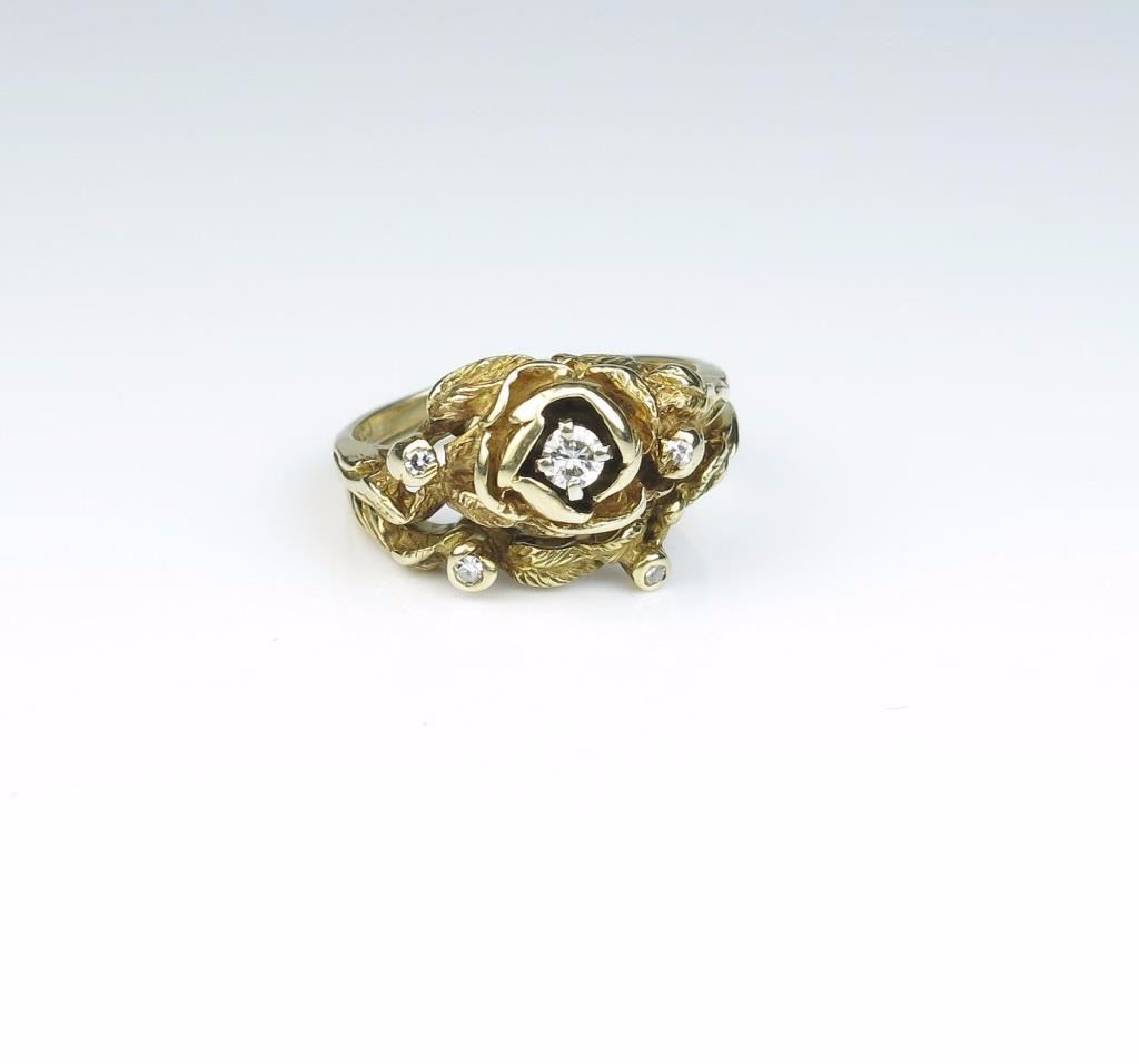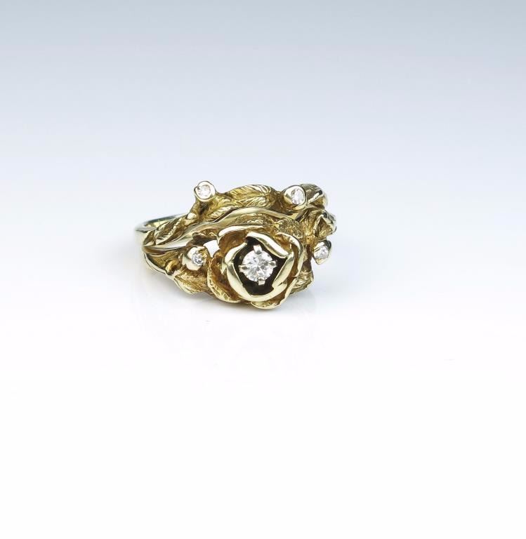 Lot 241 Nice handmade Bamboo design ring set with diamonds in 14 karat yellow gold setting. Estimates $500