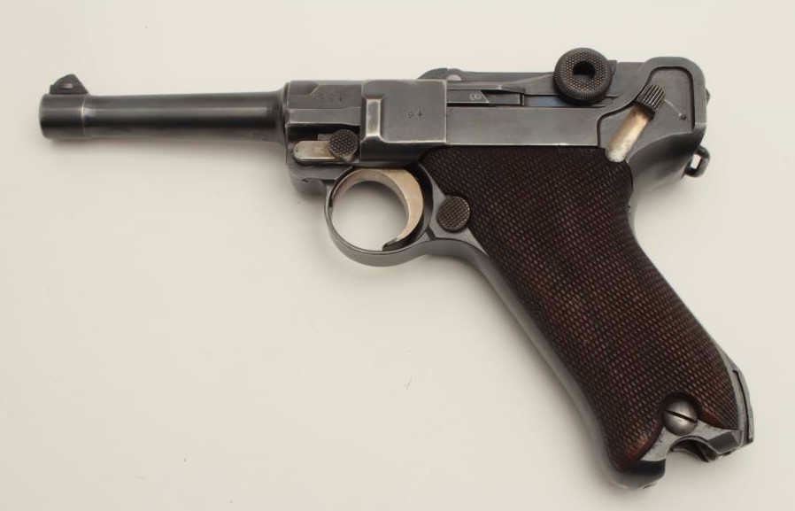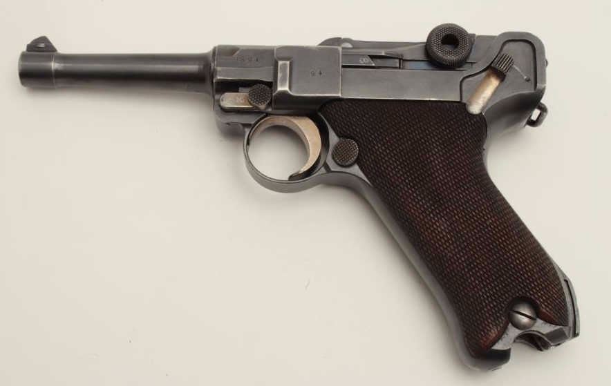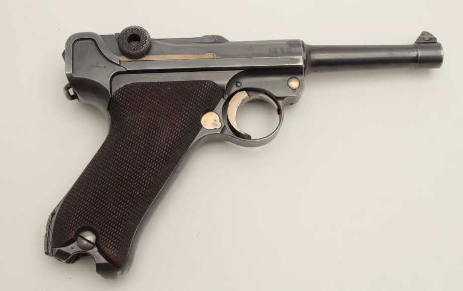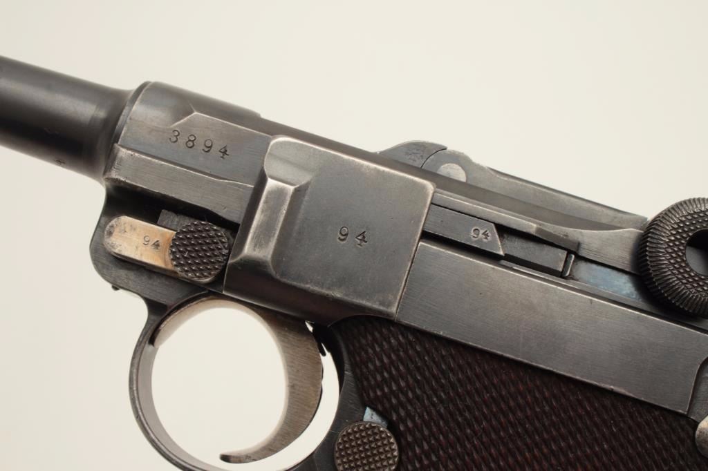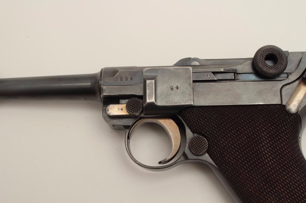 DWM Commercial Luger semi-automatic pistol, dated 1915, 9mm caliber, 4” barrel, blued finish, checkered wood grips, no magazine, S/N 3894, all matching visible numbers, in overall very good + condition with high point wear to blued finish and considerable straw finish to small parts; very good + bore, crisp action, sharp markings and very good grips. (C&R/PPT). Est.: $600-$1,200.