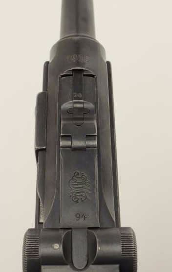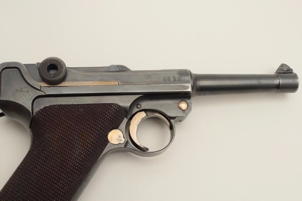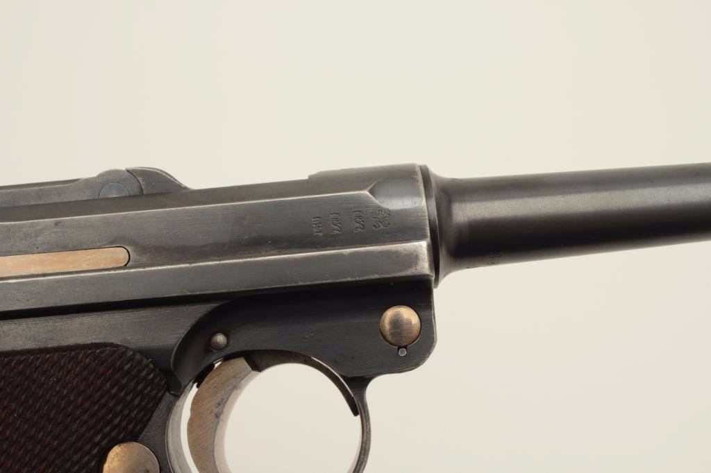 Lot 244 DWM Commercial Luger semi-automatic pistol, dated 1915, 9mm caliber, 4” barrel, blued finish, chec
