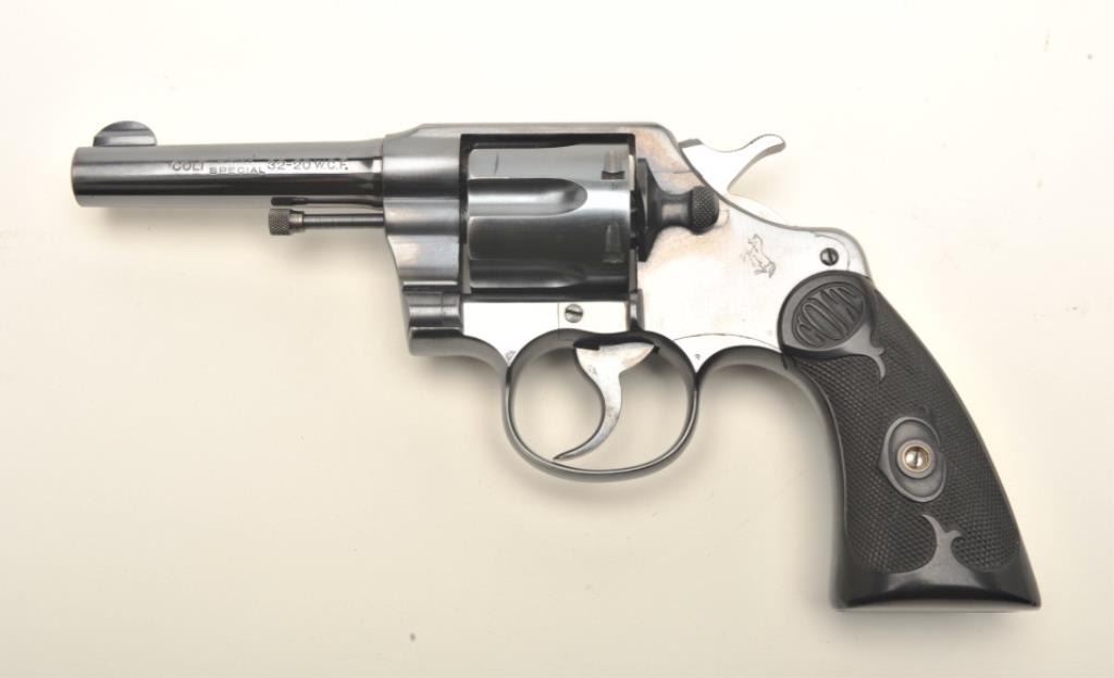 Colt Army Special DA revolver, .32-20 W.C.F. caliber, 4” barrel, high polish blued finish, checkered black hard rubber grips, S/N 421134, in overall very good to near fine condition showing the majority ofitsoriginal finish, some scattered scratches from storage, fine bore, crisp action, sharp markings and fine grips. (C&R/PPT). Est.: $600-$1,200.
