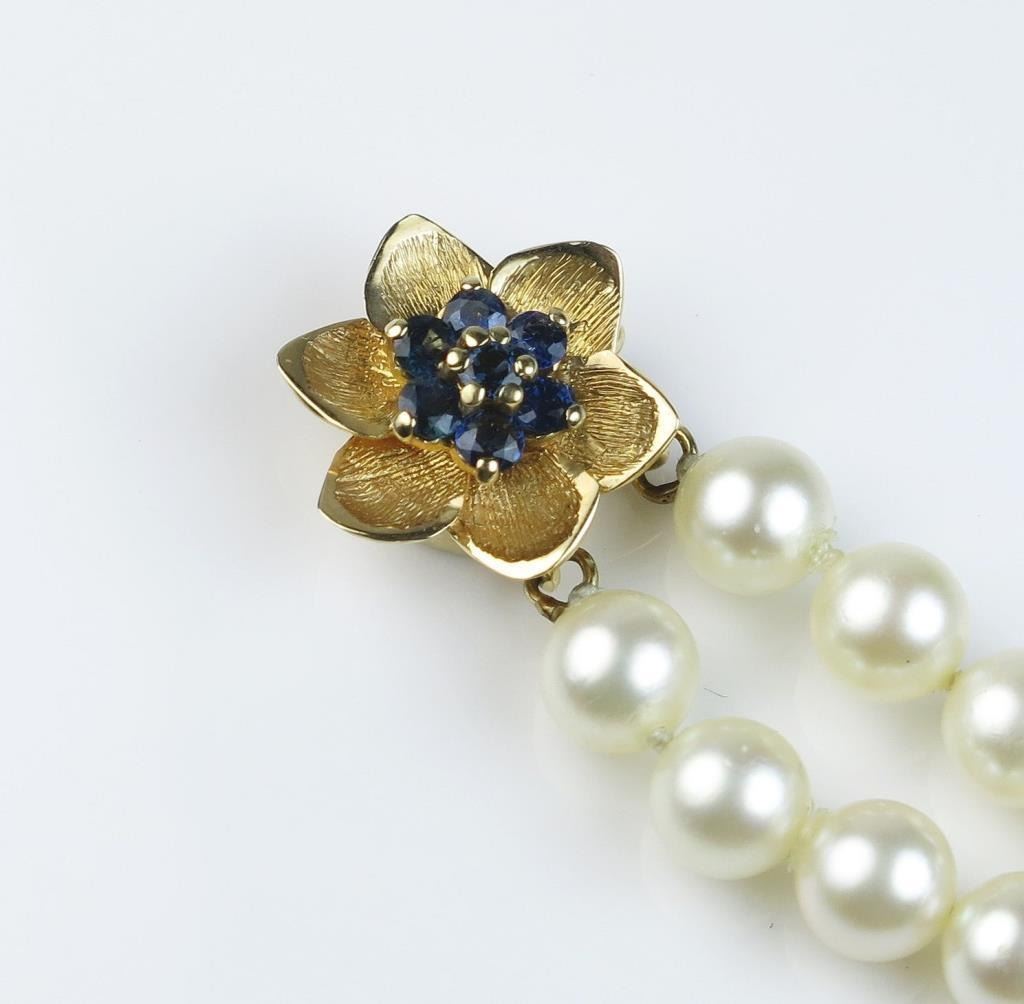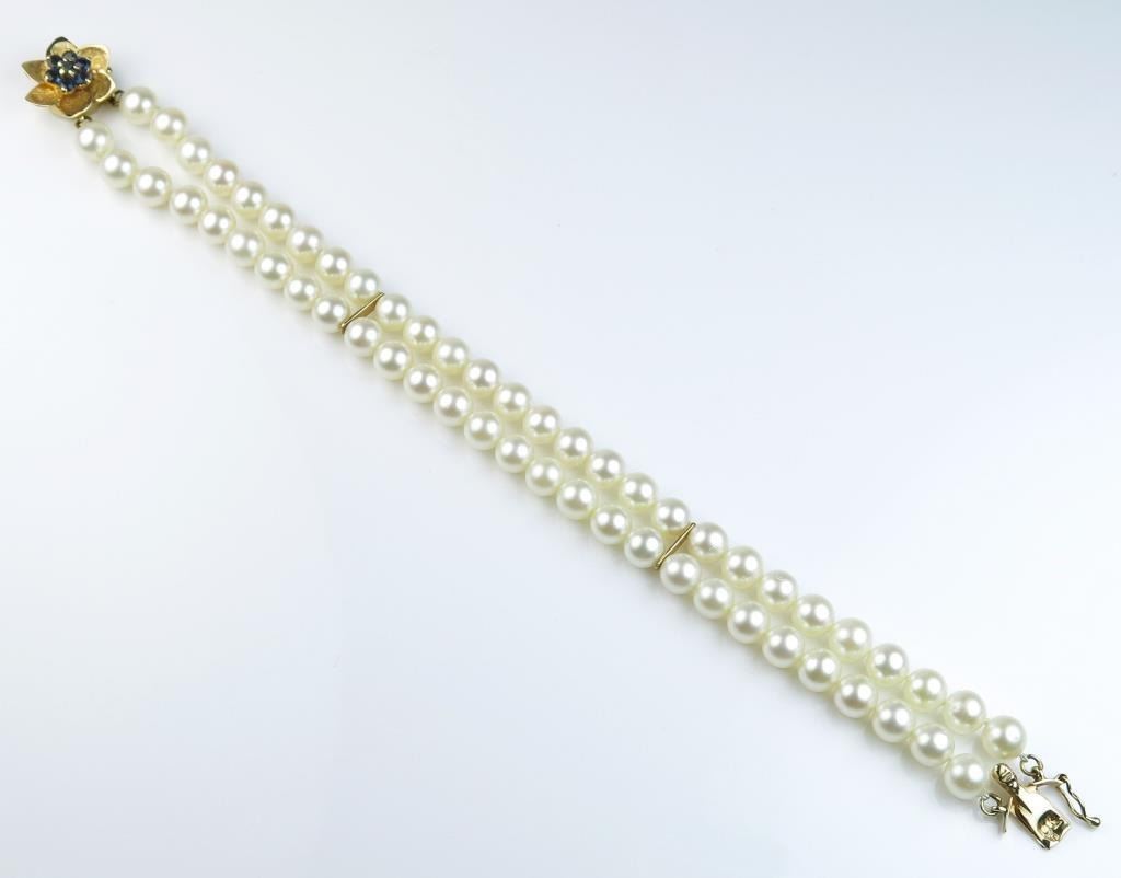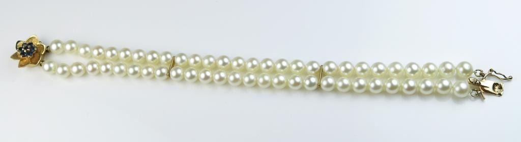 Lot 294 High quality ladies double row cultured pearl bracelet with nice 14 karat yellow gold sapphire cla