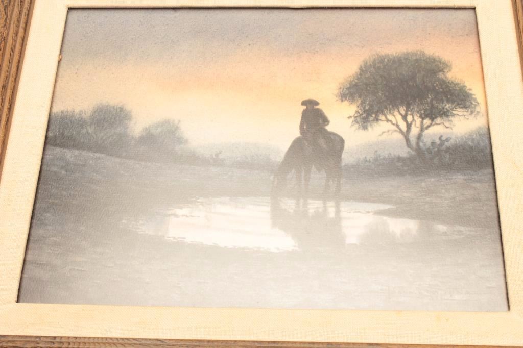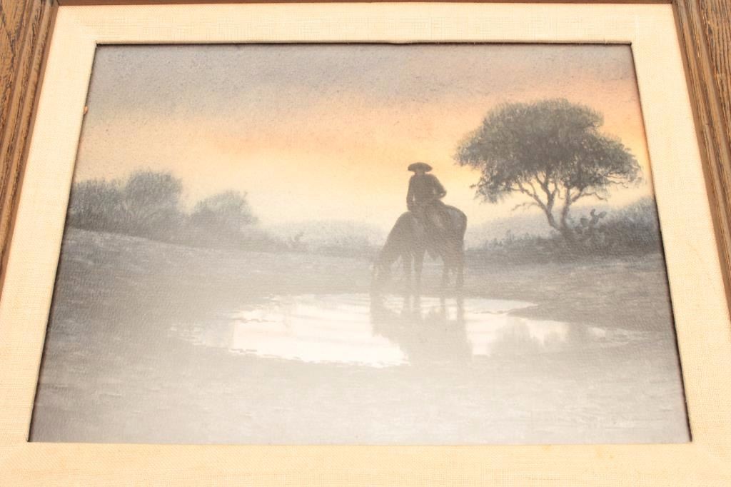 Lot 301 Framed watercolor by Don Yena entitled “Early Water” displaying a cowboy on horseback at a waterin