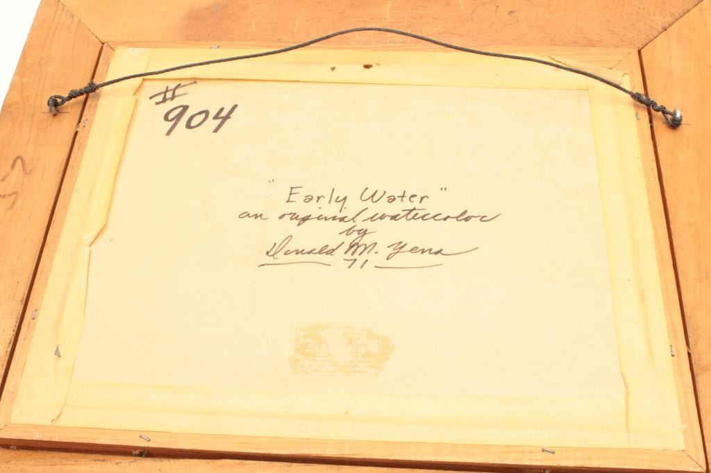 Framed watercolor by Don Yena entitled “Early Water” displaying a cowboy on horseback at a watering hole, approximately 15” x 18” overall. Est.: $500-$1,000.