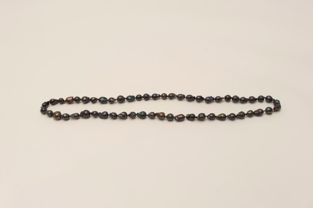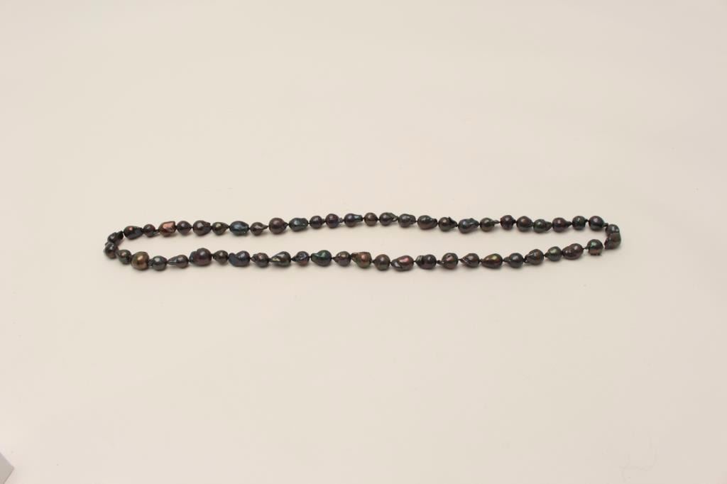 One very fine opera length(37inches) strand of black baroque pearls and approx 12 – 14 mm in dia. EST.$600-1,000