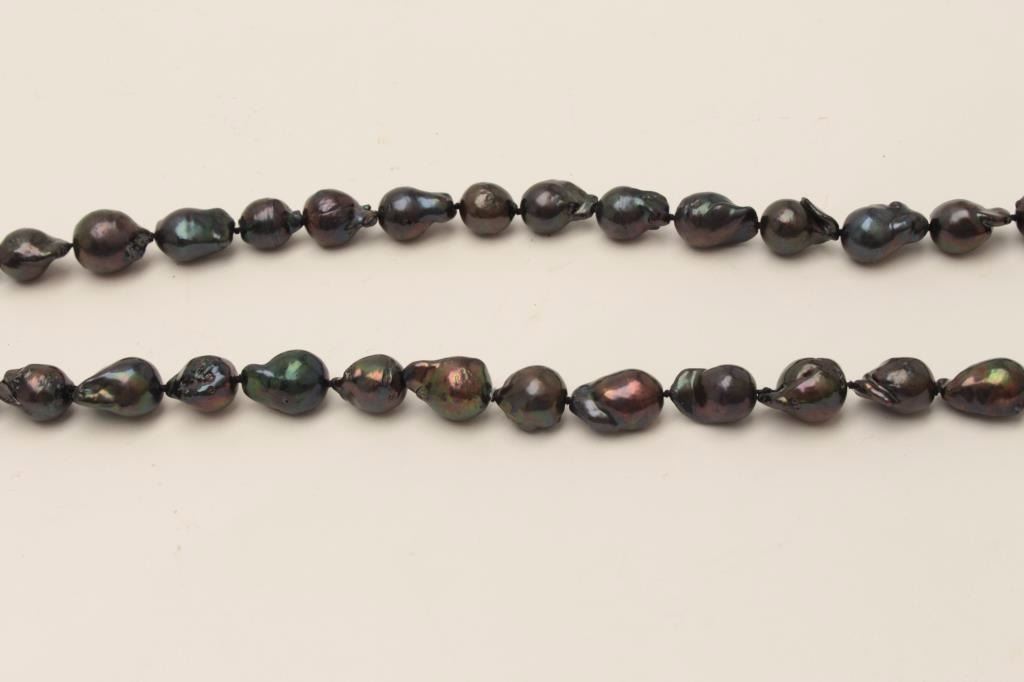 Lot 311 One very fine opera length(37inches) strand of black baroque pearls and approx 12 – 14 mm in dia.