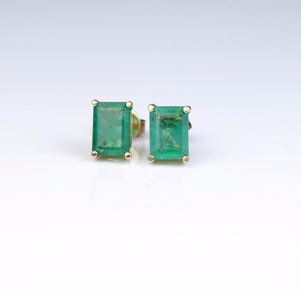 Lot 315 Nice matching Emerald earrings weighing approx. 3.00 carats in 14 karat yellow gold setting. Estim