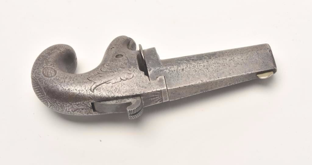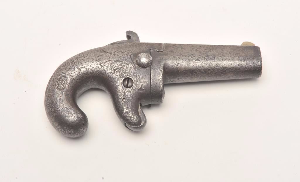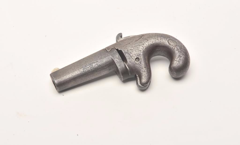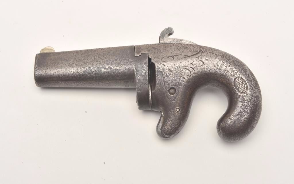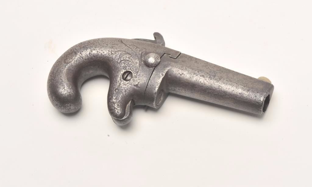 First Model National Deringer, .41 caliber, 2.5” barrel, all iron construction, S/N 921, in overall fair to good condition with a dark patina and pinprick pitting to metal surfaces, working action, dark bore, brokenfiring pin. (Antique). Est.: $400-$800.