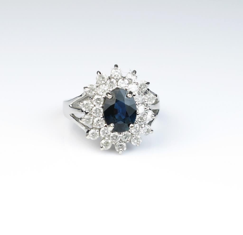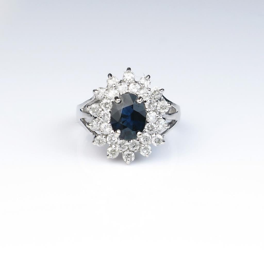 Lot 336 Dazzling ring featuring a blue Sapphire weighing approx. 1.50 carats and surrounded by 28 full cut