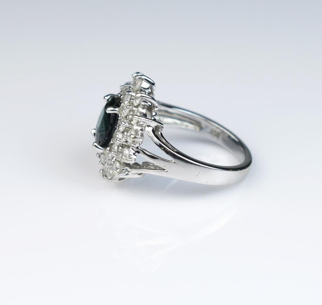 Dazzling ring featuring a blue Sapphire weighing approx. 1.50 carats and surrounded by 28 full cut diamonds weighing approx. 1.00 carats of G-H colors and SI/I clarity in a 14 karat white gold setting. Retail$2,000-$3,000 Estimates $1,000-$1,500