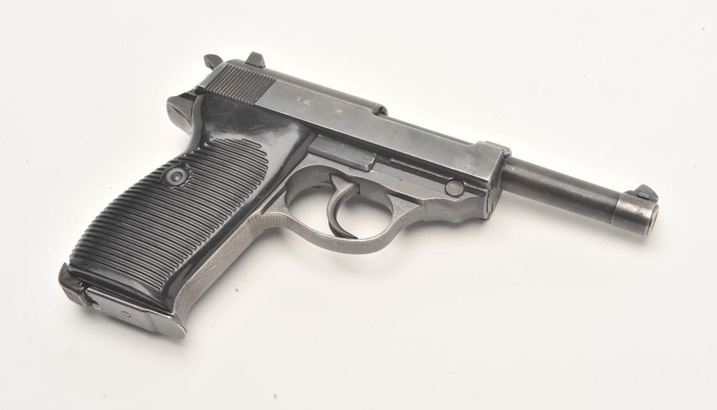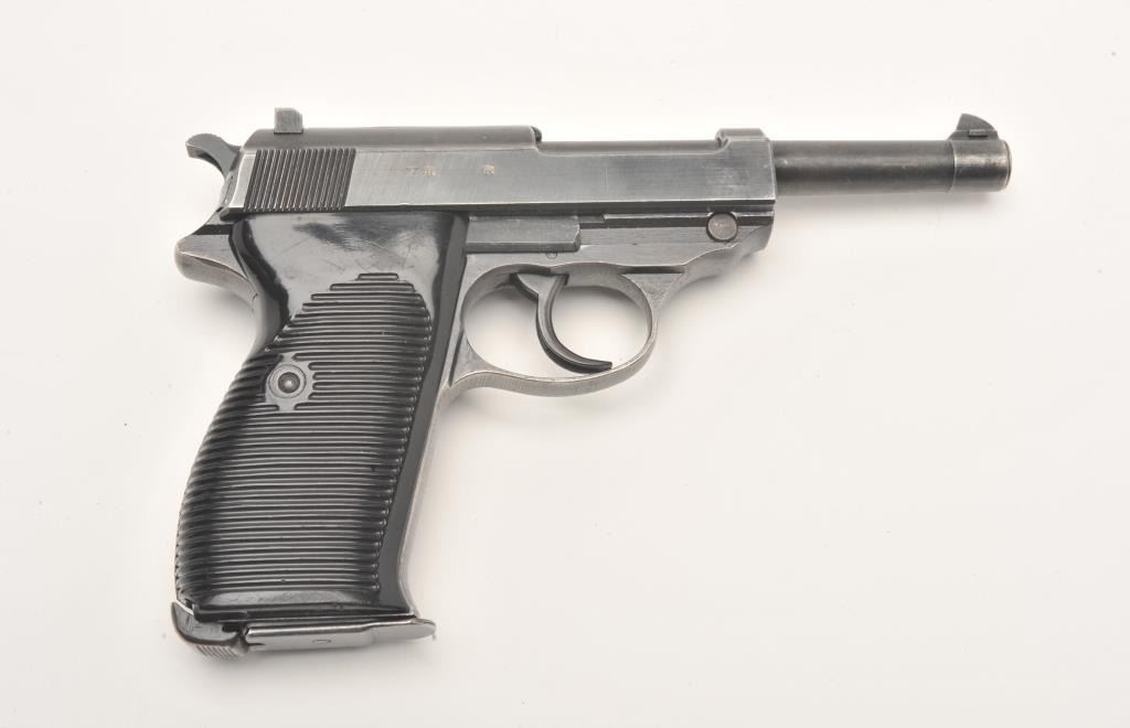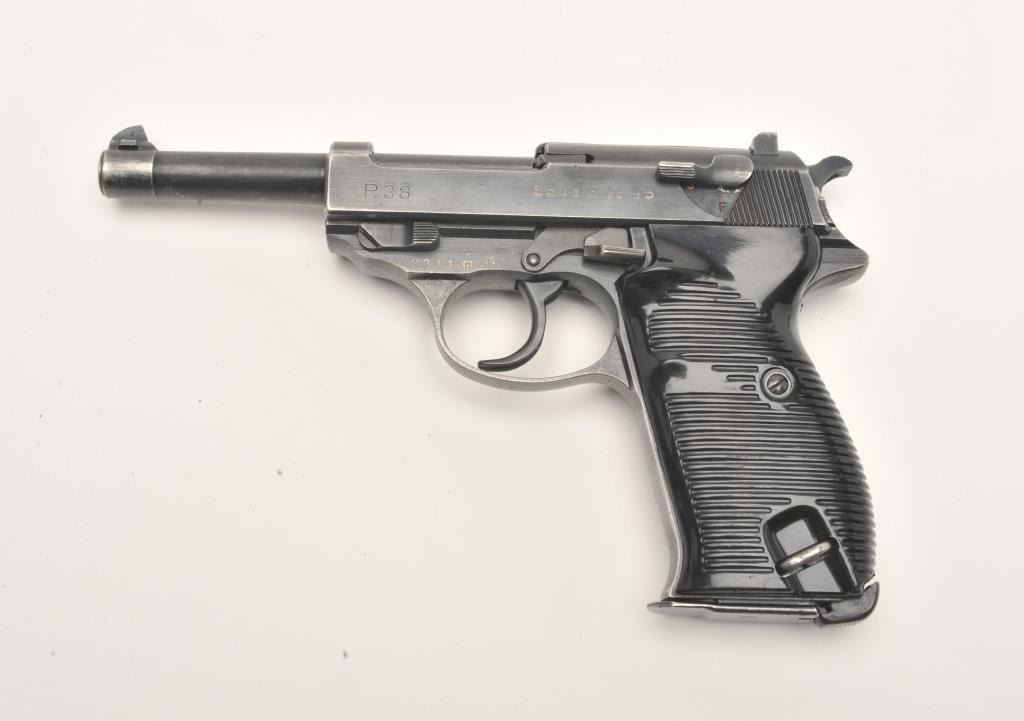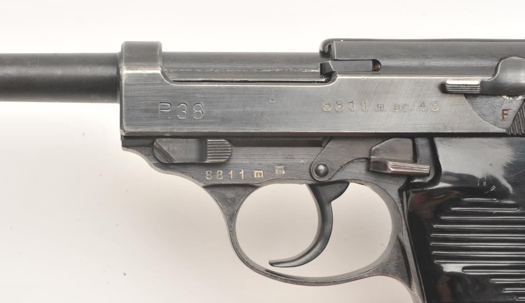 German P-38 semi-automatic pistol, ac43-marked, 9mm caliber, 5” barrel, military blued finish, black grips, S/N 8811m (all matching visible #s), in overall very good condition showing considerable militaryfinish remaining, very good bore, crisp action, sharp markings and very good grips. (C&R/PPT). Est.: $400-$800.