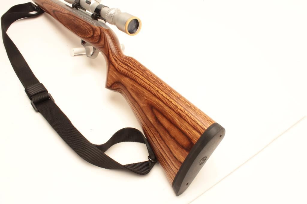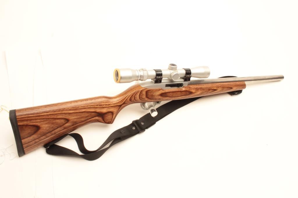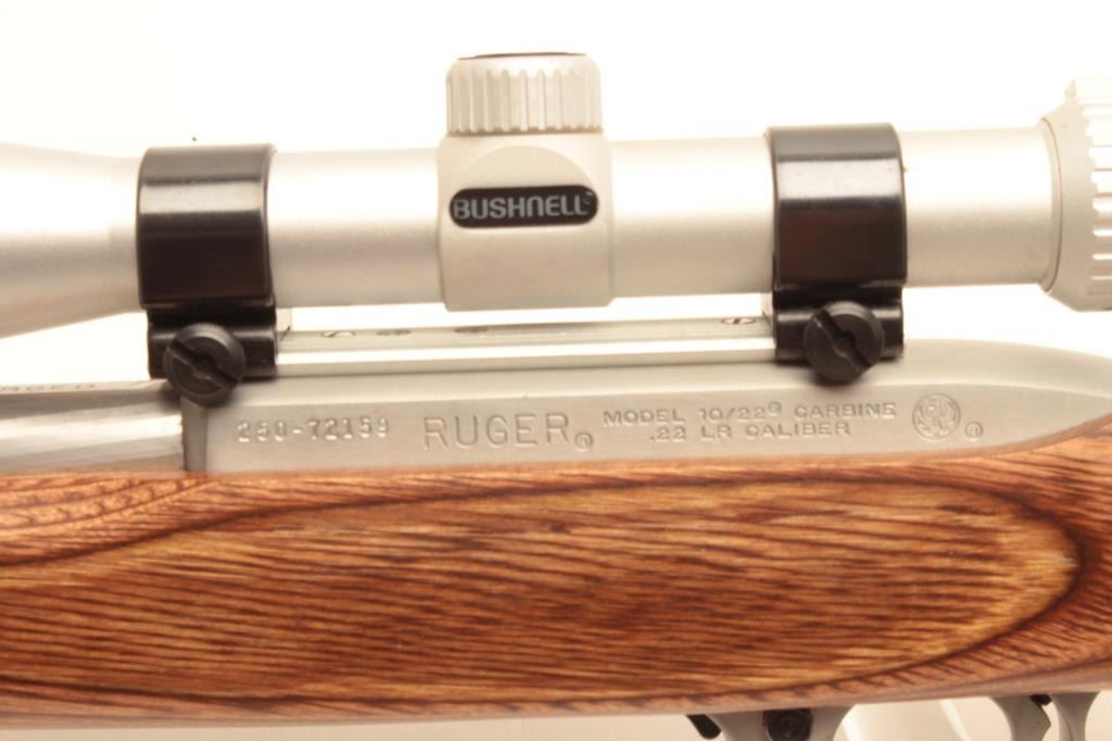Ruger Model 10/22 carbine, .22LR caliber, 20” Ruger Hammer Forged barrel, stainless with wood stock, nylon woven sling and mounted with a Bushnell scope displaying fine optics; S/N 250-72159, in overall fine conditionwith a fine bore, crisp action, sharp markings and fine stock. (Modern). Est.: $300-$600.