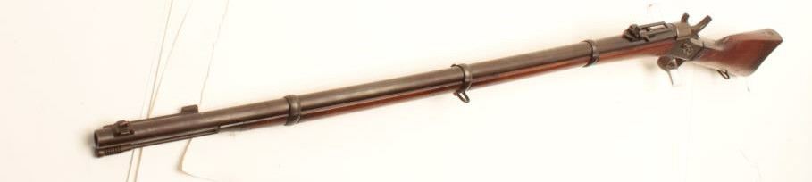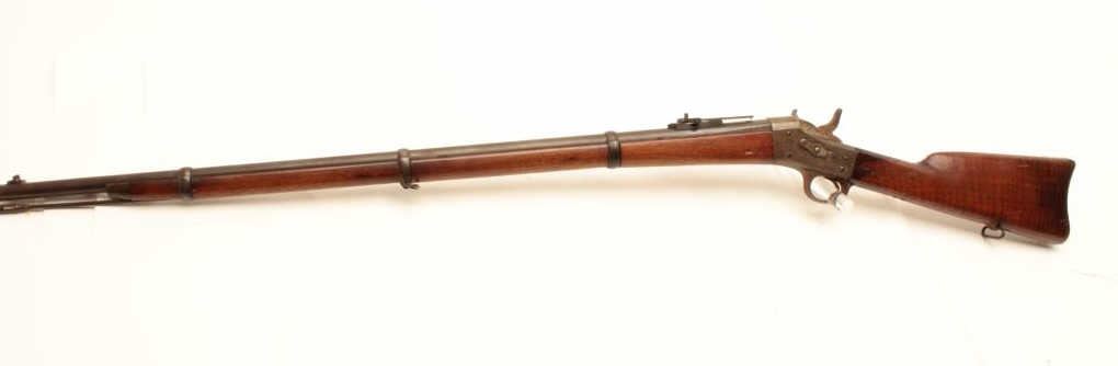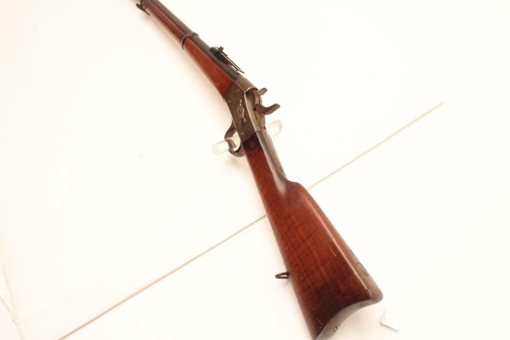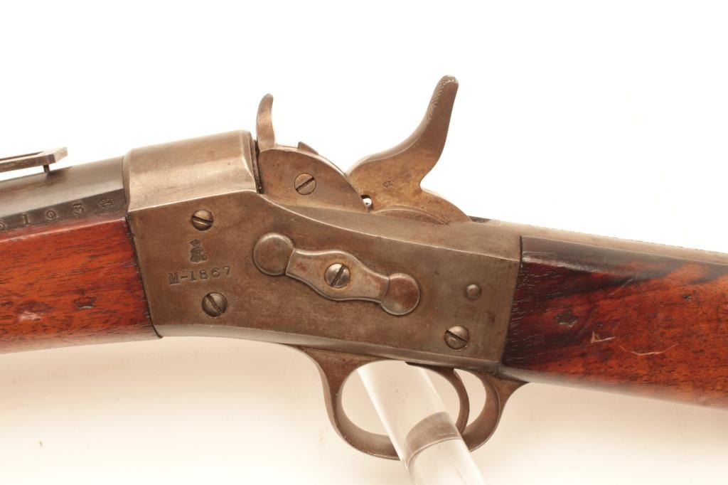 1867 Remington Rolling Block single shot rifle, .45-70 caliber, Serial #56193. The rifle is in good overall condition with a 34” barrel with a post front and military tangent style rear sights. The barrelretains a significant amount of its blue finish with the remainder going to a grey patina. The receiver is a silver, toned case hardening marked M-1867. The tang is dated 1879. The smooth wood stocks are in goodcondition with dents and compressions consistent with use and handling. The butt stock has cartouches at the wrist, along the butt and ends with a smooth, steel crescent butt plate. The bore is good, the actionfunctions and the markings are legible. Est.: $450-$900. (Antique).