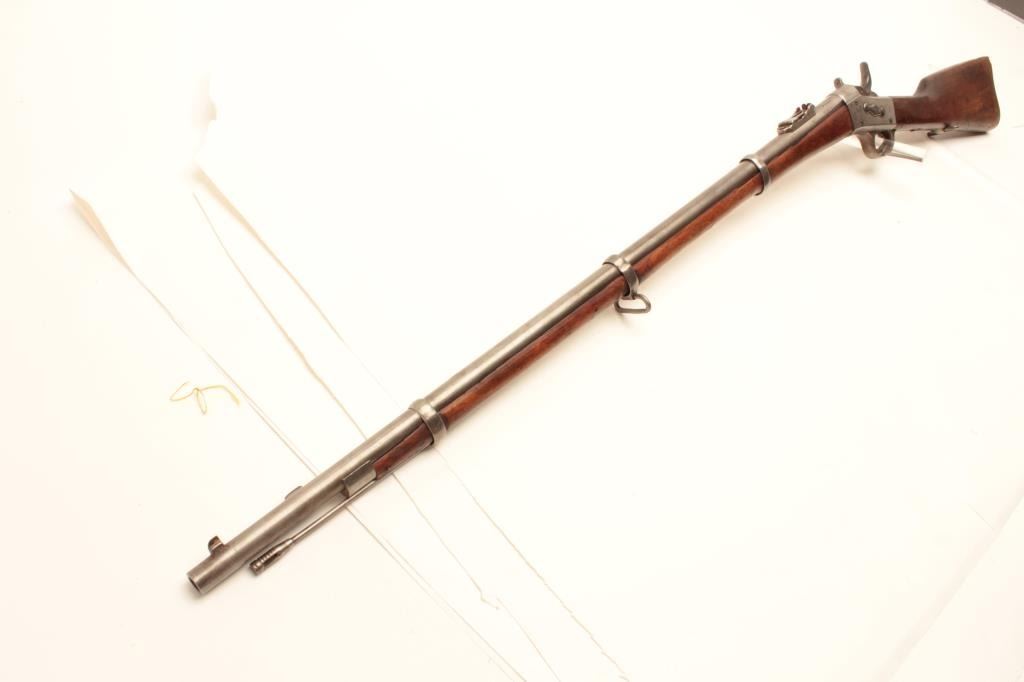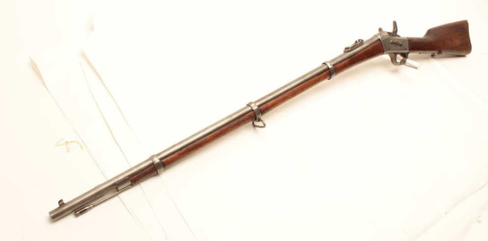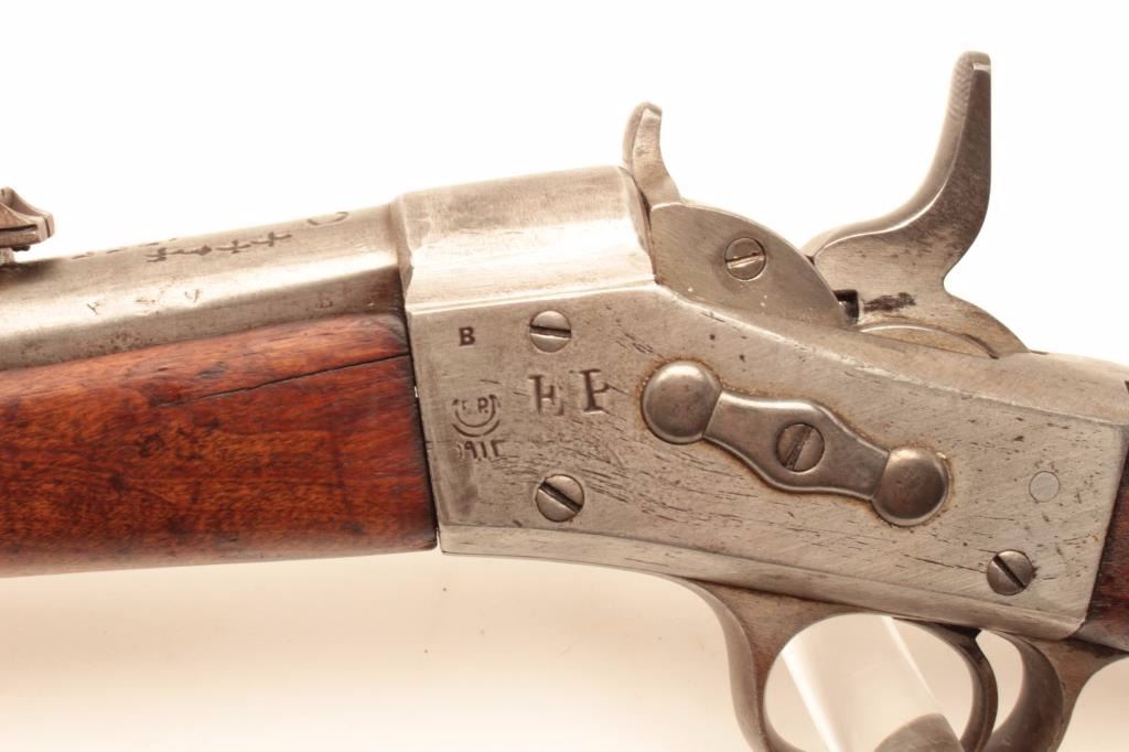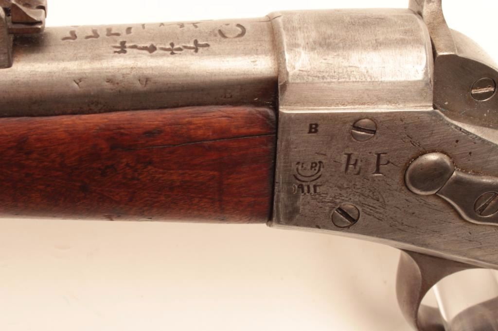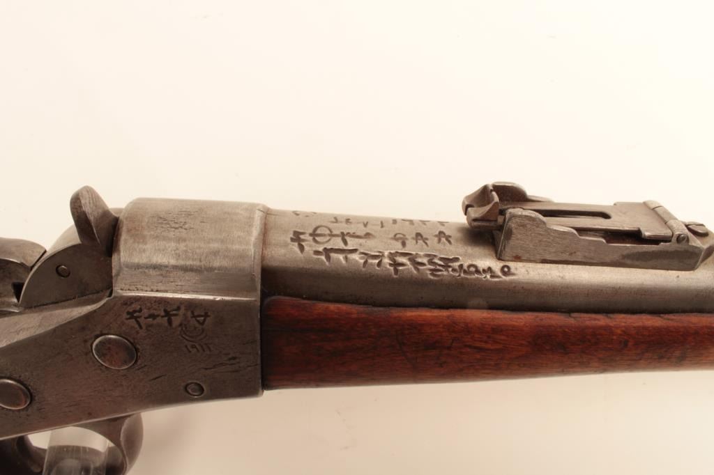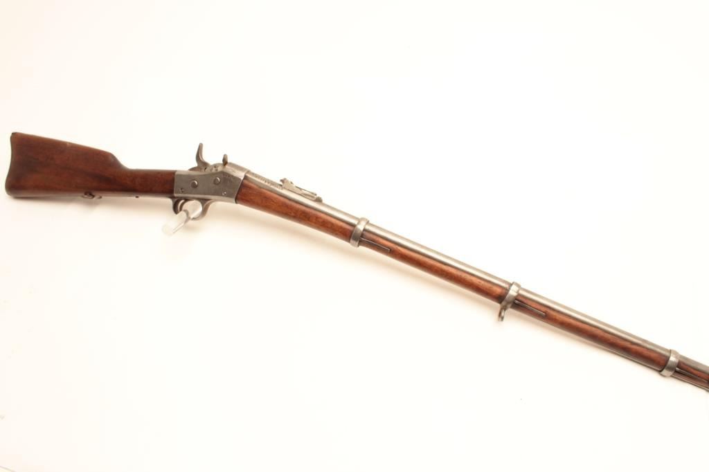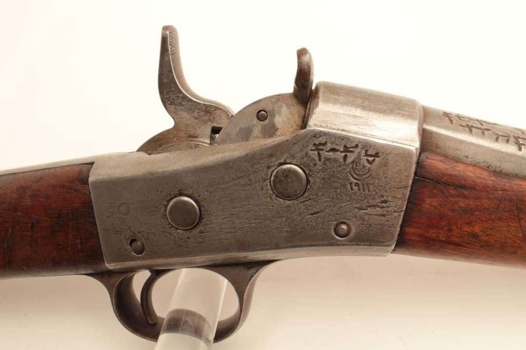 1864 Remington Rolling Block single shot rifle, .45-70 caliber, Serial #64964. The rifle is in good overall condition with a 34” barrel with a post front and military tangent style rear sights. The barrel hasgone entirely to grey patina with characters carved in front of the breech. The receiver is also a grey patina with additional markings carved into the action. The smooth wood stocks are in fair condition with dentsand compressions consistent with use and handling. The butt stock has sling swivels and ends with a smooth, steel crescent butt plate. The bore is fair, the action functions and the markings are legible.According to the consignor, the rifle was one of 100,000 to the Egyptian military in 1870. Est.: $475-$950. (Antique).