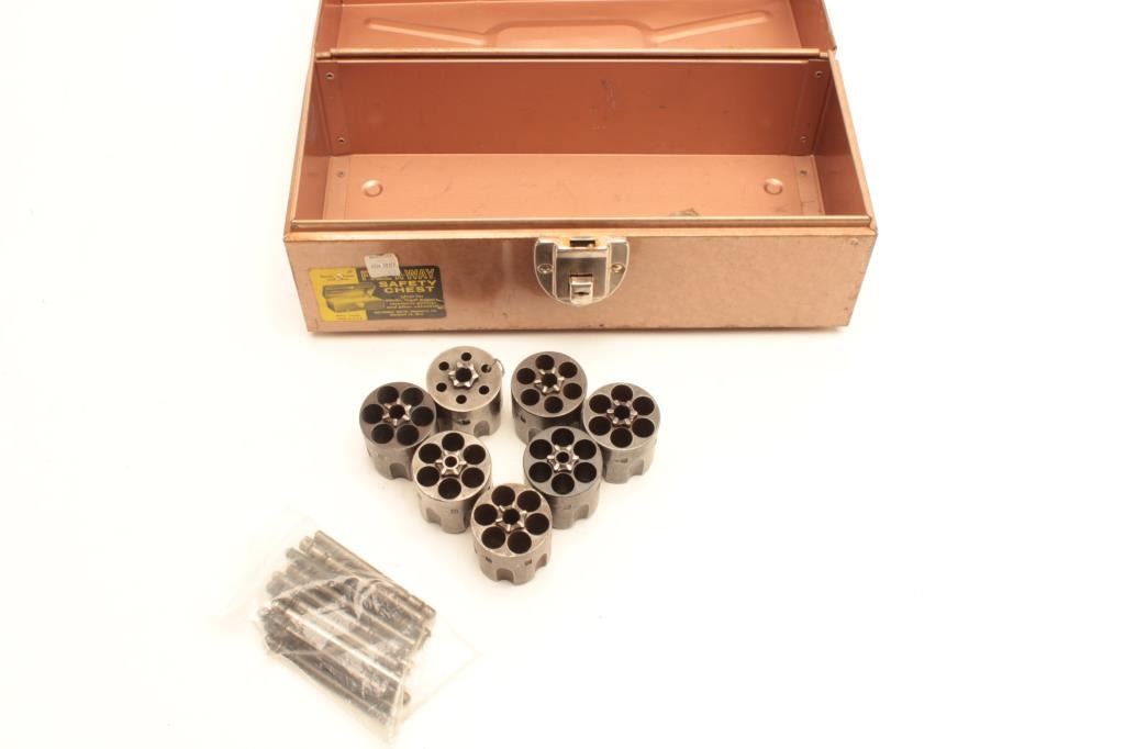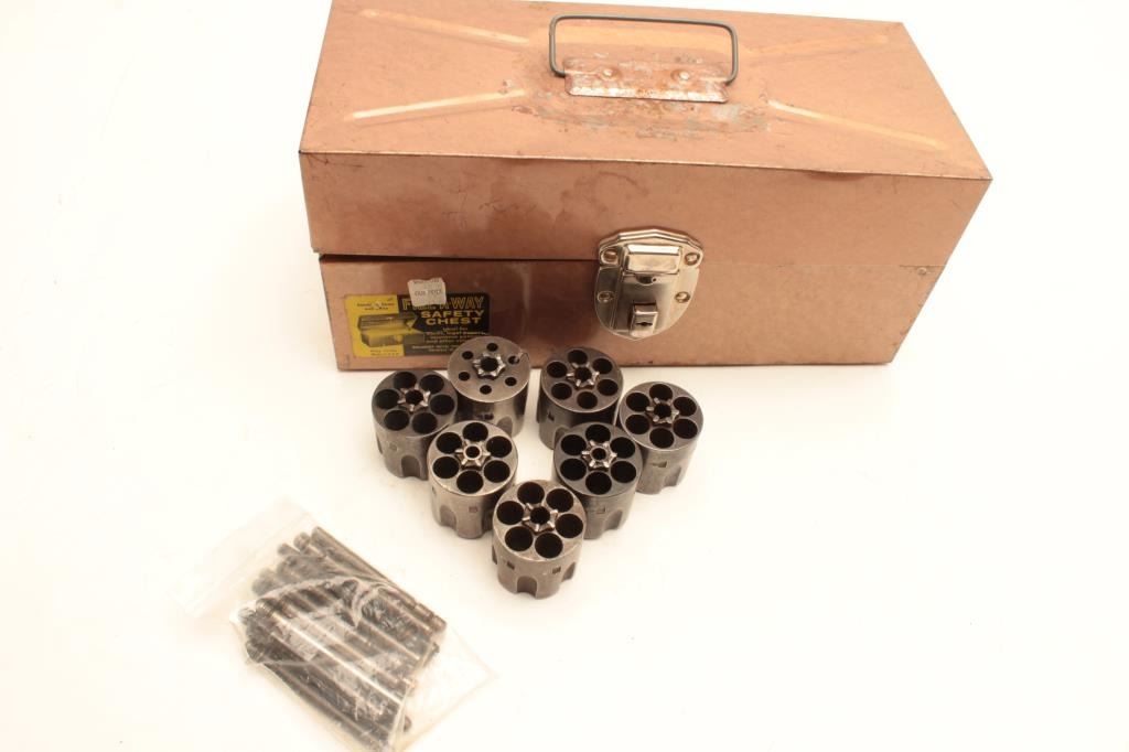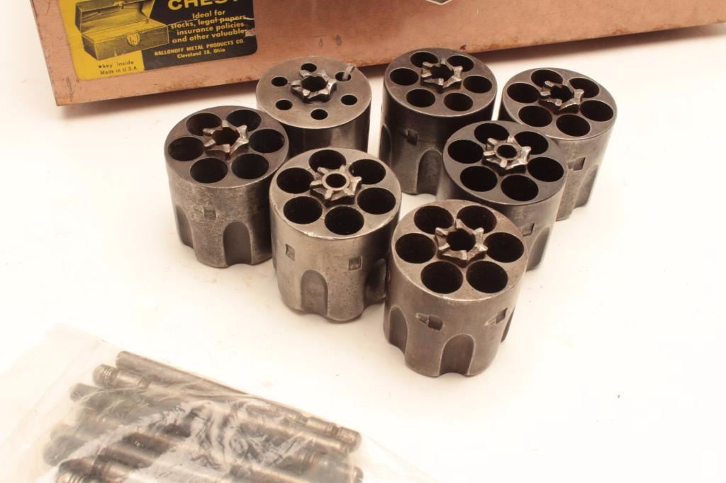 Five 1st generation black powder era Colt cylinders in .45 Colt caliber, one shows #74; good to very good condition, no bushings; 1 black powder Colt cylinder nicely converted to .22 caliber, 1 .38-40 caliber black powder cylinder (Seven total). Parts horde from Joe Kiser, past president of Colt Collectors Association and founding member; along with 17 SAA Colt cylinder pins in various conditions (14 original and several showingoriginal finish). Est.: $400-$800.