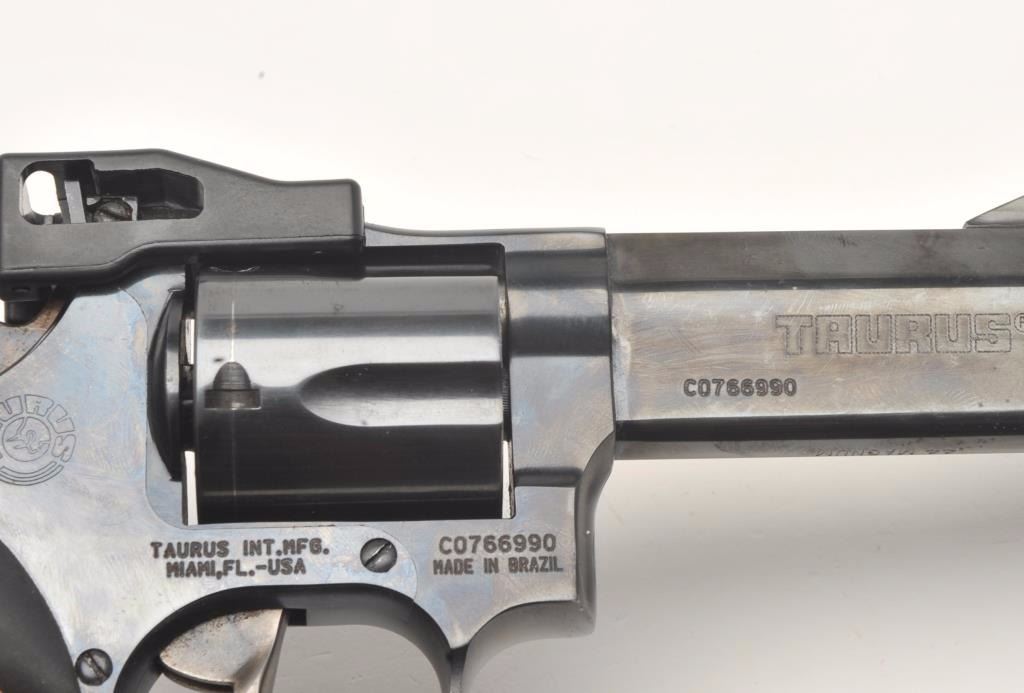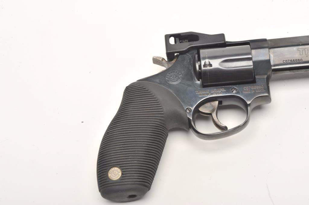 Taurus Tracker Model DA revolver, .44 Magnum caliber, 4” ported barrel, blued finish, hard rubber grips, S/N C0766990, in overall fine condition with crisp action, sharp markings, very good to fine bore and fine grips; withTaurus hard case and instructions. (Modern/NO CALIF SALE). Est.: $250-$500.
