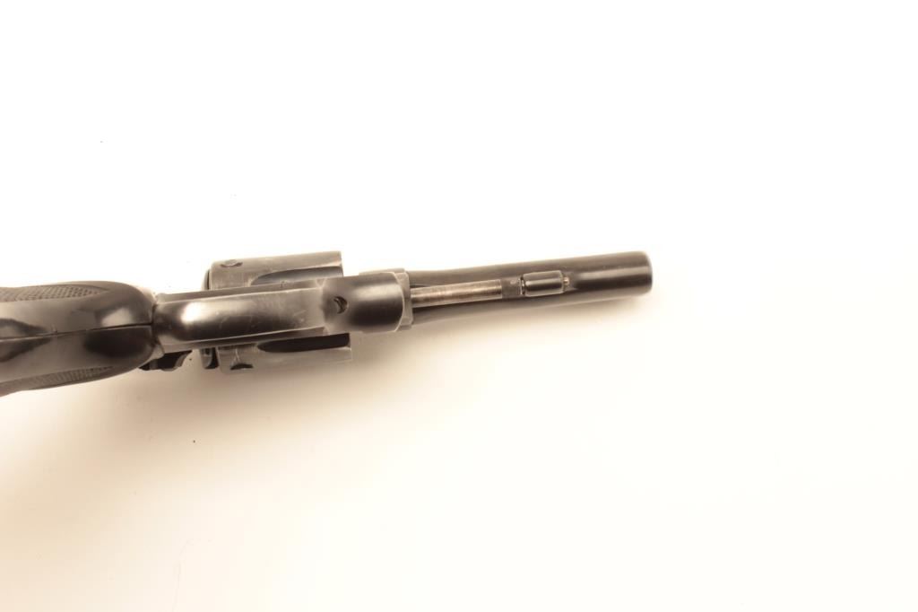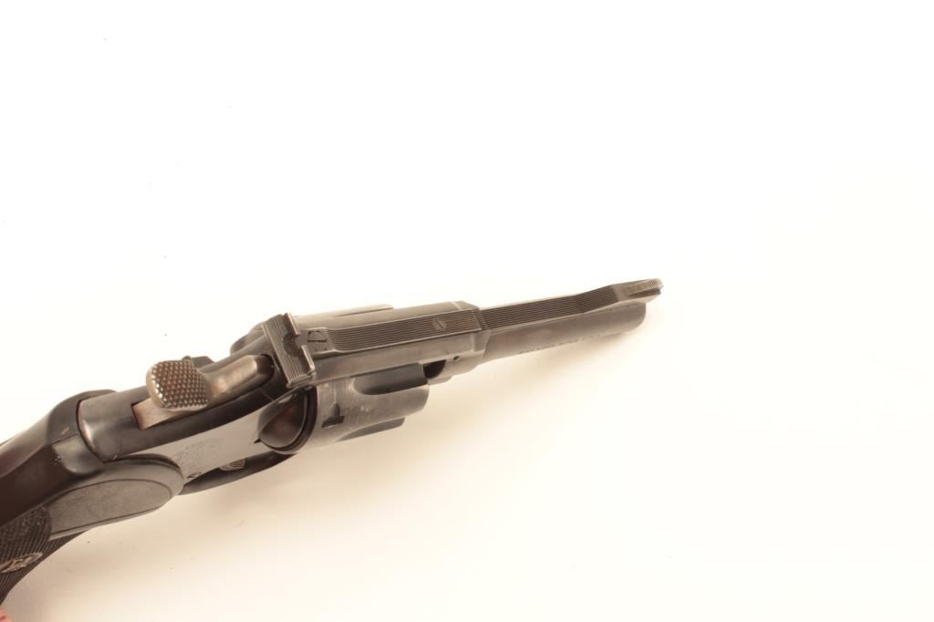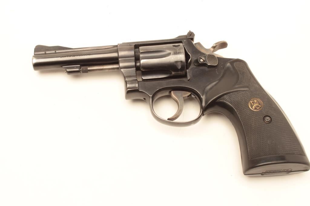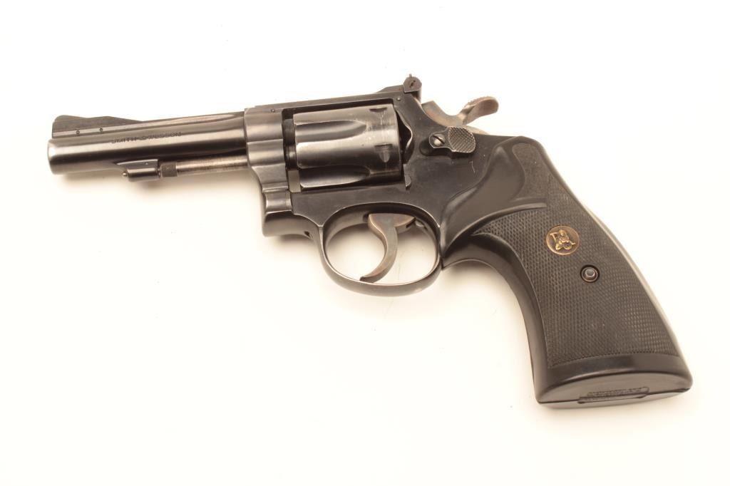 Lot 386 Smith & Wesson 5-screw DA revolver, .22LR caliber, 4” barrel, blued finish, Pachmayr checkered com