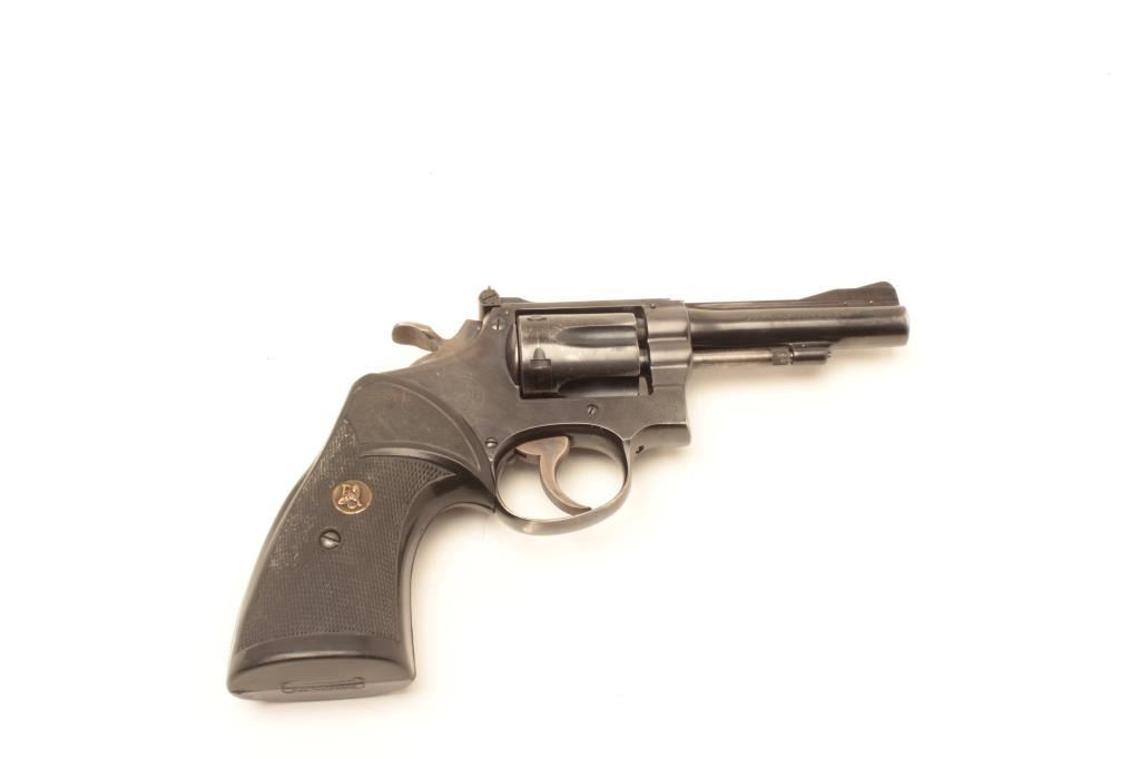 Smith & Wesson 5-screw DA revolver, .22LR caliber, 4” barrel, blued finish, Pachmayr checkered combat hard rubber grips, S/N K202309, with leather basketweave holster; revolver is in overall very good conditionshowing the majority of its original finish, very good + bore, crisp action and markings, good grips. (C&R/No PPT). Est.: $400-$800.