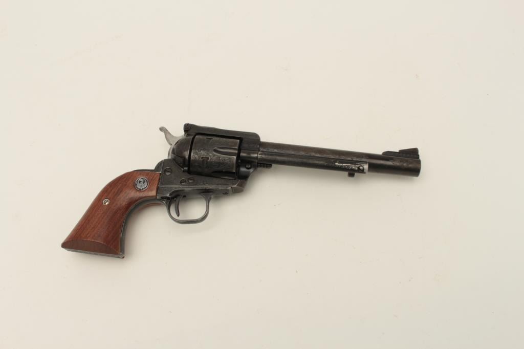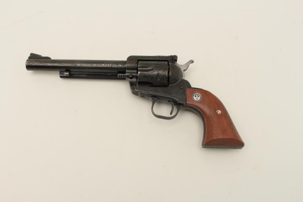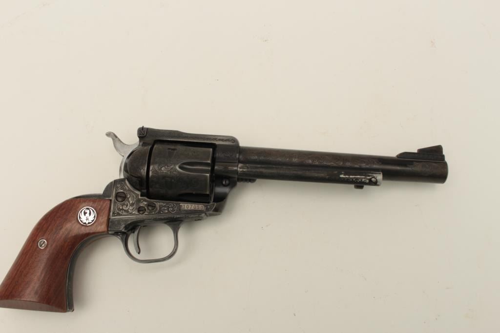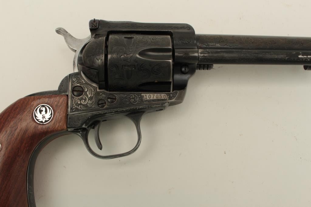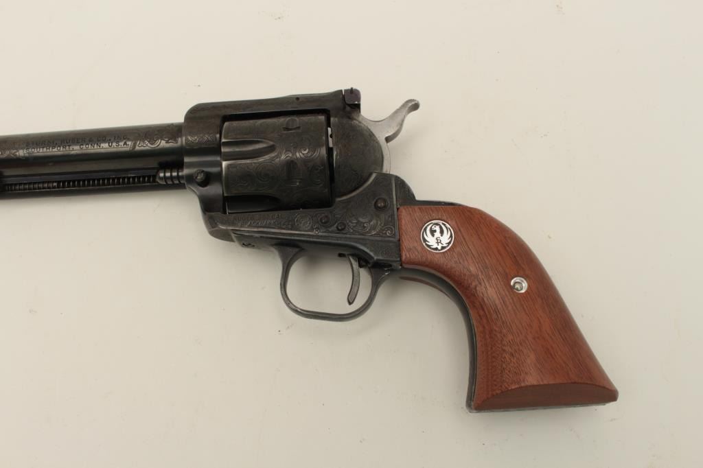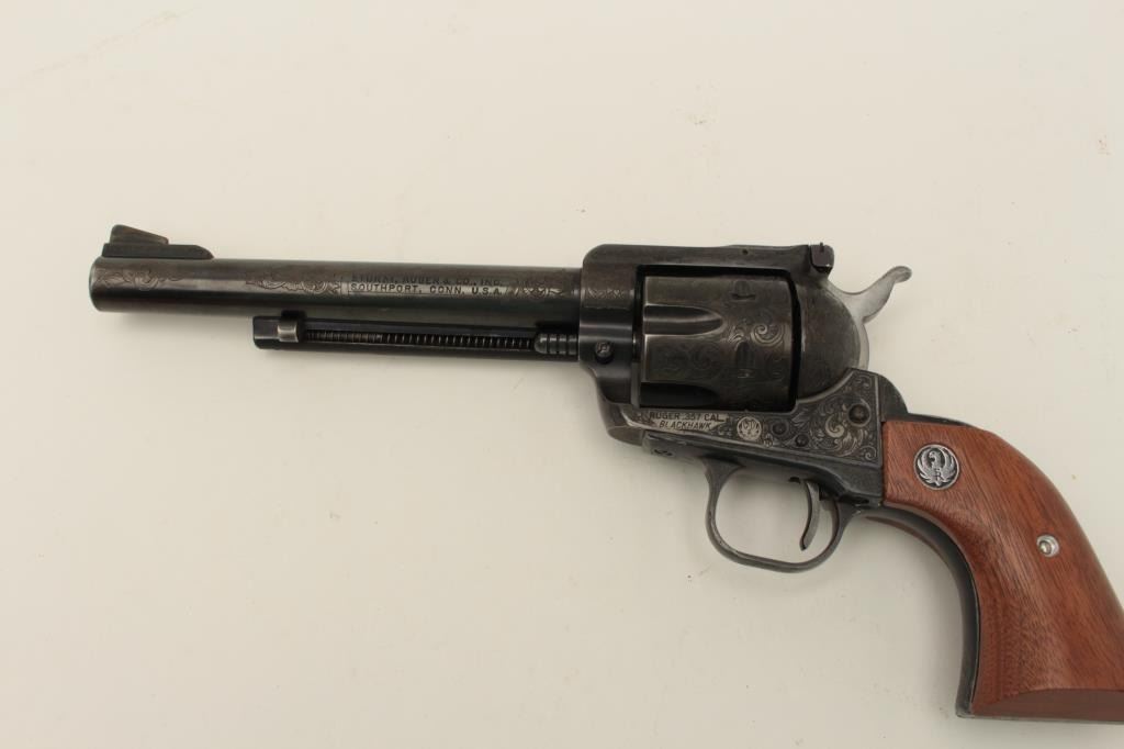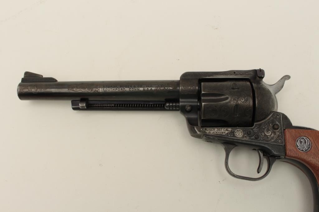 Ruger Blackhawk Model single action revolver, .357 Magnum caliber, 6.5” barrel, blued finish, finely scroll engraved by Mike Gouse of the Bitterroot Valley, MT., S/N 107050, in overall very good to near fine conditionwith a near fine bore, crisp action, sharp markings and engraving, near fine wood medallion grips; accompanied by a leather holster and cartridge belt. (Modern/No PPT). Est.: $350-$700.