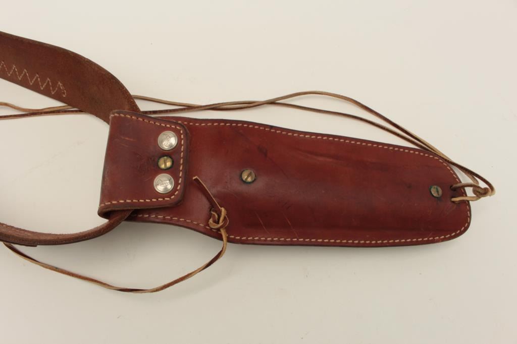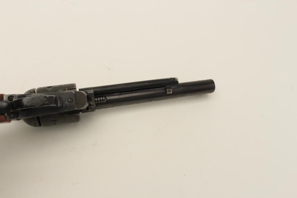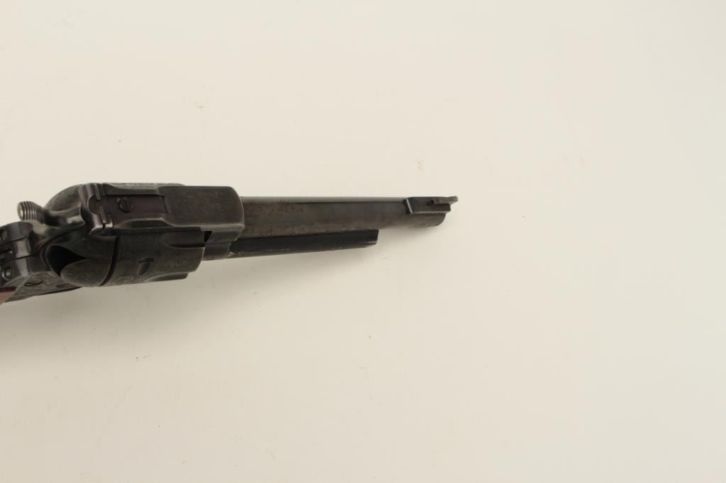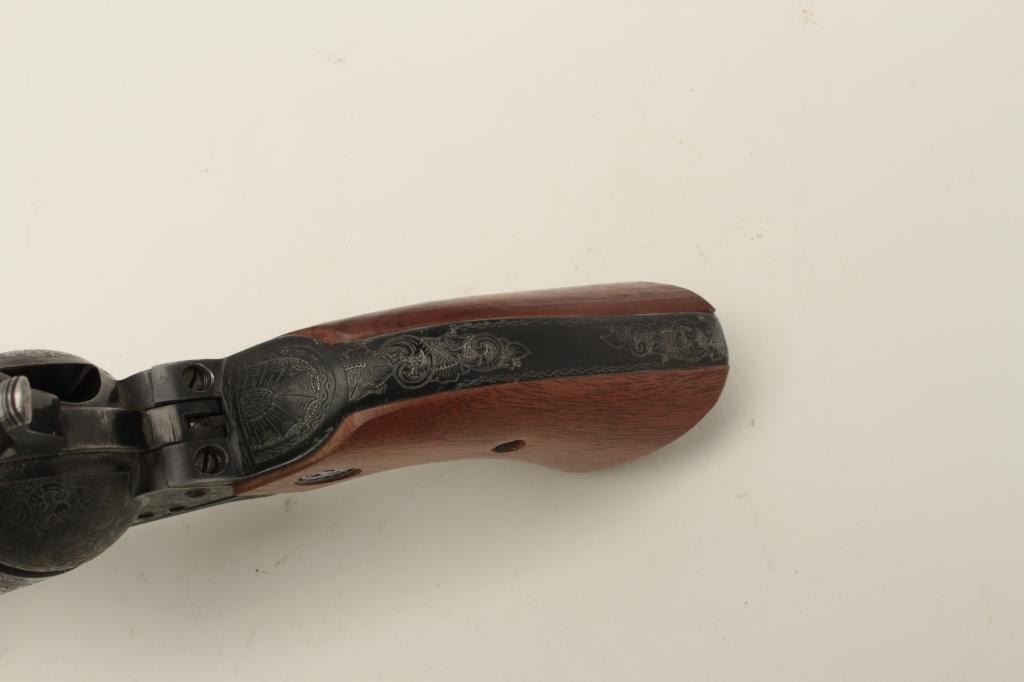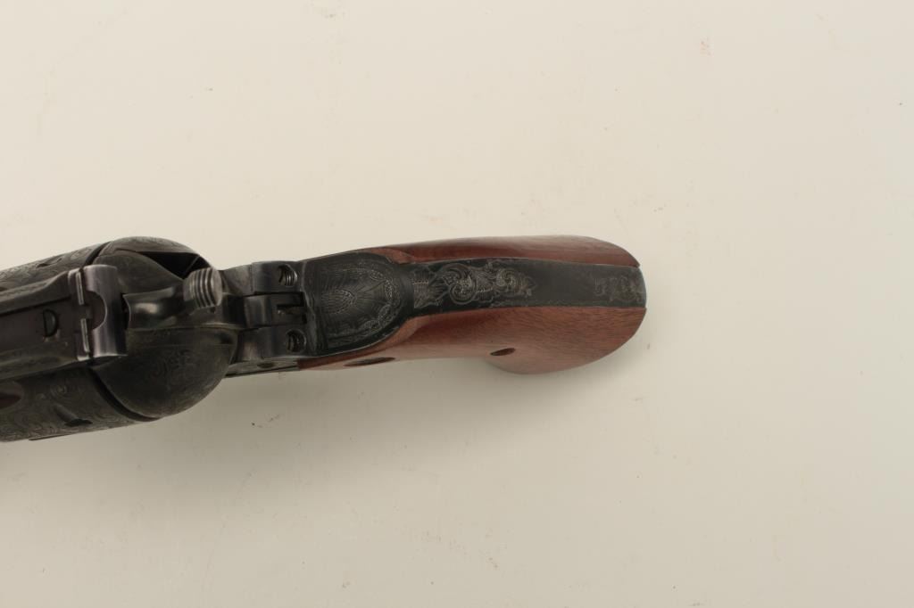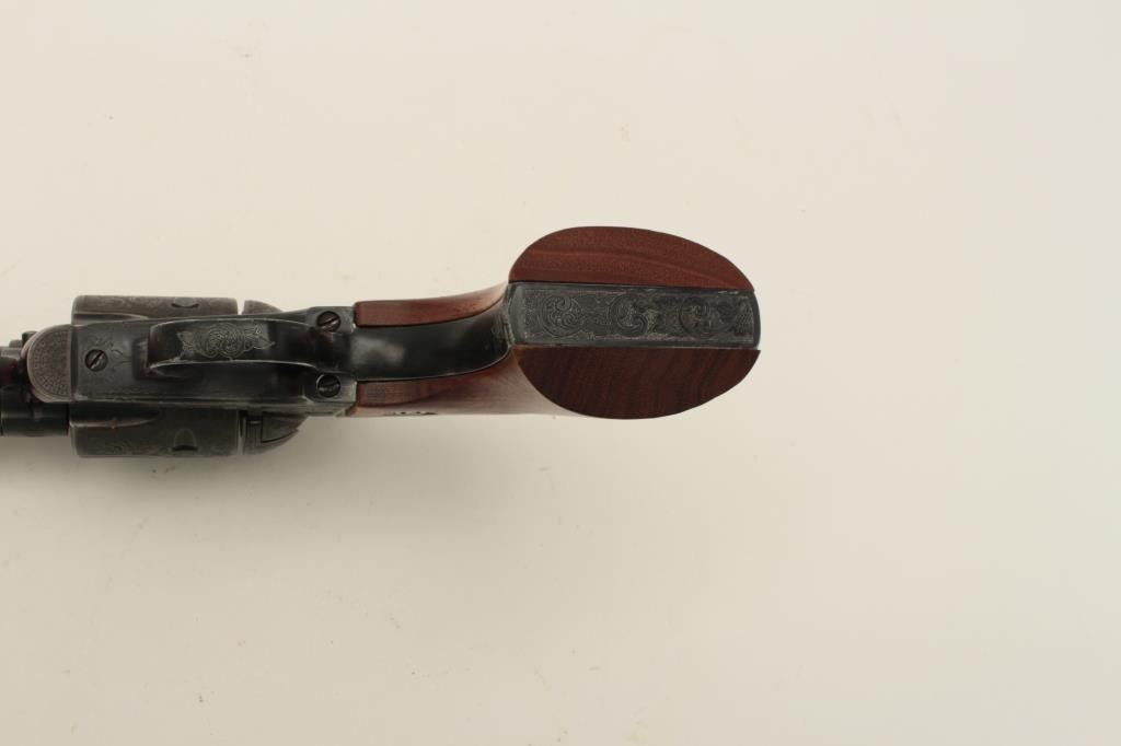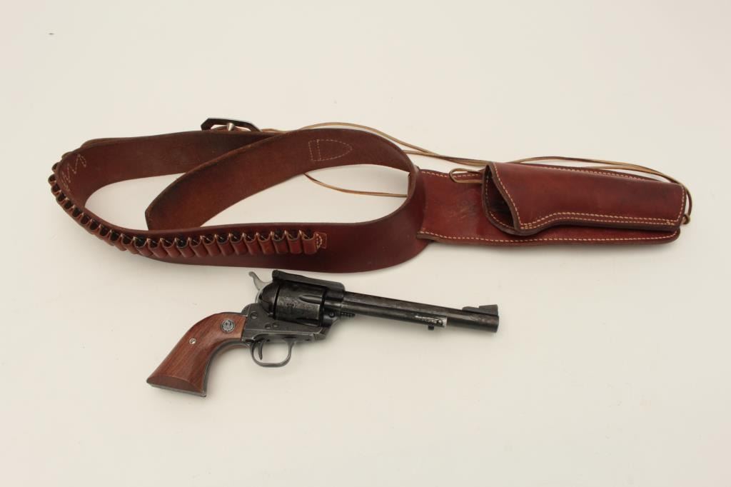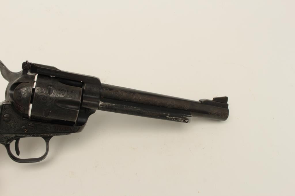 Ruger Blackhawk Model single action revolver, .357 Magnum caliber, 6.5” barrel, blued finish, finely scroll engraved by Mike Gouse of the Bitterroot Valley, MT., S/N 107050, in overall very good to near fine conditionwith a near fine bore, crisp action, sharp markings and engraving, near fine wood medallion grips; accompanied by a leather holster and cartridge belt. (Modern/No PPT). Est.: $350-$700.