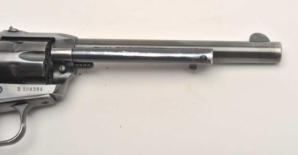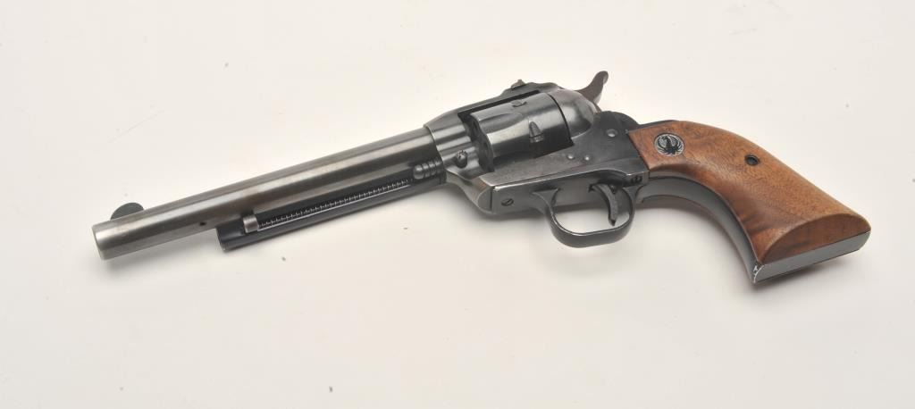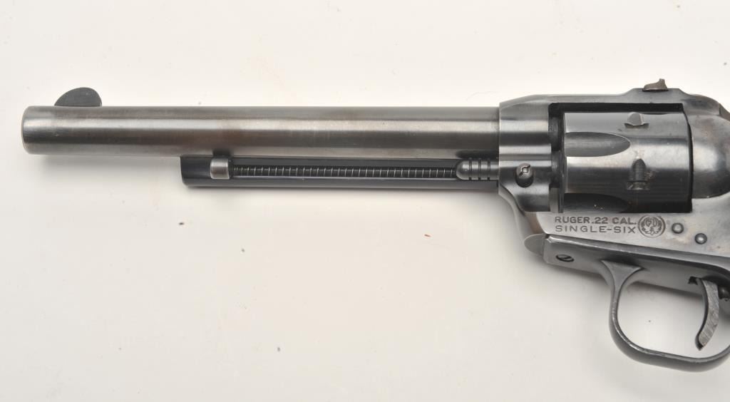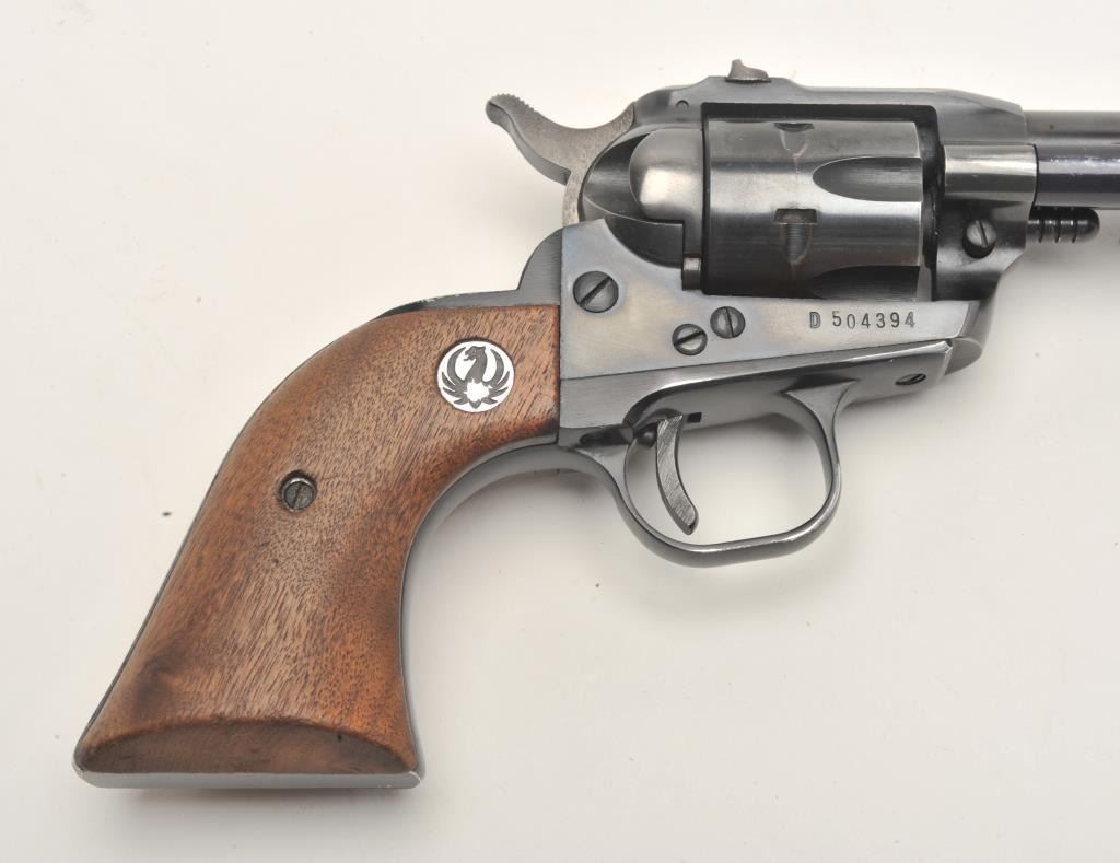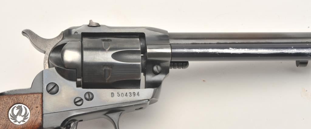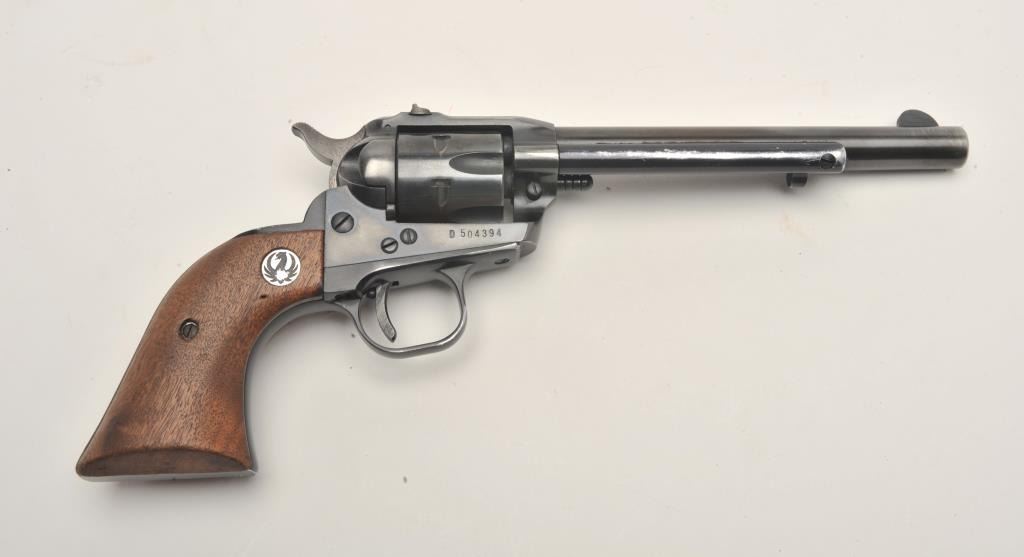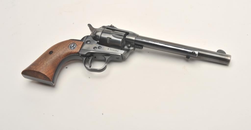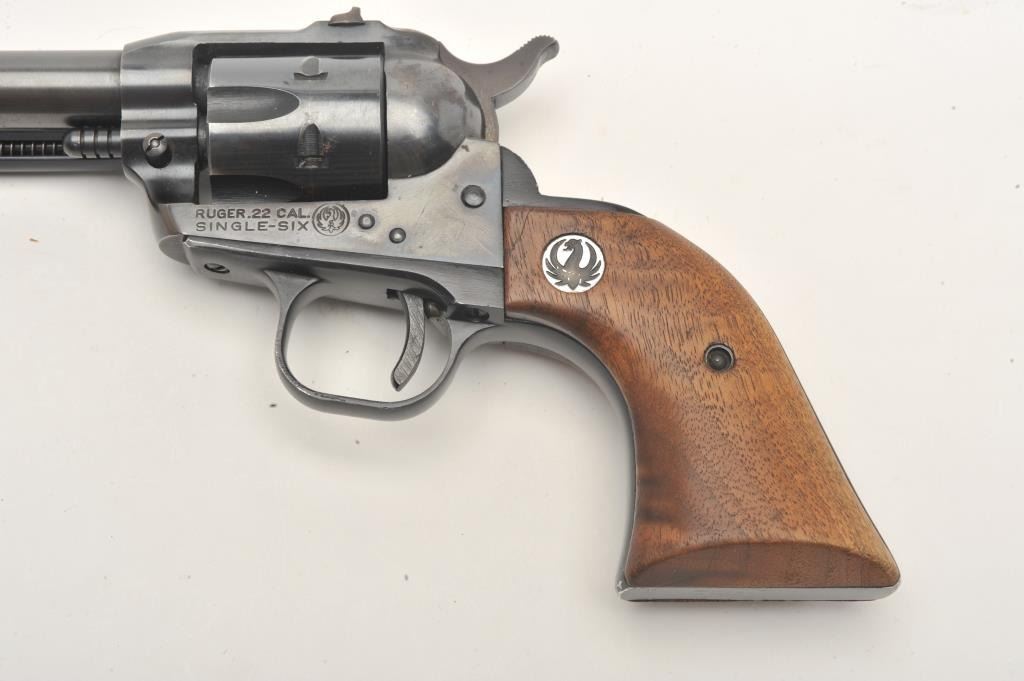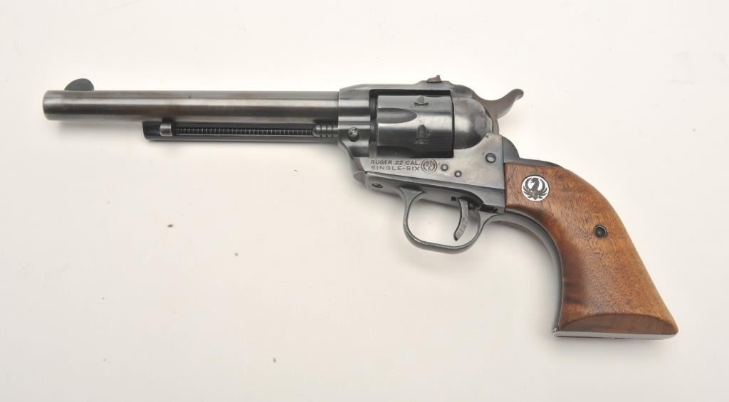 Ruger Single-Six revolver, .22 caliber, 6.5” barrel, blued finish, wood medallion grips, S/N D504394, in overall very good + condition showing the majority of its original blued finish, crisp action and markings, very goodbore and very good + grips. (Modern/No PPT). Est.: $125-$250.