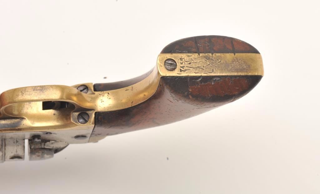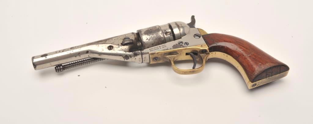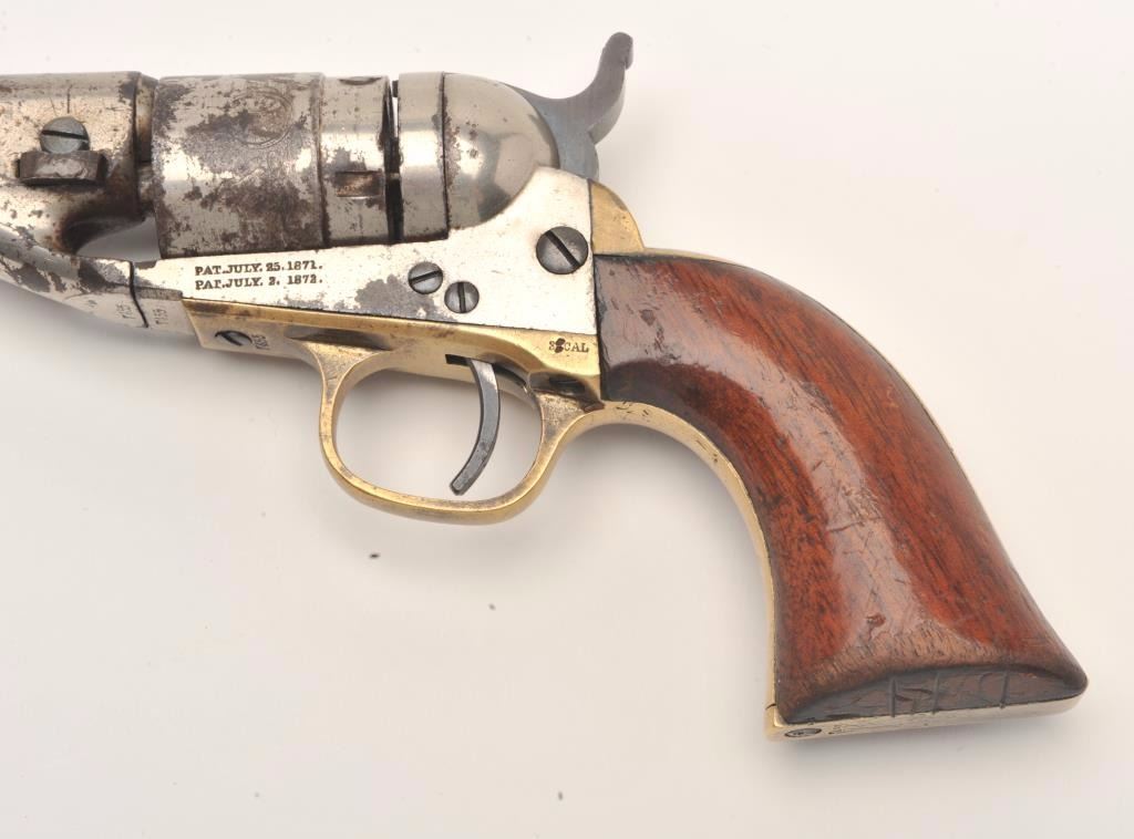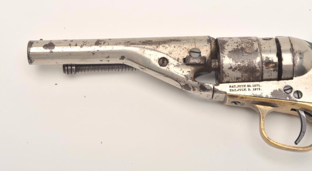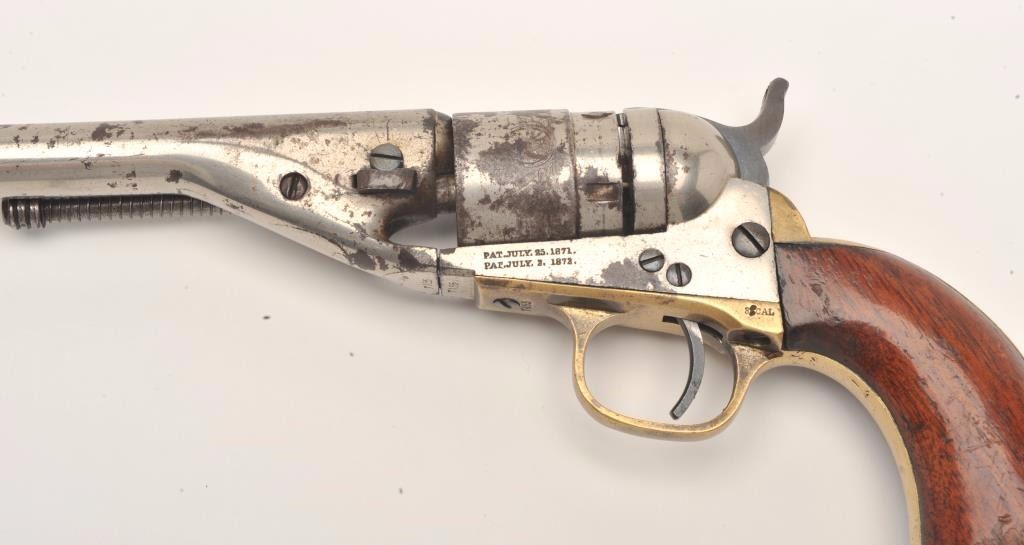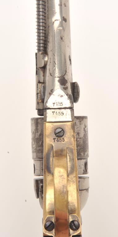 Colt Pocket conversion revolver, .38 RF caliber, 4.5” barrel, nickel finish, wood grips, S/N 7455, in overall good condition showing considerable original nickel finish, matching visible S/Ns, majority of originalcylinder scene remaining, action working but timing is off, front part of ejector rod housing missing, very good grips. (Antique). Est.: $400-$800.