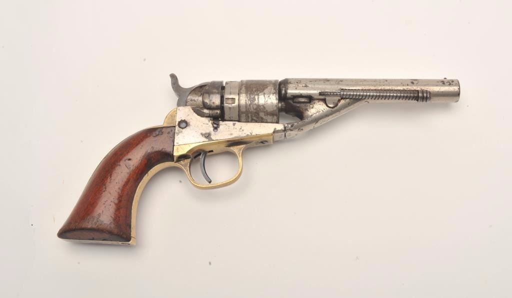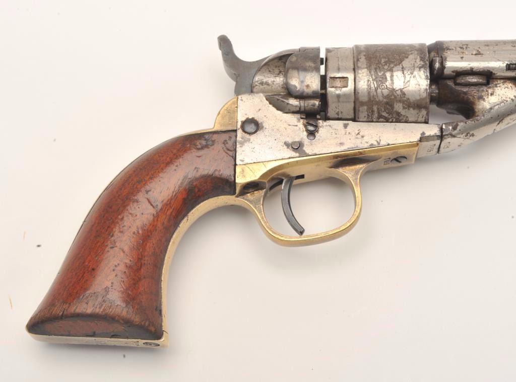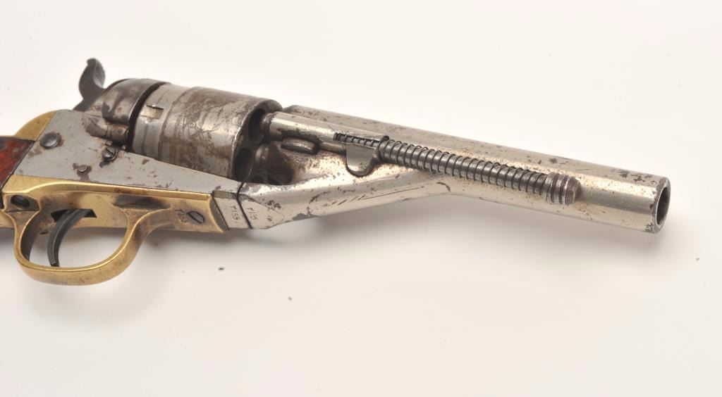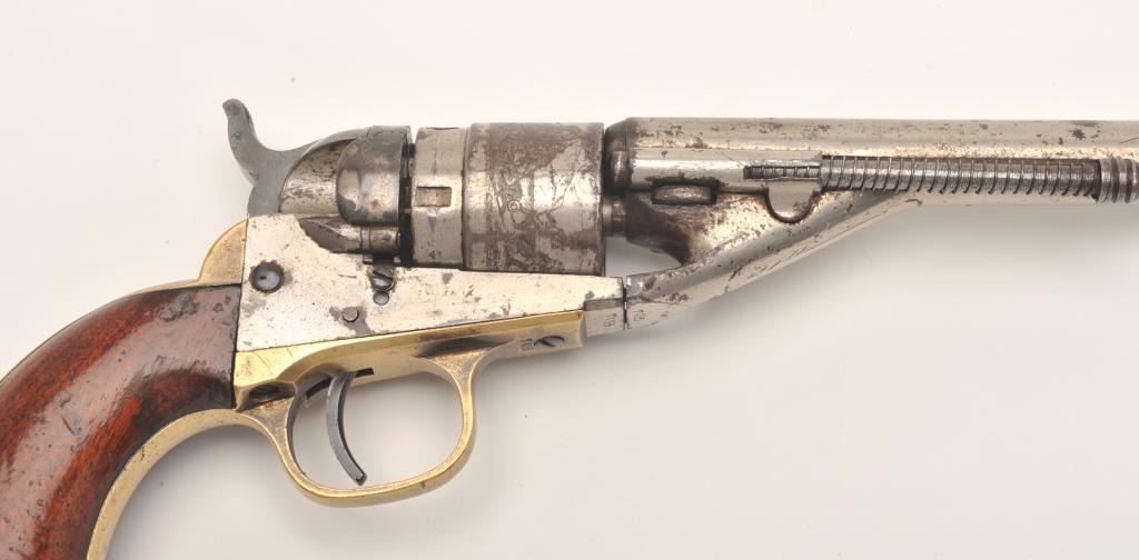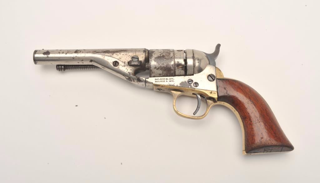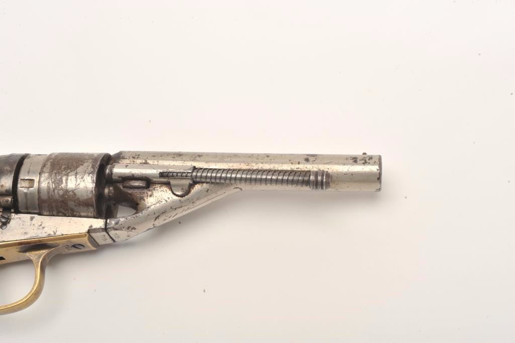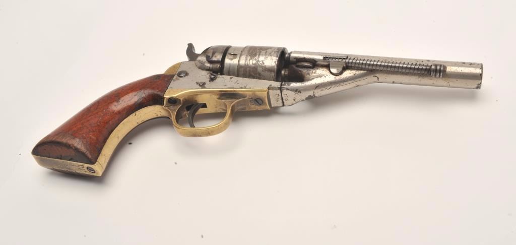 Lot 399 Colt Pocket conversion revolver, .38 RF caliber, 4.5” barrel, nickel finish, wood grips, S/N 7455,