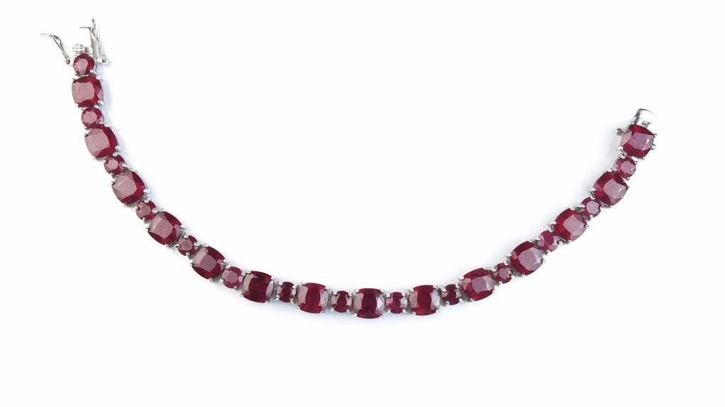 Nice ladies bracelet set with 28 intense red Rubies weighing approx. 15.00 carats set in sterling silver. Estimates $1,000-$1,500 Nice