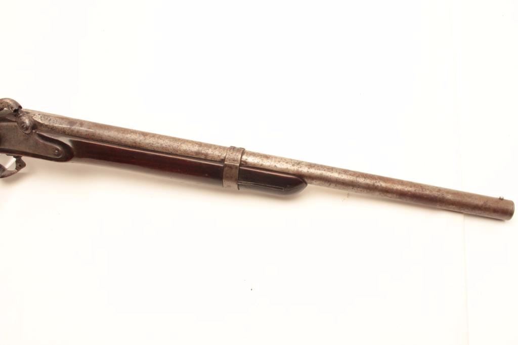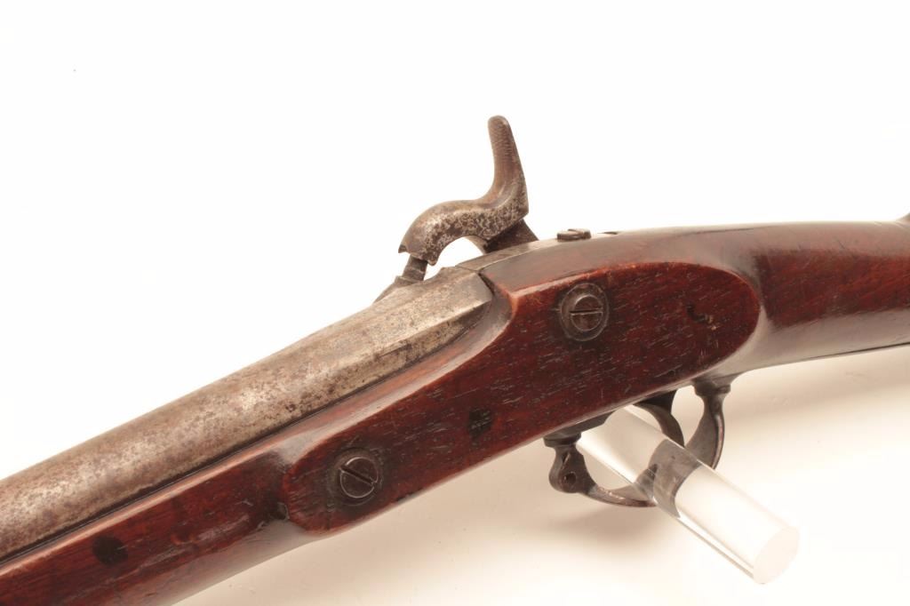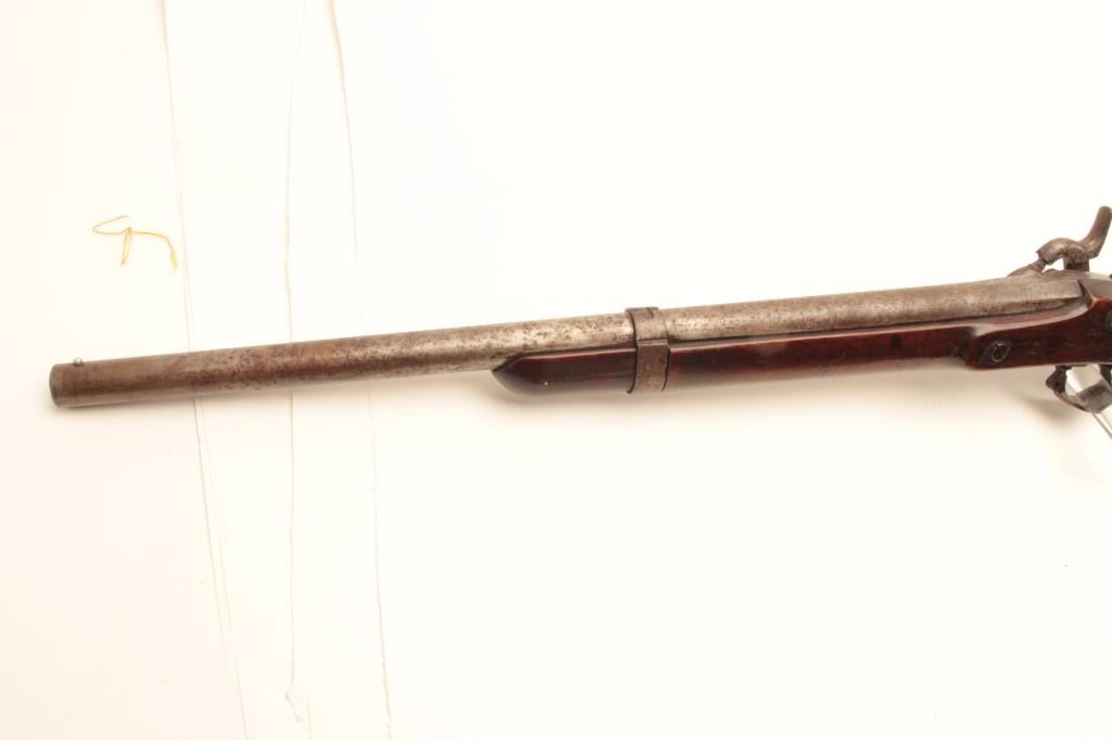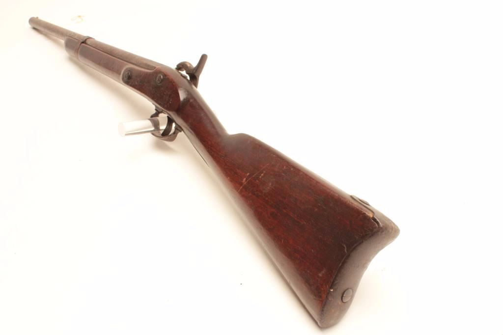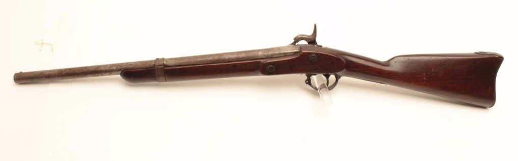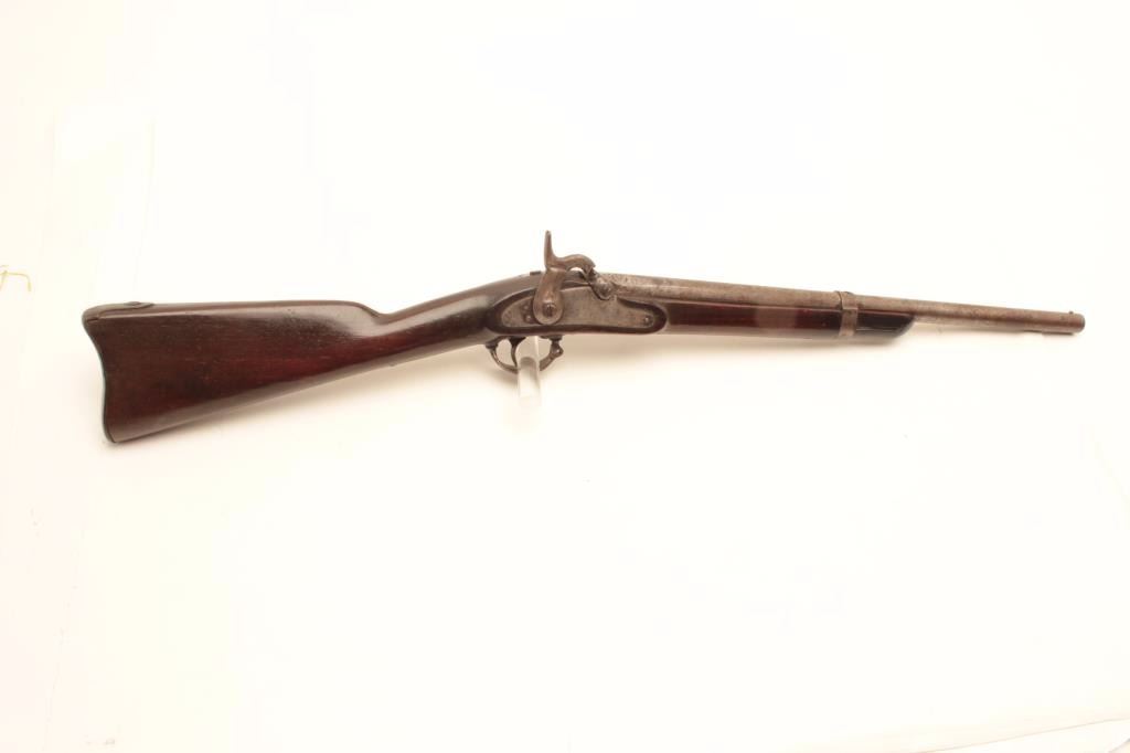 1861 Springfield percussion rifle, .62 caliber, Serial #NSNV. The rifle is in fair overall condition with the barrel having been cut down to 22” in length and a steel bead front sight added. The barrel and receiverhave both taken on a grey patina spotted with areas of light to moderate surface rust and the rear sight has been removed. The side plate is US marked and dated 1861. The smooth wood stock is in good condition having an old coat of varnish added and a smooth steel crescent butt plate. A nice Civil War era Springfield cut down to carbine length. Est.: $300-$625. (Antique).