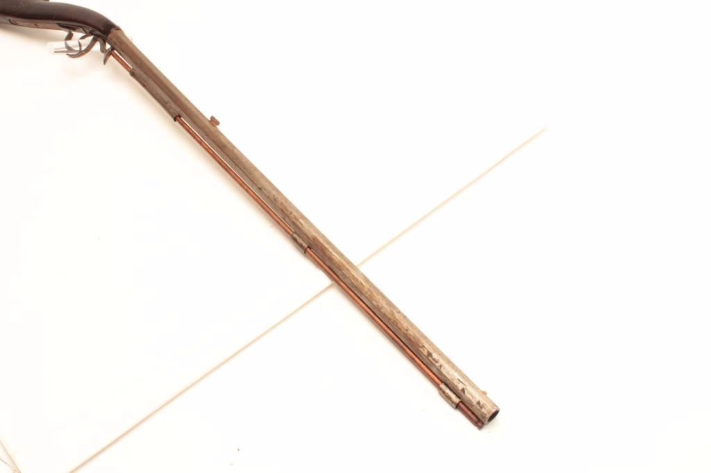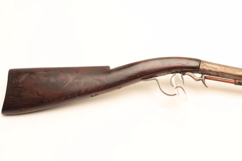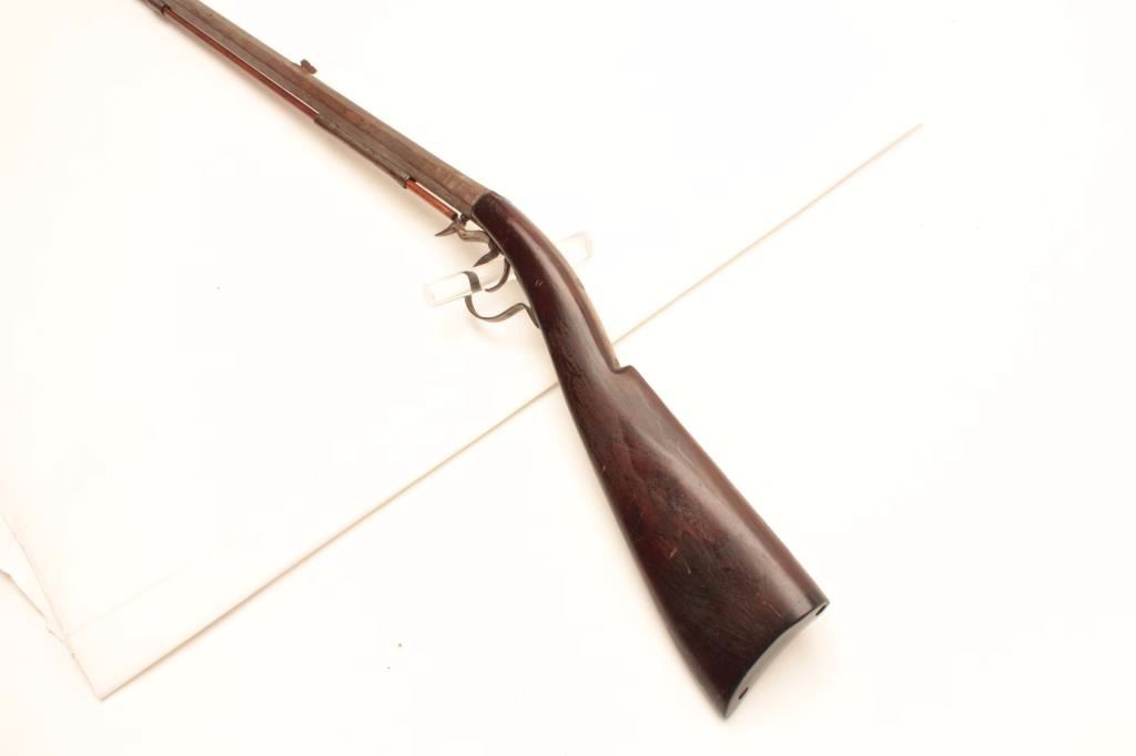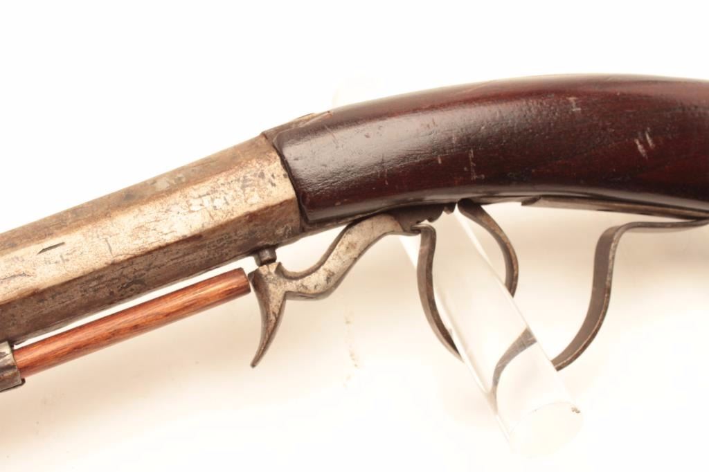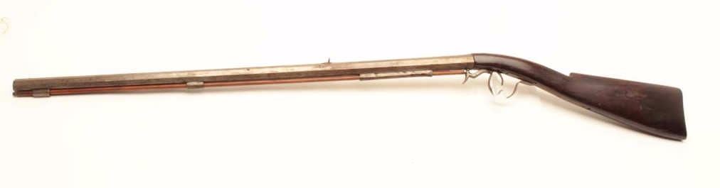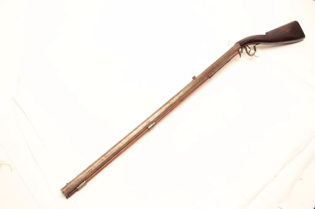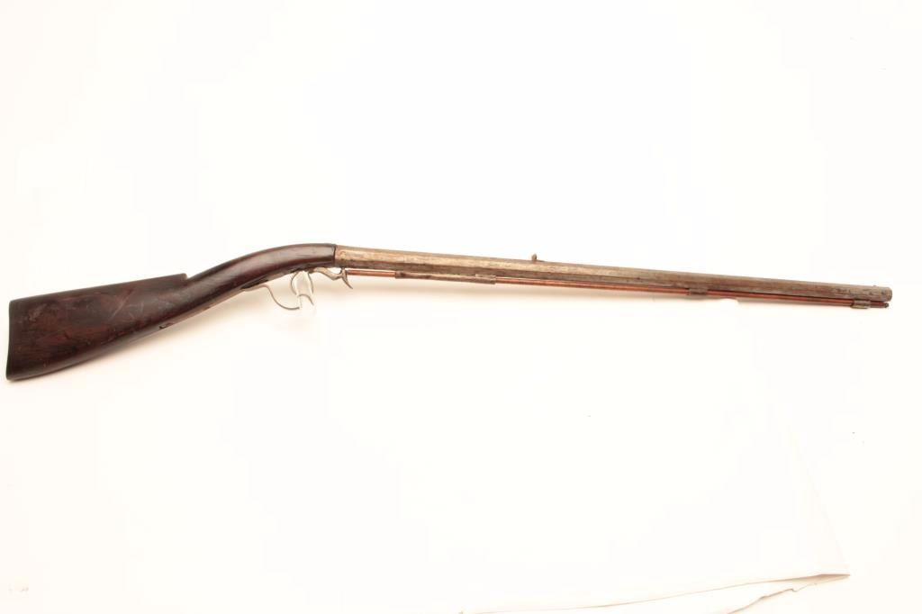Under Hammer percussion rifle, approximately .62 caliber, Serial #NSNV. The rifle is in good overall condition with a 31 ½” octagon barrel. The barrel show significant wear and use having turned to a silver/grey patinawith numerous mars from carry and use. The rifle was manufactured 1860-1880 and is not signed. The smooth wood stock is in good condition with mars, compressions and a later replacement plastic butt plate. The rifleincludes a later, replacement full-length wooden ram rod. Est.: $375-$750. (Antique).