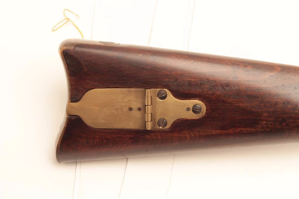 Antonio Zoli reproduction percussion Zouave rifle, .58 caliber, Serial #16990. The rifle is in good overall condition with a 33” barrel. The barrel is a brown patina while the side plate is brightly case colored. The smooth wood stock is in good condition with small mars and compressions and the butt features a brass patch box. The butt stock includes sling swivels and ends with a smooth, brass crescent butt plate. Est.:$375-$700.