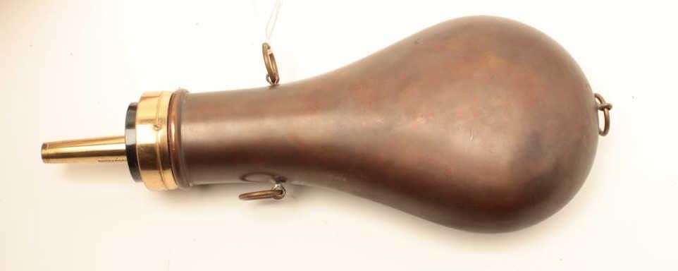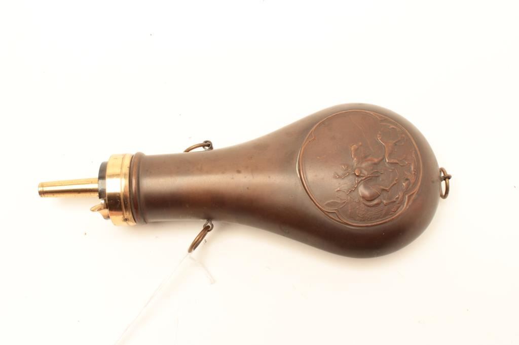Brass rifle flask with embossed horse, rider and hunting dog, approximately 8” overall and in very good condition. Est.: $175-$350.