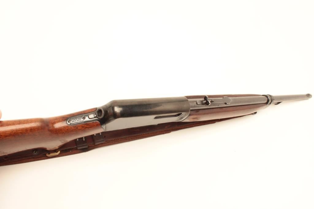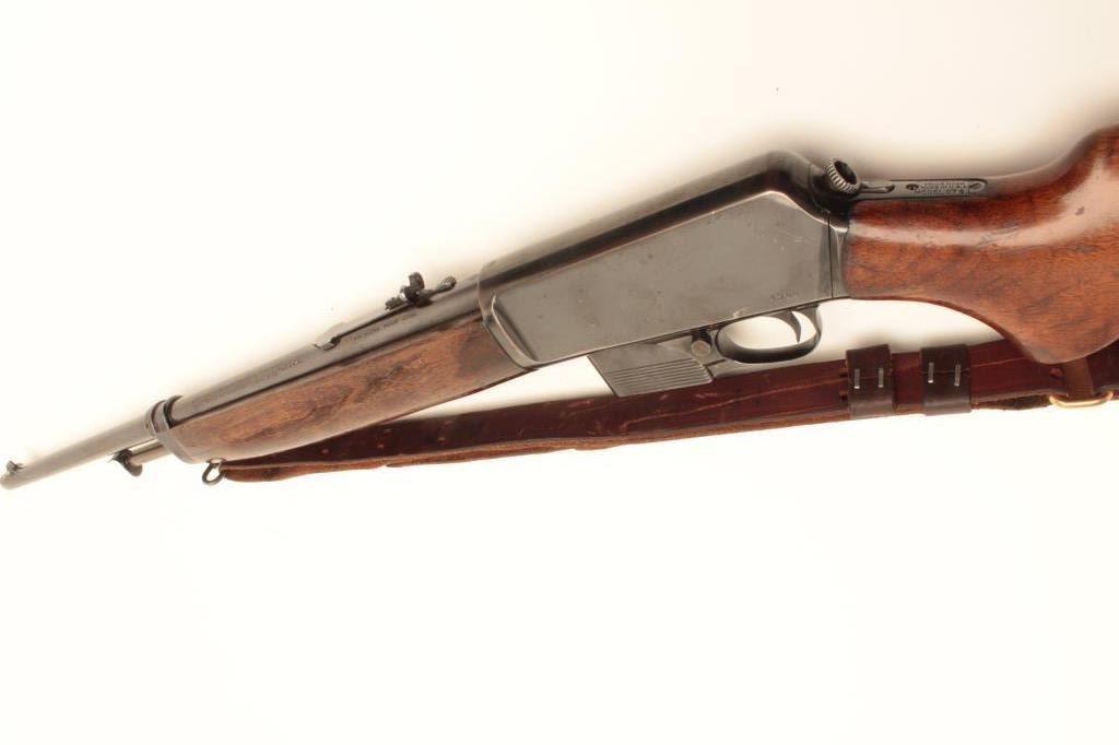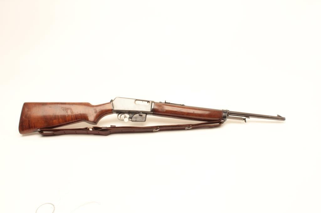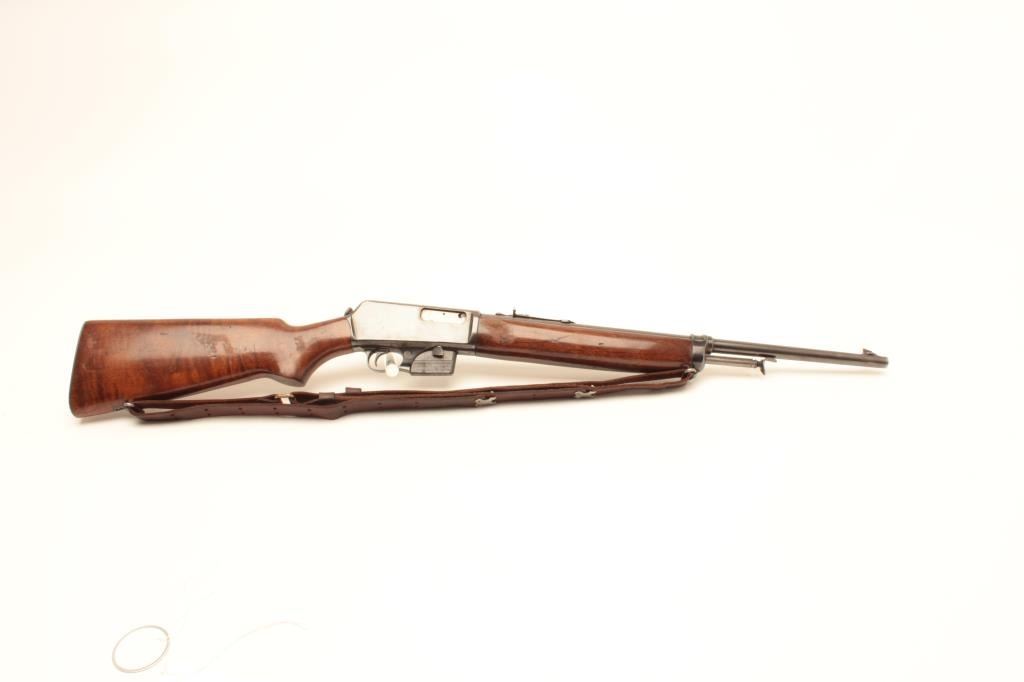 Winchester Model 07 S.L. semi-automatic rifle, .351 caliber, 20” barrel, blued finish, wood stocks, leather sling, S/N 49588, in overall good to very good condition showing the majority of its original bluedfinish, very good + bore, crisp action and markings, wood stocks show losses and damage to finish with scattered mars and scratches including a damaged area to the rear right side of the forend. (C&R/No PPT).Est.: $250-$500.