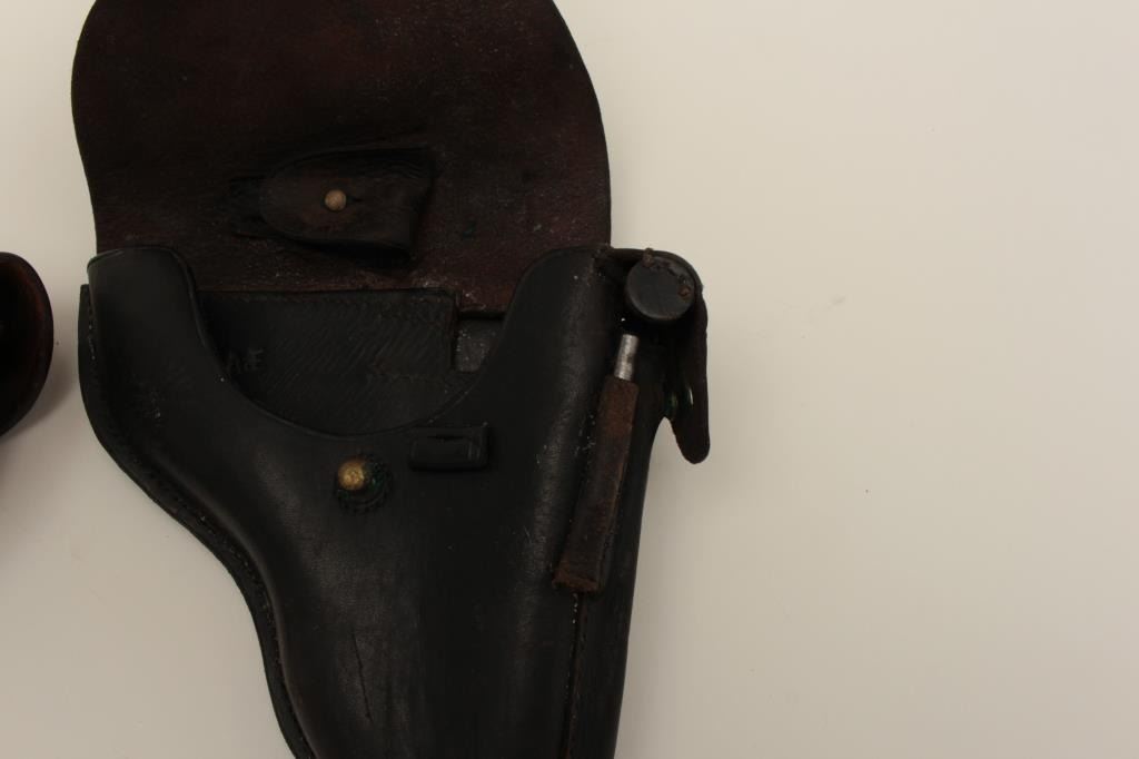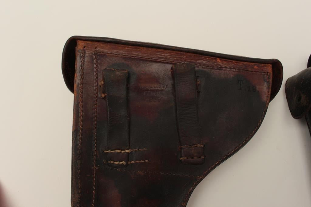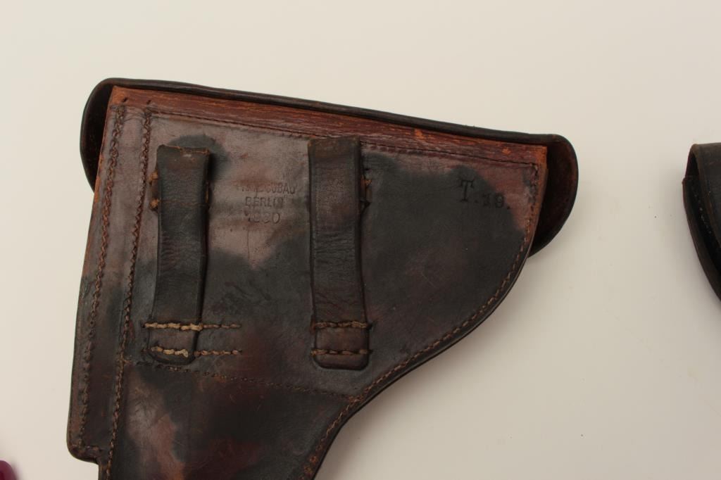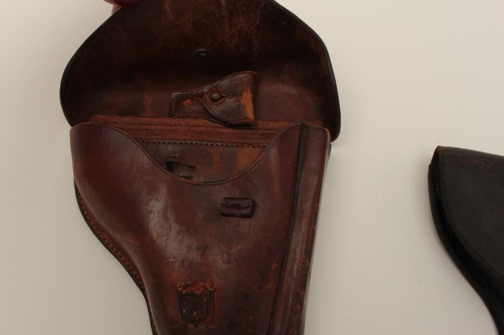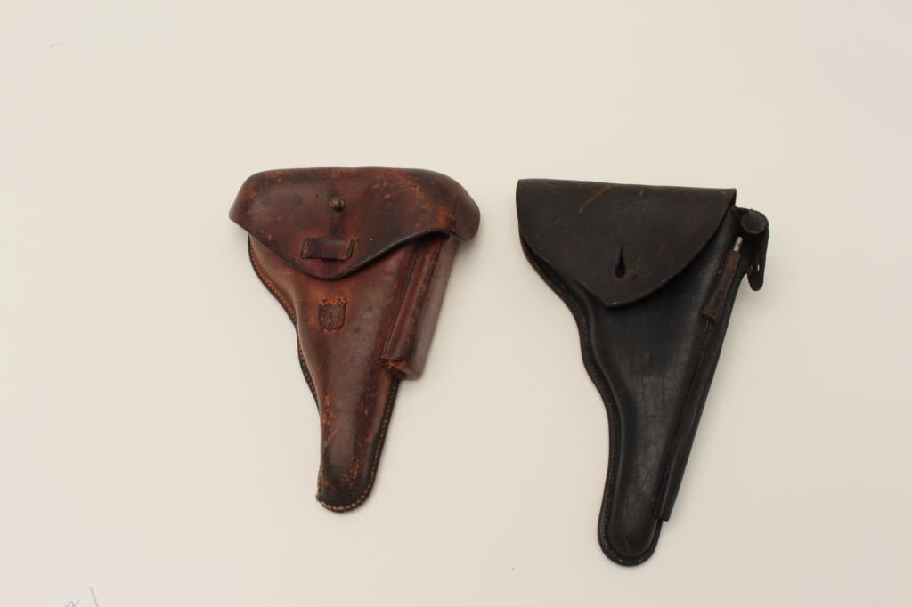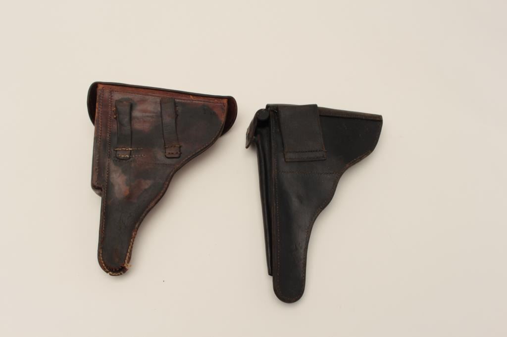 Two leather flap holsters for Luger semi-automatic pistols, one black, one brown. Est.: $200-$400.
