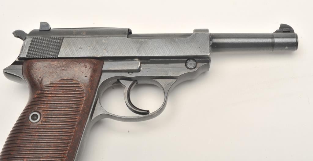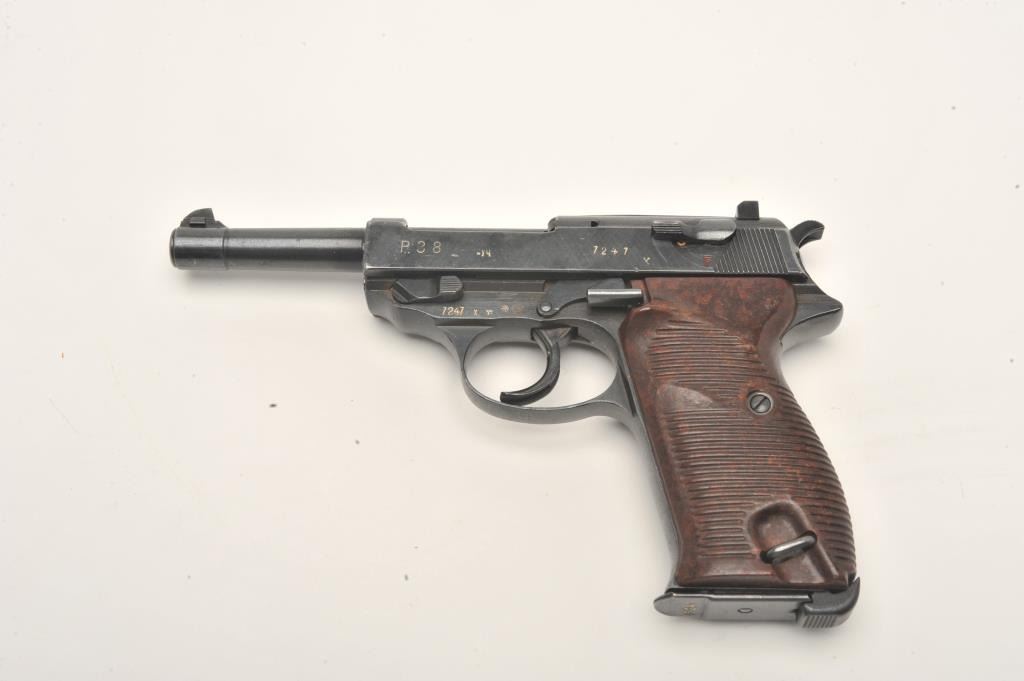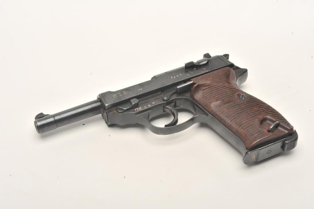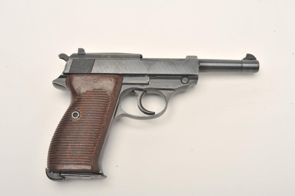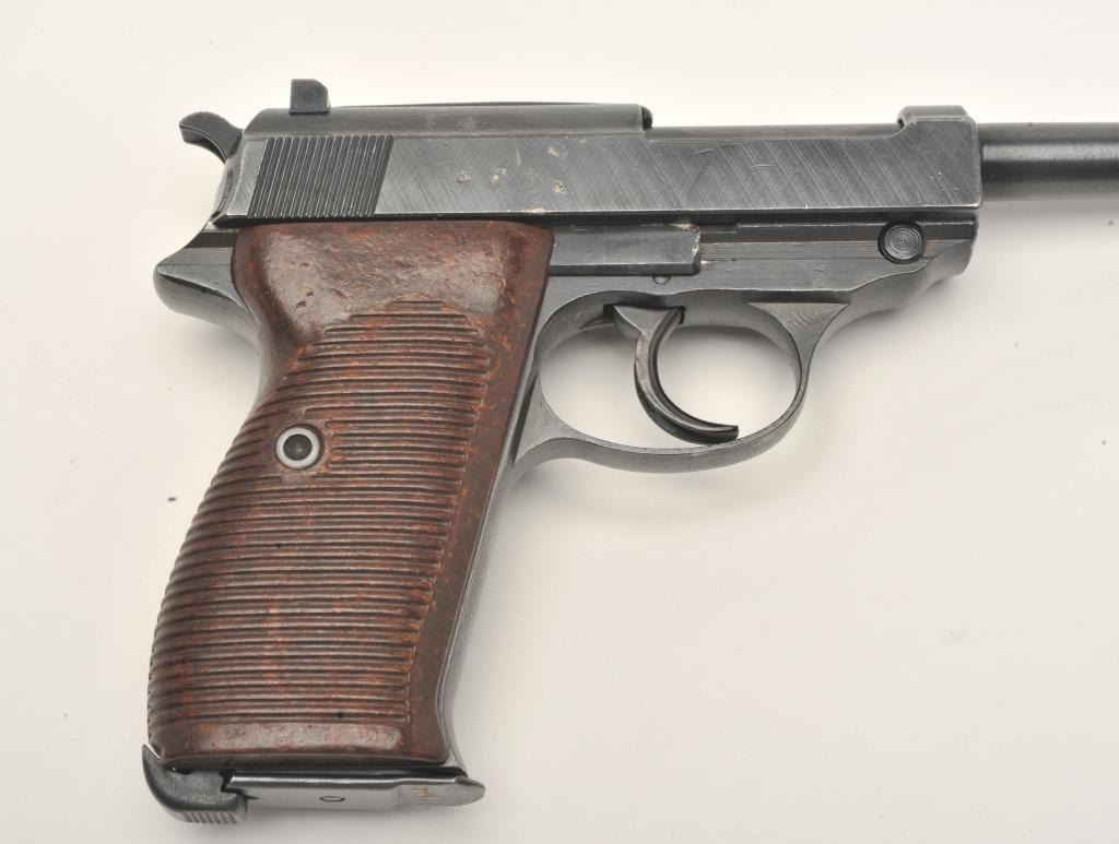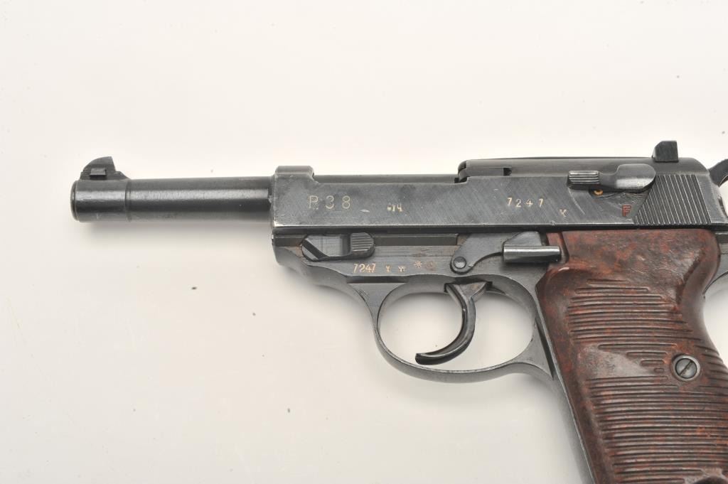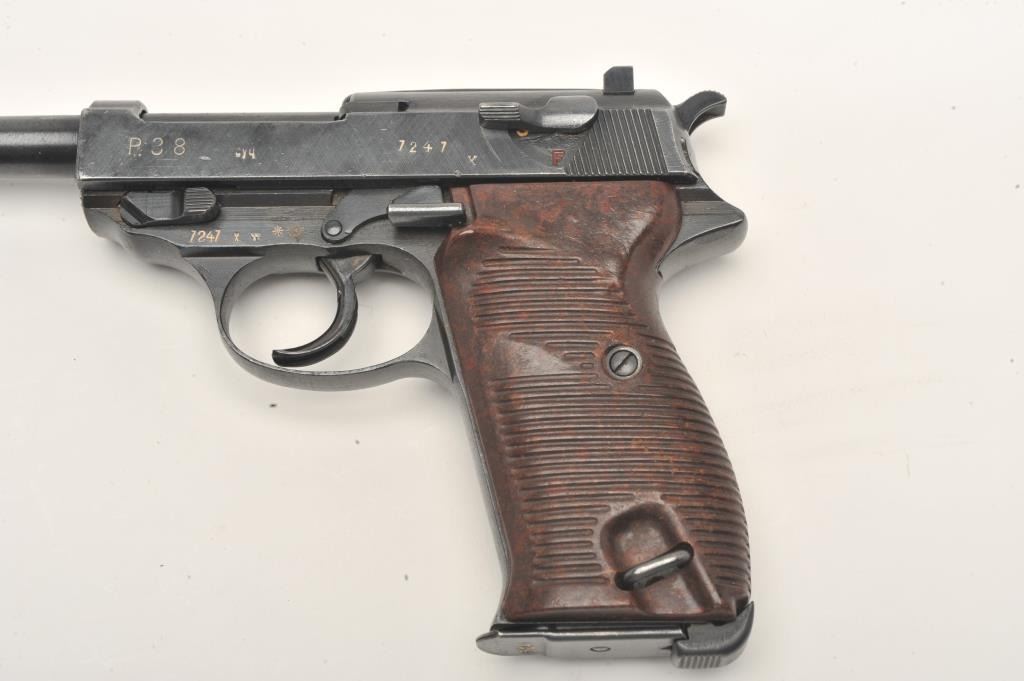 P-38 semi-automatic pistol, “cyq” marked, 9mm caliber, 5” barrel, military finish, maroon grips, S/N 7247X (matching visible #s including magazine), in overall excellent condition. (C&R/PPT). Est.:$300-$600.
