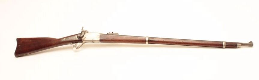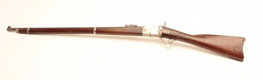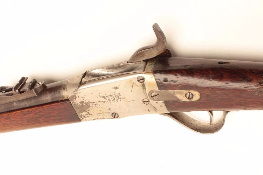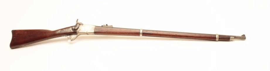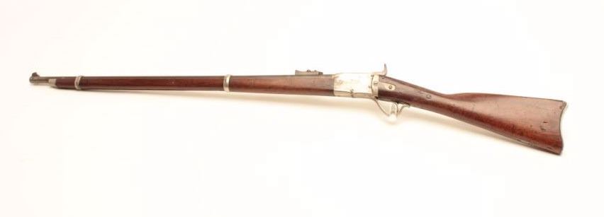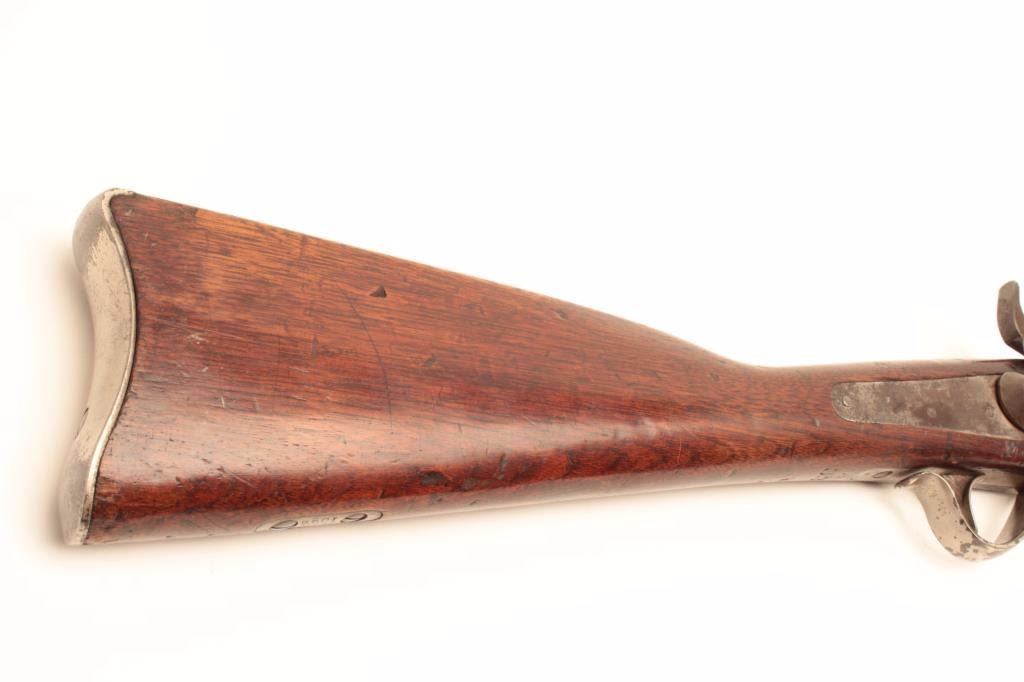 Turkish Peabody-Martini single shot rifle, .45 caliber, Serial #NSNV. The rifle is in good overall condition with a 32” barrel with a ramped blade front and military tangent style rear sights. The barrel retains asignificant amount of its blue finish with the ramrod missing. The receiver retains the majority of its flaking nickel finish. The Receiver is marked Peabody Patent, Providence Tool Co., Providence, R.I. Manufactured for the Turks and used during the Russo-Turkish war of 1877-1878, over 600,000 of the rifles were built by the Providence Tool Co., which held the Peabody patent. The rifle has Turkish proofs forward the front ring. Thesmooth wood stock is in good condition with mars and compressions. The stock features several cartouches and ends with a smooth, steel butt plate. The bore is fair, the action crisp and markings are legible. TheTurkish rifle was chambered in its own unique cartridge, the 11.3 x 59R or “.45 Turkish”. From the estate of Larry Gaertner. Est.: $350-$700. (Antique)