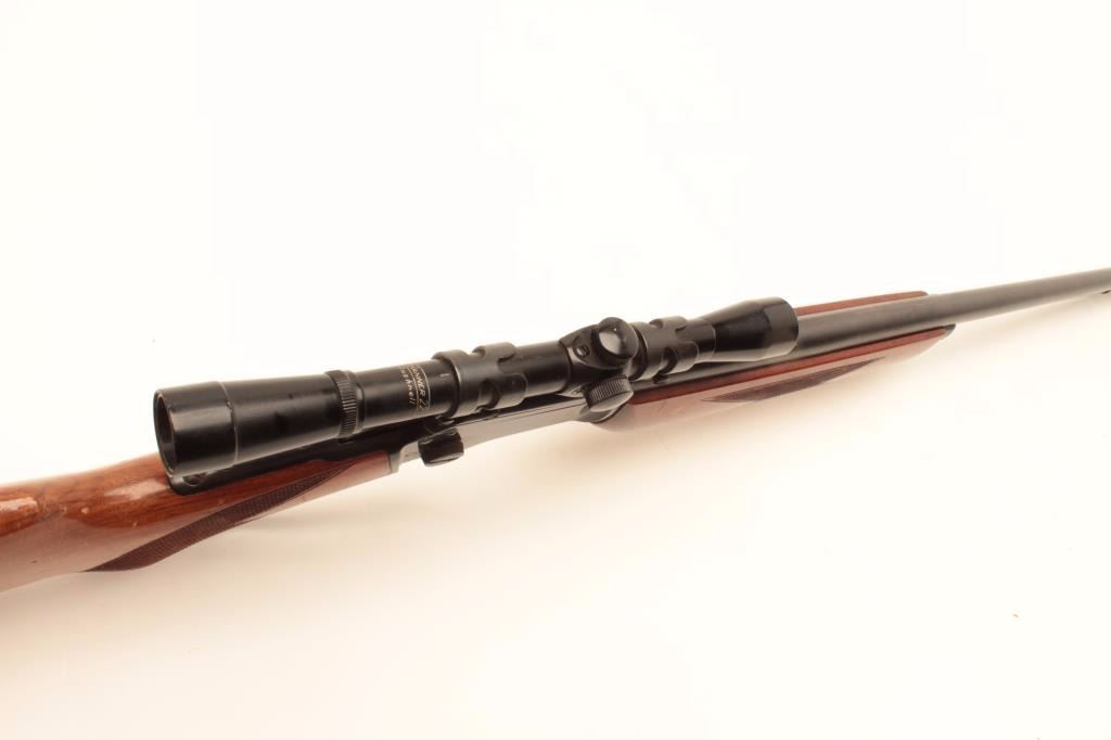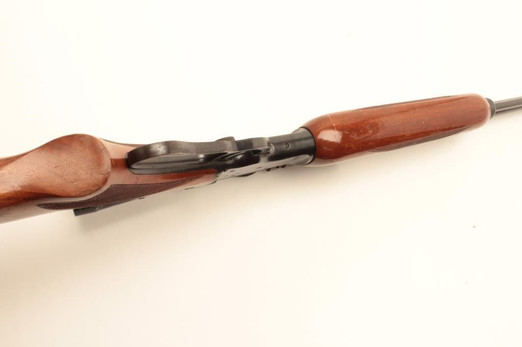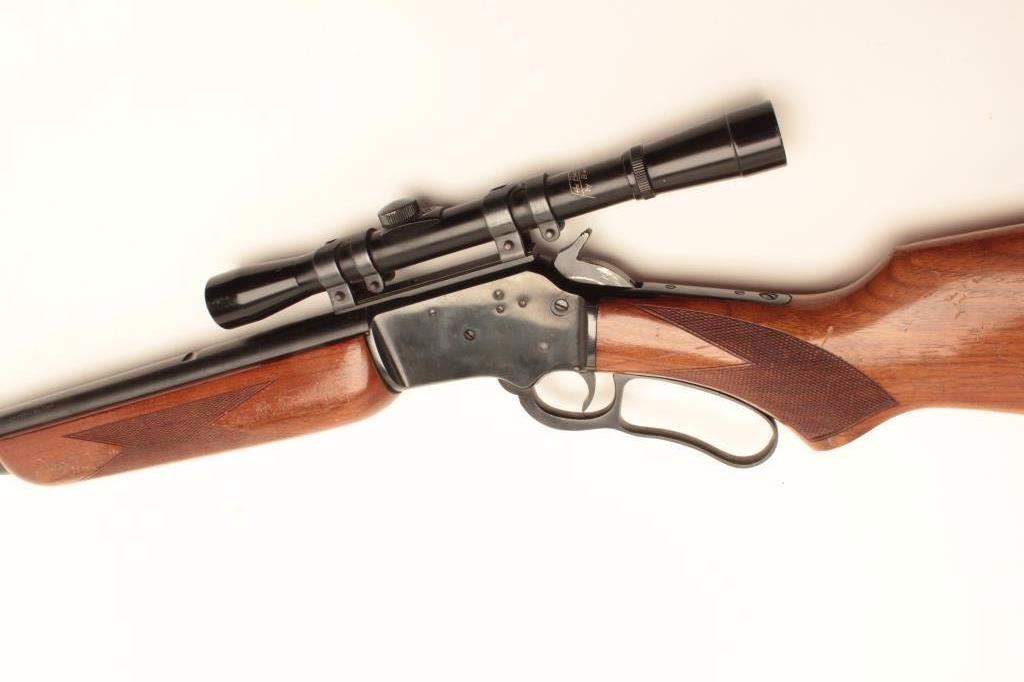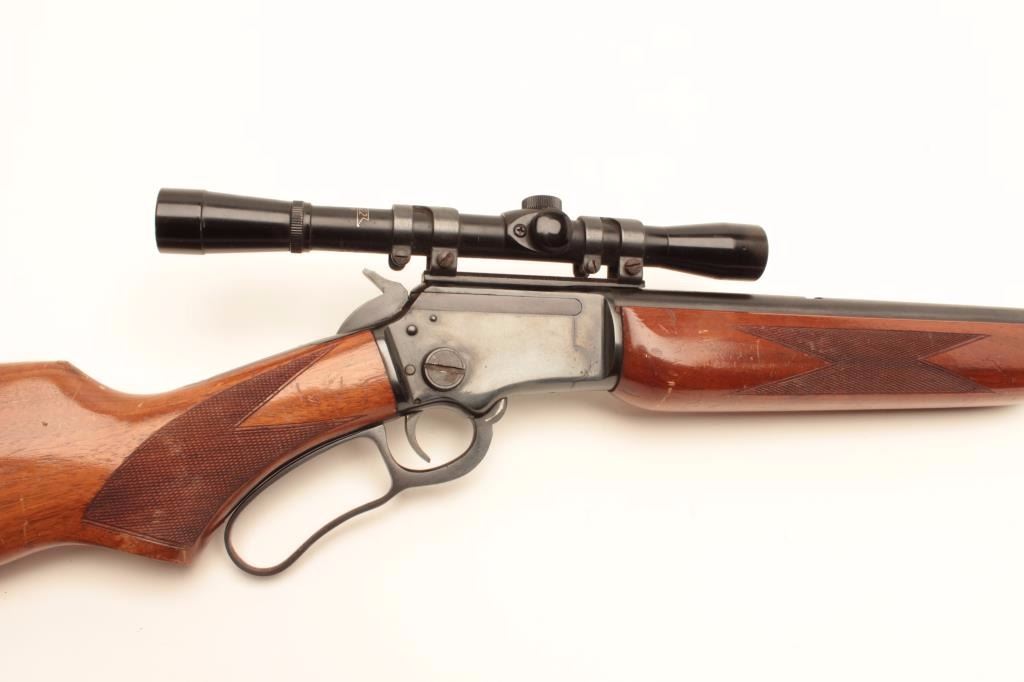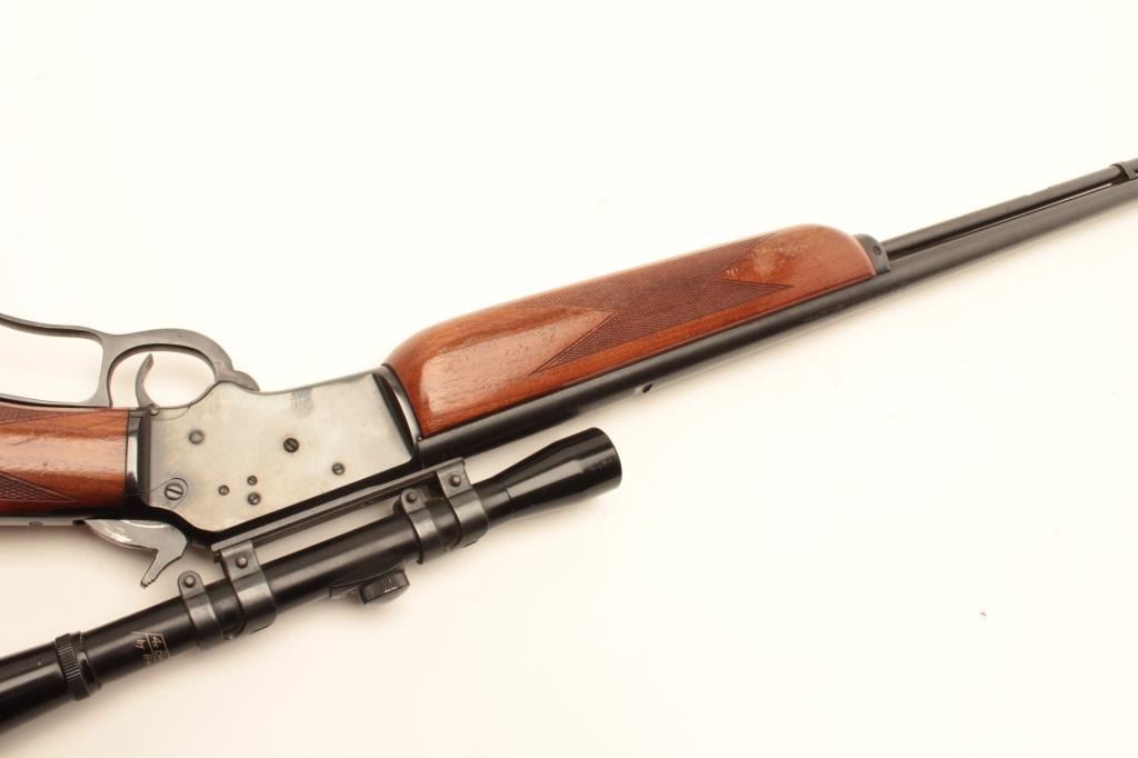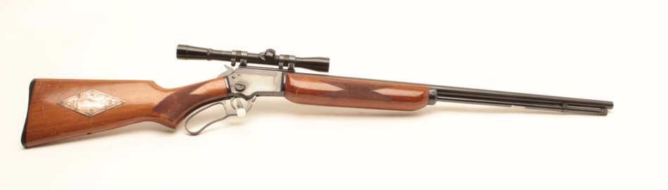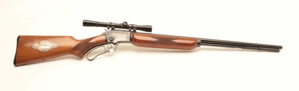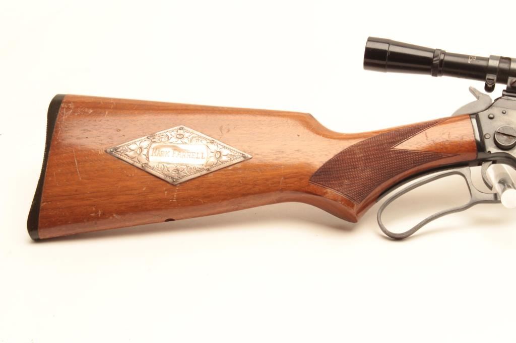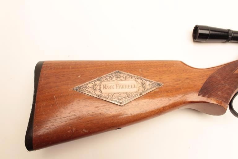 Marlin Model 39-A lever action rifle, .22 short, long or LR caliber, 24” round barrel, blued finish, checkered wood stocks with silver engraved inset into right side of butt stock showing floral design and the name“MARK FARRELL”, S/N D22385, mounted with a Bushnell Banner .22 4X scope with sharp optics. Rifle is in overall very good + condition displaying the majority of its original blued finish, very good bore, crispaction, sharp markings and good wood showing wear and some scattered mars and scratches from carry and storage. Tag from consignor notes “This Marlin Model 39A belonged to Tommy Farrell, Cowboy Movie Actor”.(Modern/No PPT). Est.: $350-$700.