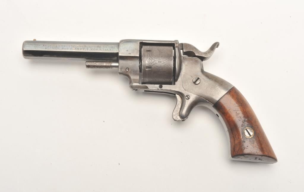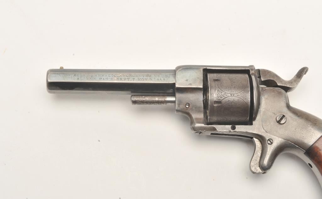 Allen & Wheelock spur trigger revolver, .22 caliber, 3” octagon barrel, blued finish, wood grips, S/N 492, in overall good condition with areas of original blue remaining on barrel and front of frame;action needs work, majority of cylinder scene remains; good grips. (Antique). Est.: $250-$500.