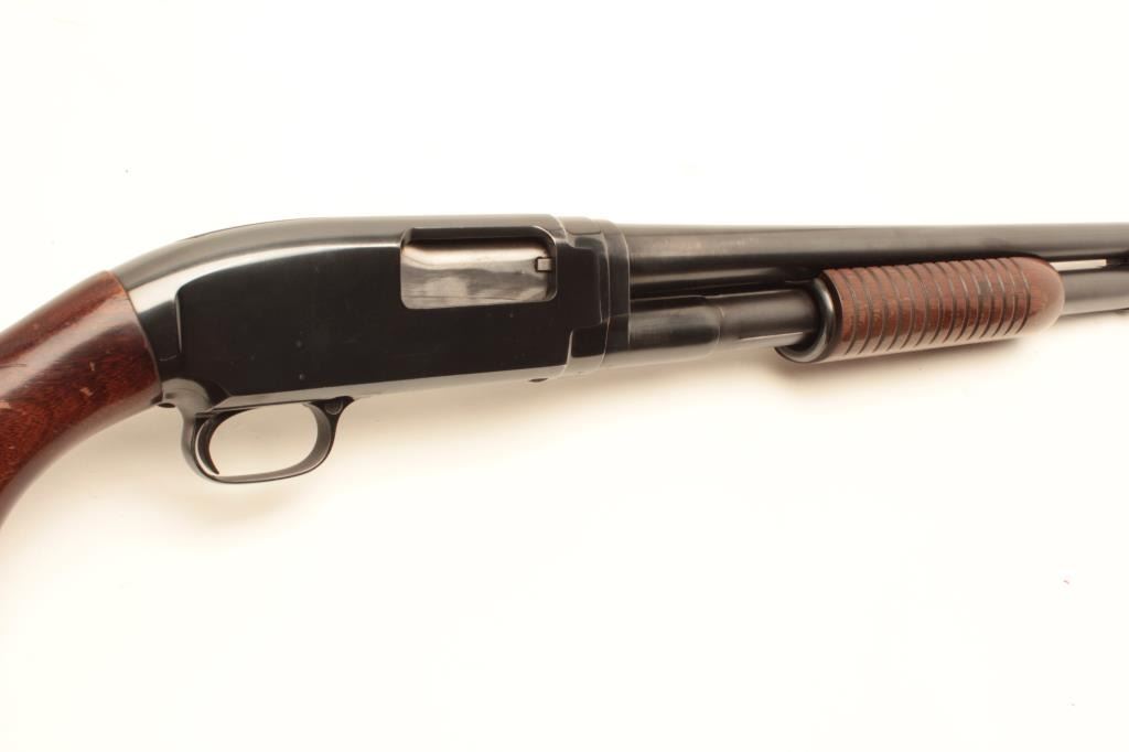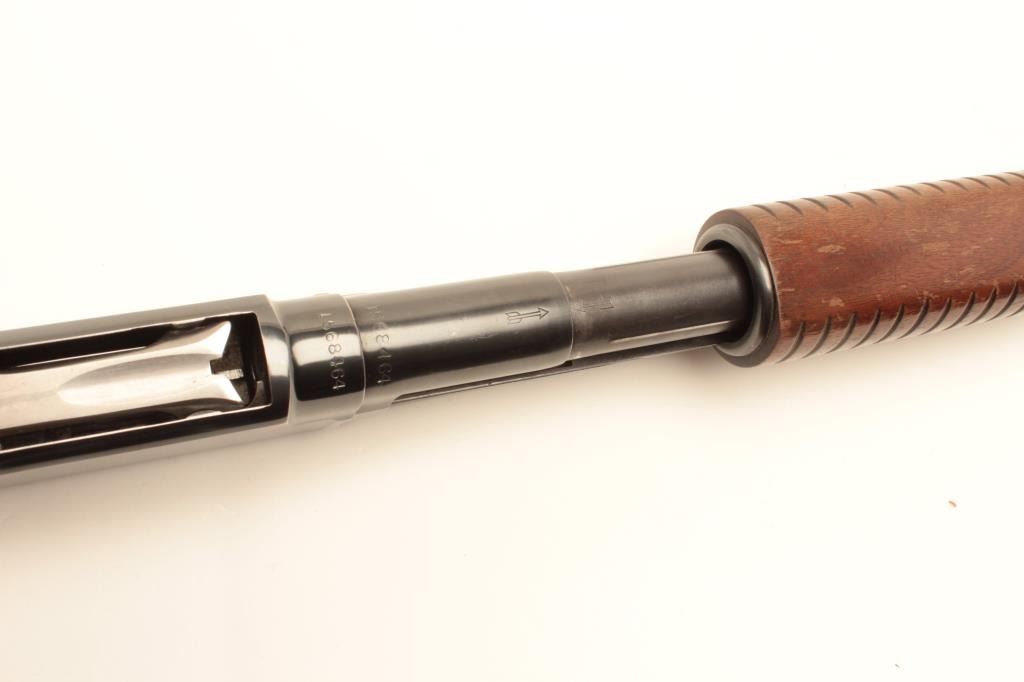 Winchester Model 12 pump action takedown shotgun, 12 gauge, 28” barrel, blued finish, wood stocks, S/N 1568464, in overall very good condition showing the majority of its original blue, very good bore, crisp actionand markings, good stocks with scattered mars and scratches to butt stock from carry and storage. (Modern/No PPT). Est.: $250-$500.