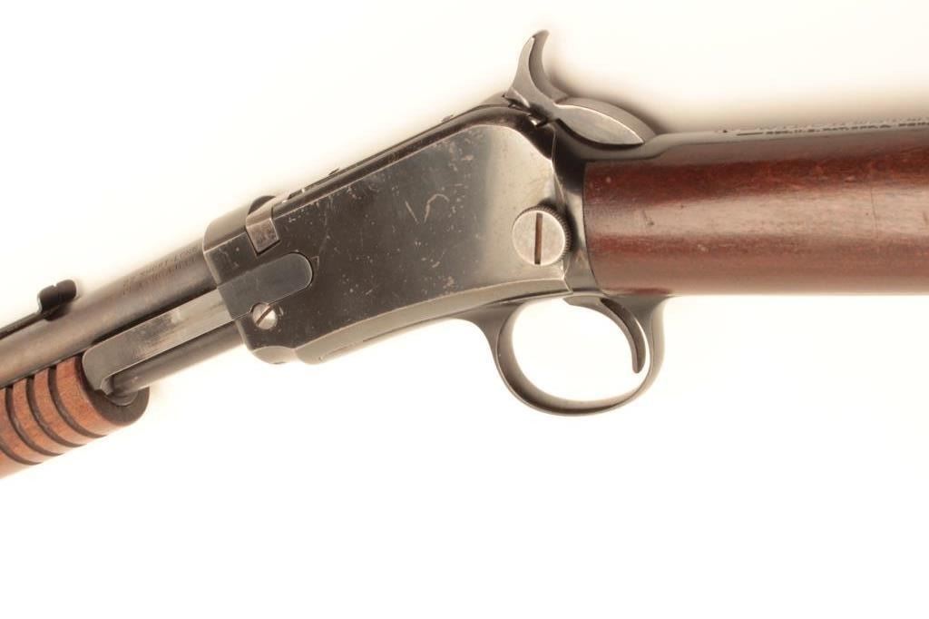 Winchester Model 1906 pump action rifle, .22 short, long or LR caliber, 20” round barrel, blued finish, wood stocks, S/N 574172, in overall very good + condition displaying considerable original blued finish, very good bore, crisp action and markings, very good wood with some scattered mars and scratches to butt stock from storage and handling. (C&R/No PPT). Est.: $275-$550.