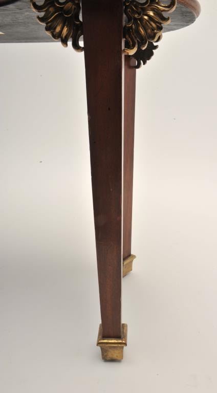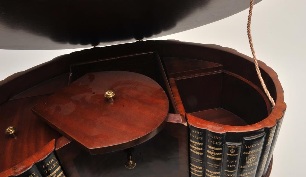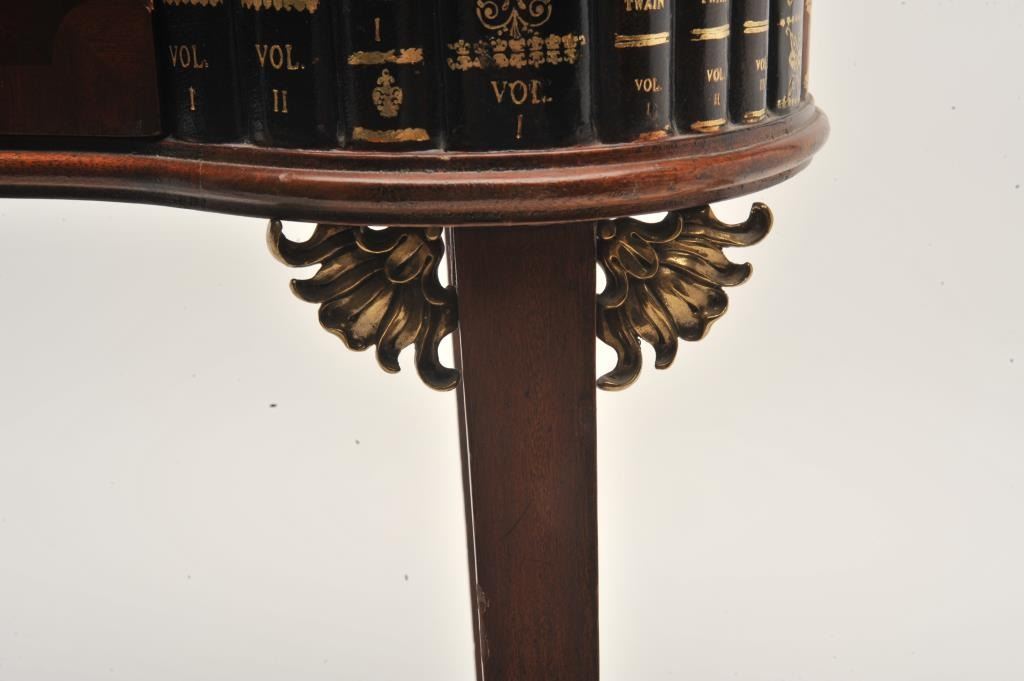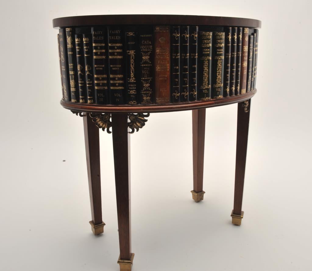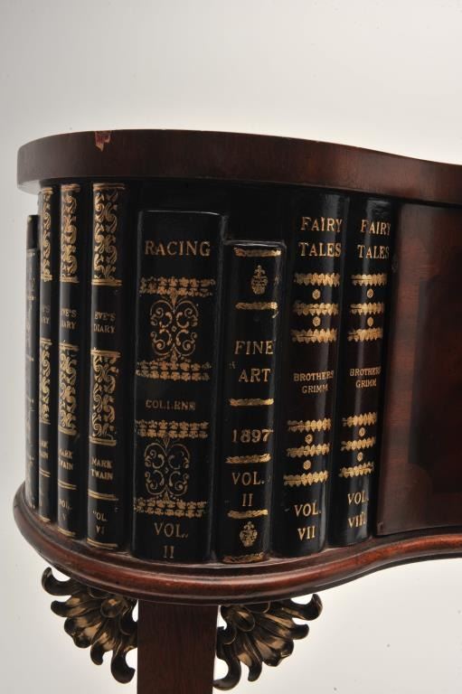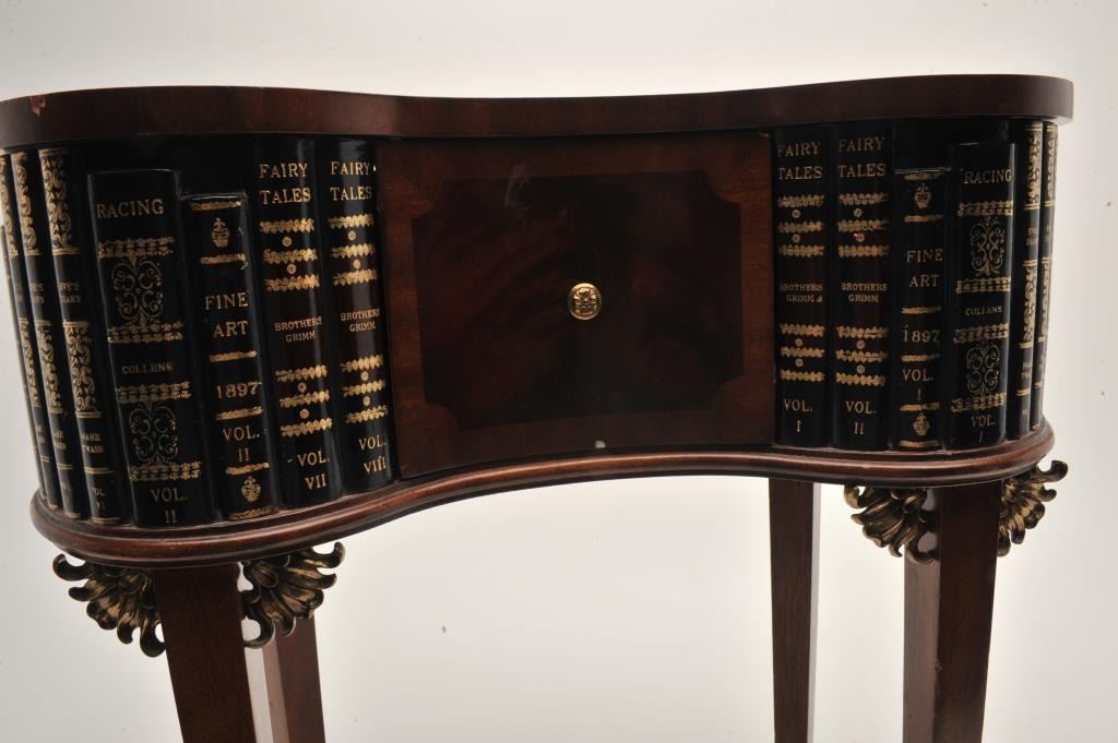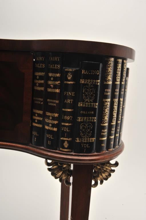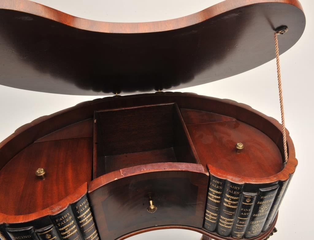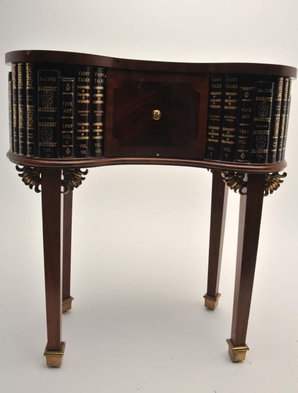 Modern Maitland Smith library table, approximately 25” in height, 24” wide and 14” deep with pull out center drawer, lift table top that exposes two covered compartments; very good condition. Est.: $50-$100.