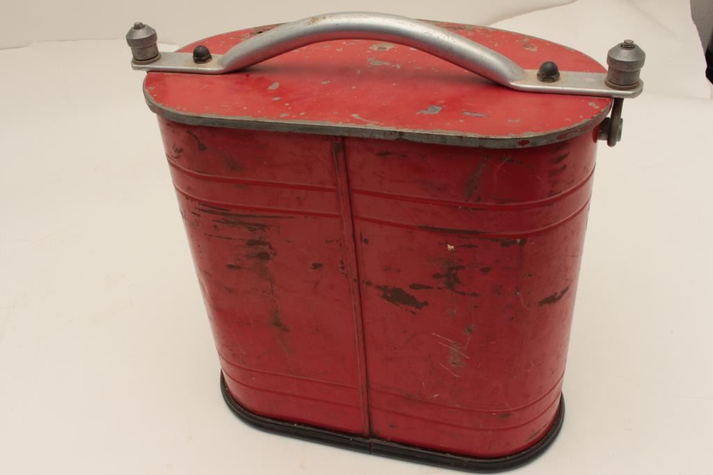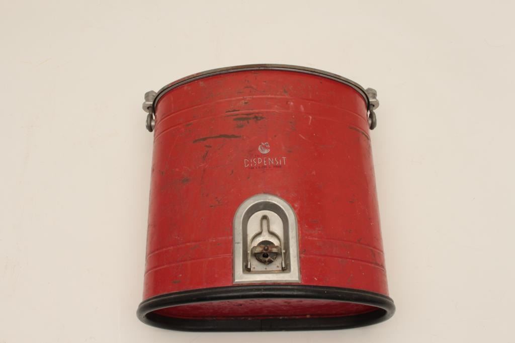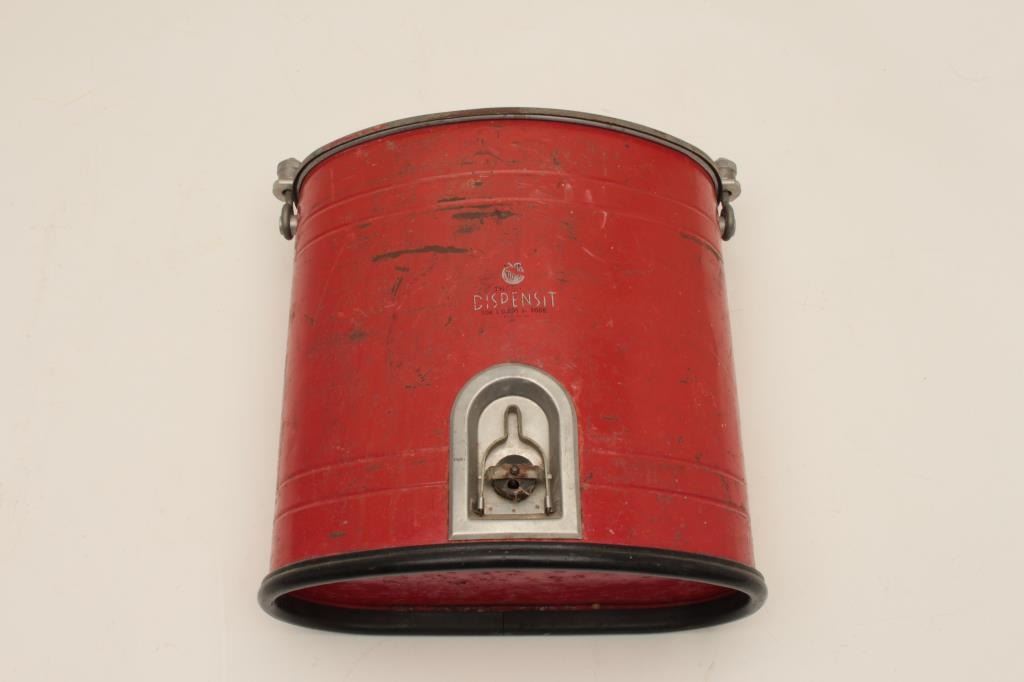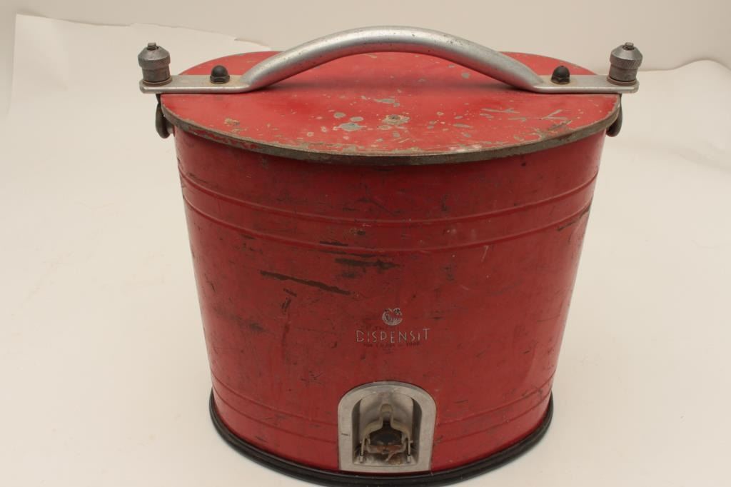 Vintage “Dispensit” brand metal ice chest/cooler (ca. 1950’s); approximately 15” in height, 16” wide and 8” deep; overall good condition with lots of original paint remaining. Est.: $100-$200.